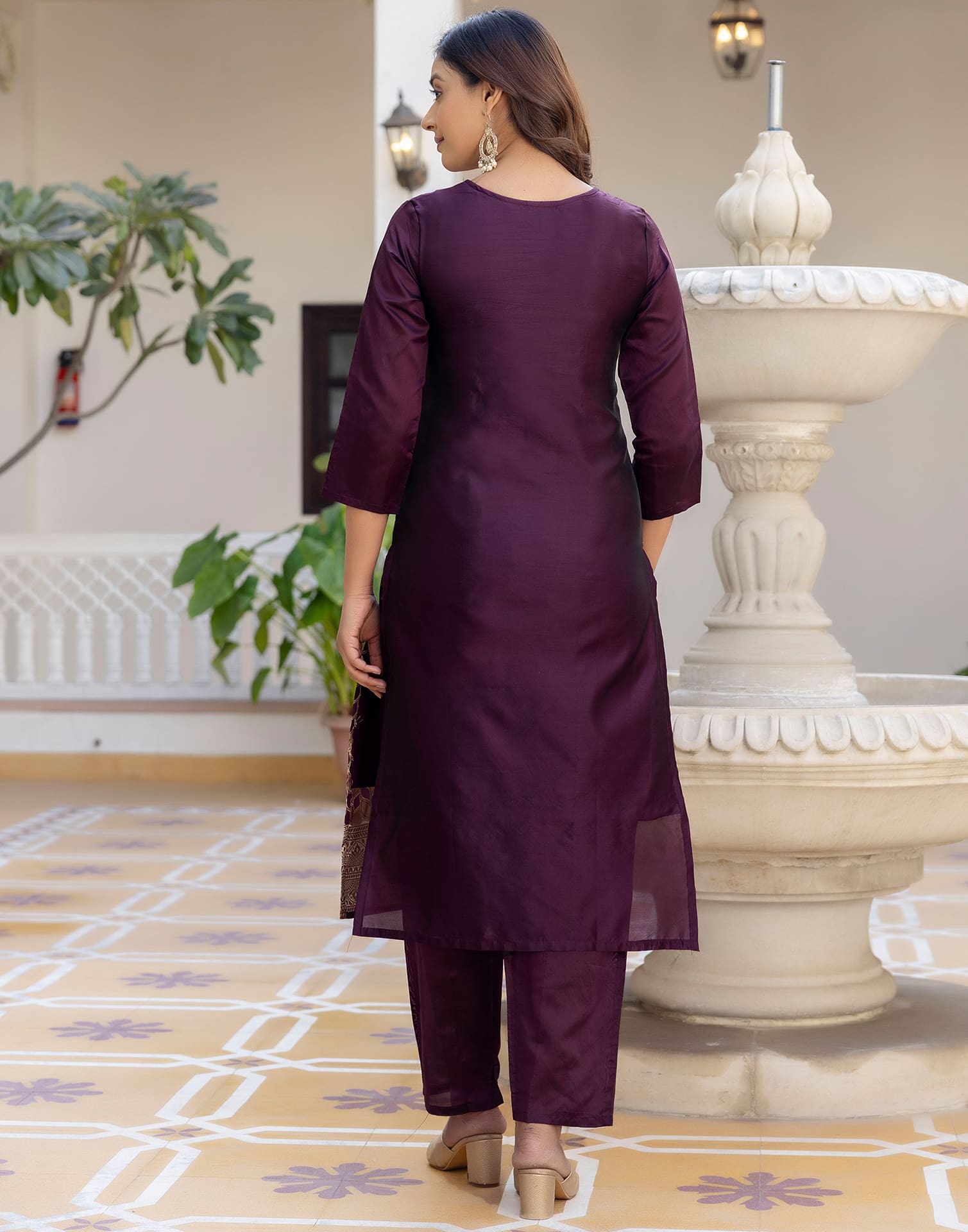 Experience the beauty of tradition with this Purple Silk Blend kurta set. Adorned with Printed and styled with a Round Neck, the kurta exudes sophistication. Complemented with Pant and an elegant dupatta, this complete outfit is ideal for Traditional Occasion Outfit. Crafted in India with lightweight fabric, it ensures comfortable wear and effortless elegance. Elegant Dupatta, Semi-formal Wear, Made in India.