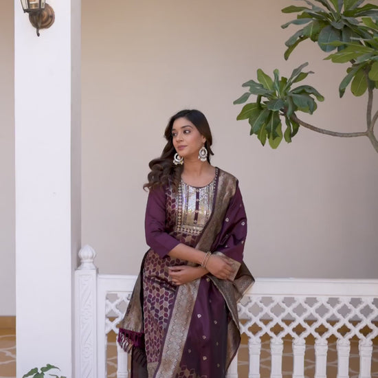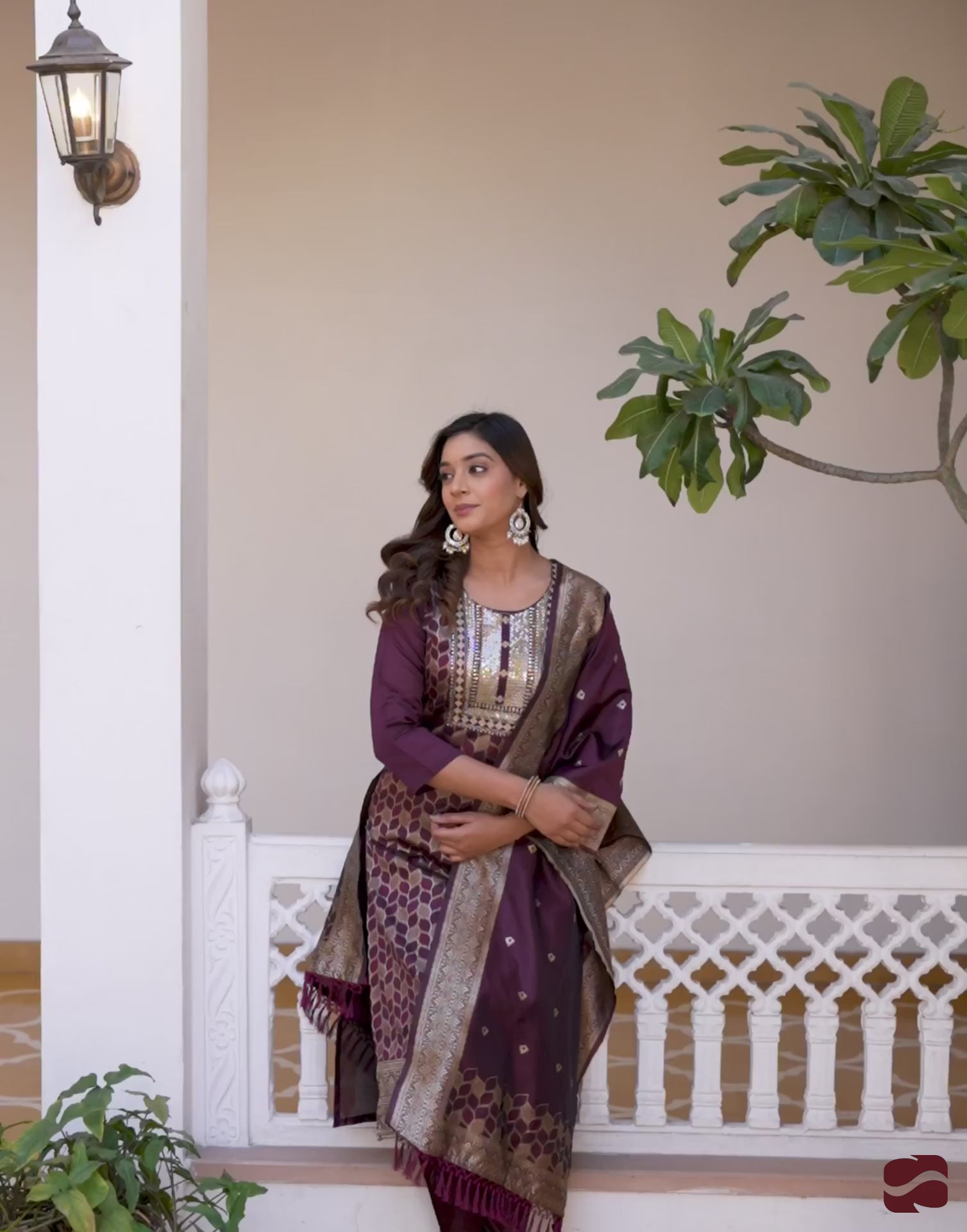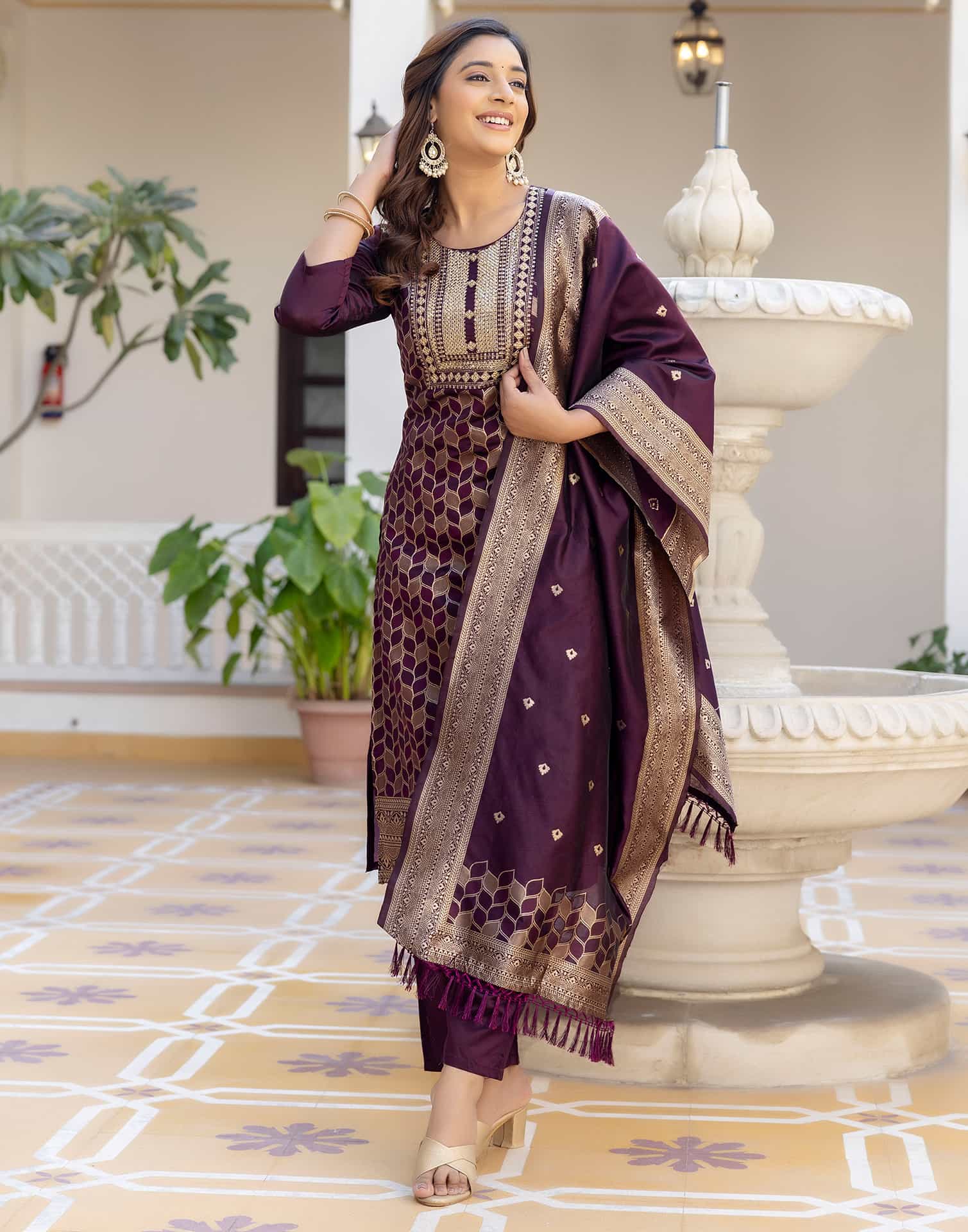 Silk Blend Weaving, Embroidery and Sequins Work A-Line Kurta with Pant & Dupatta