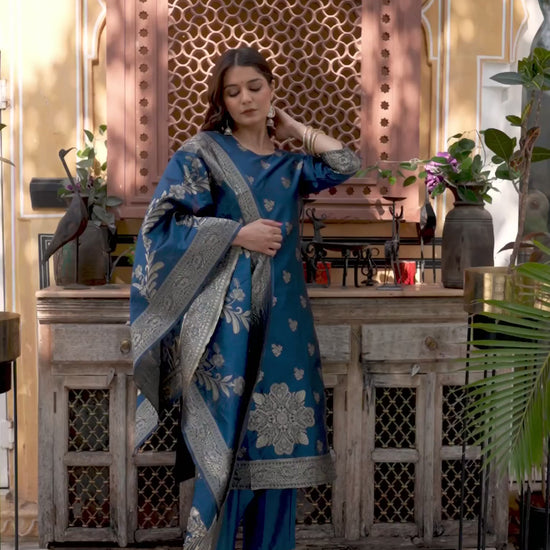 Refresh your ethnic collection with this Silk Blend kurta set in Blue. Highlighted by Woven Design and styled with a Round Neck, the kurta blends comfort with tradition. Teamed with Pant and dupatta, this outfit is perfect for Festive Wear. It guarantees all-day comfort, high-quality fabric, and the ease of an everyday ethnic wear. High-quality Fabric, Casual Wear, Indian Wear.