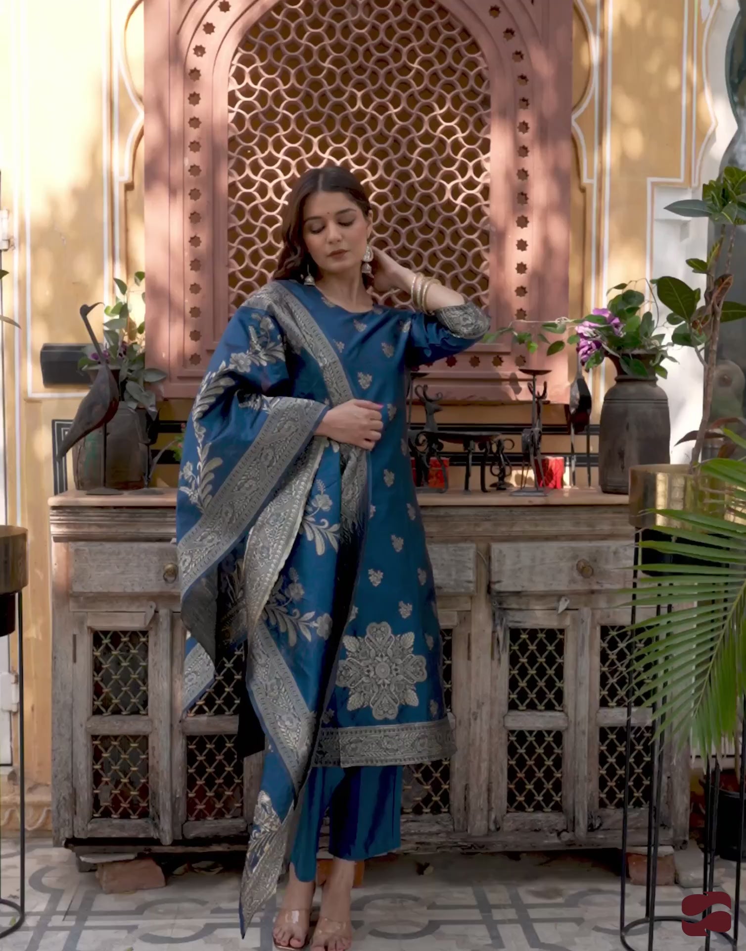 Silk Blend Weaving Straight Kurta with Pant & Dupatta
