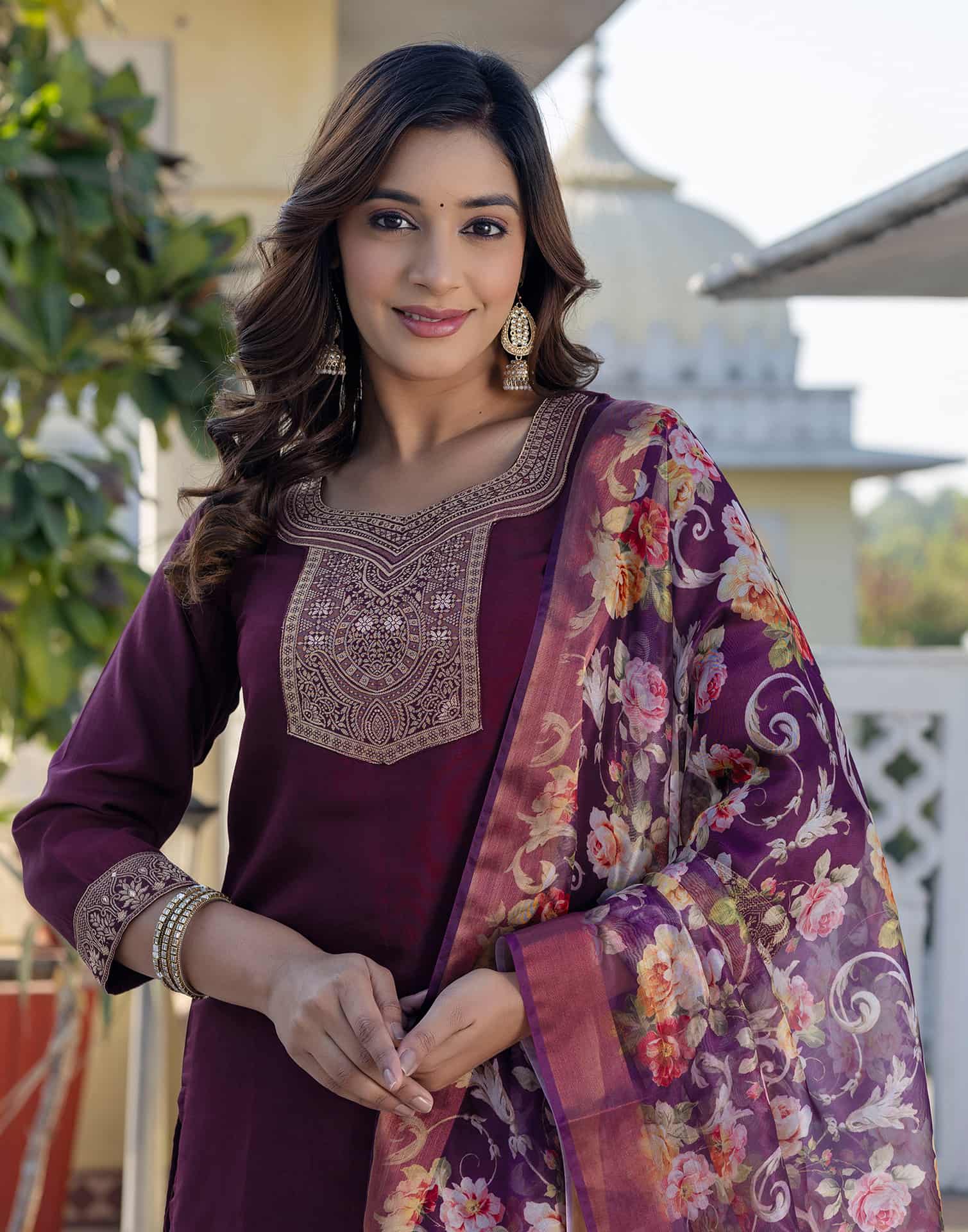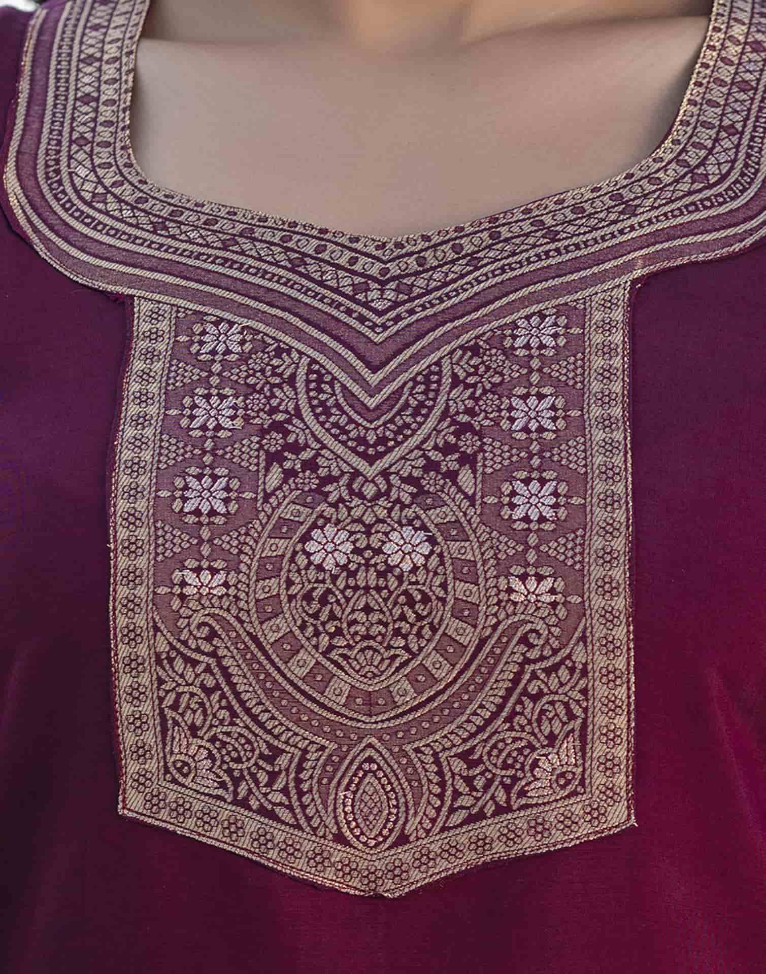 Refresh your ethnic collection with this Silk Blend kurta set in Purple. Highlighted by Woven Design and styled with a Round Neck, the kurta blends comfort with tradition. Teamed with Pant and dupatta, this outfit is perfect for Festive Wear. It guarantees all-day comfort, premium fabric, and the ease of an everyday ethnic wear. Premium Fabric, Comfortable Wear, Graceful Silhouette.