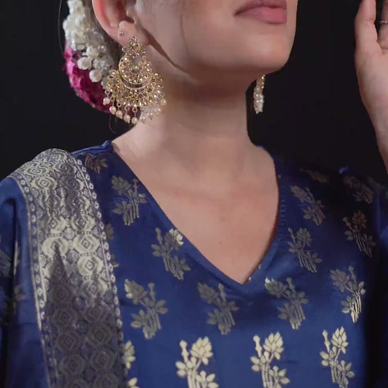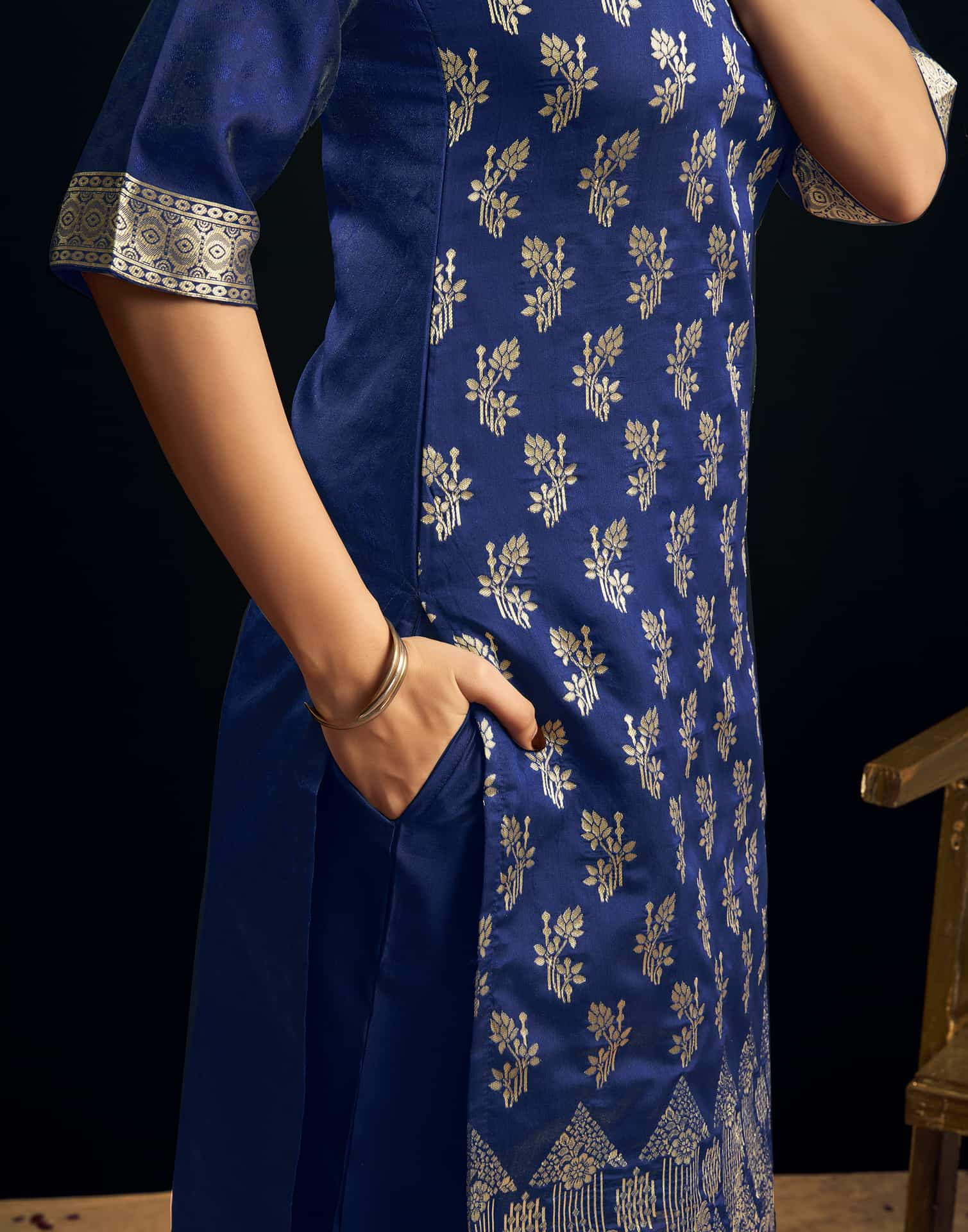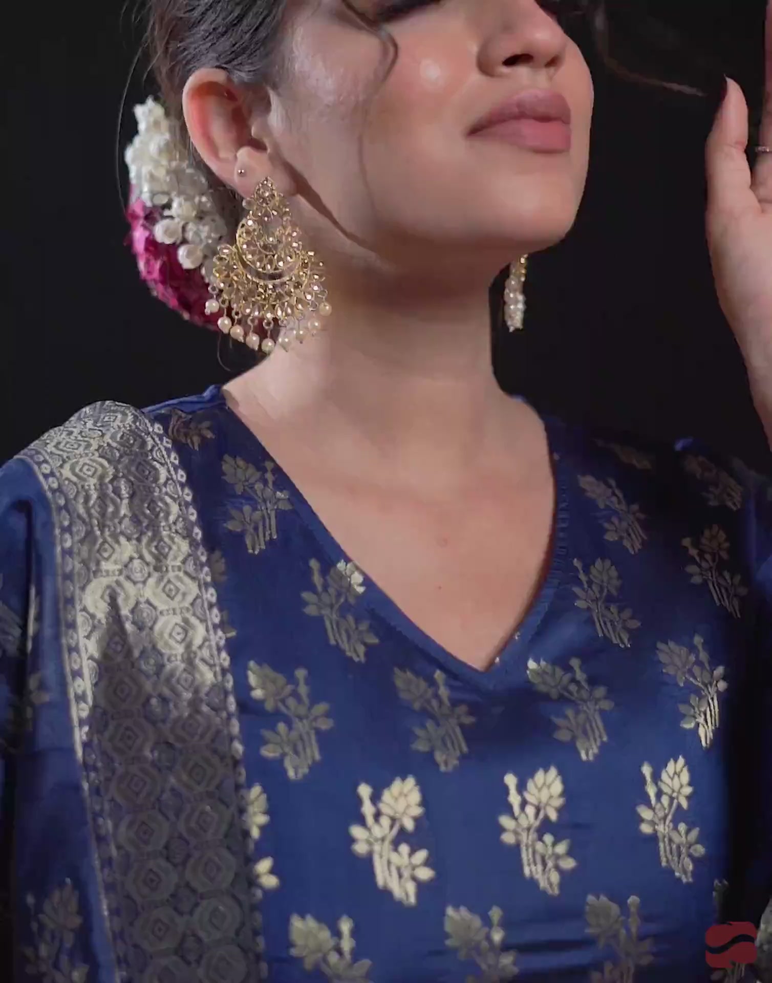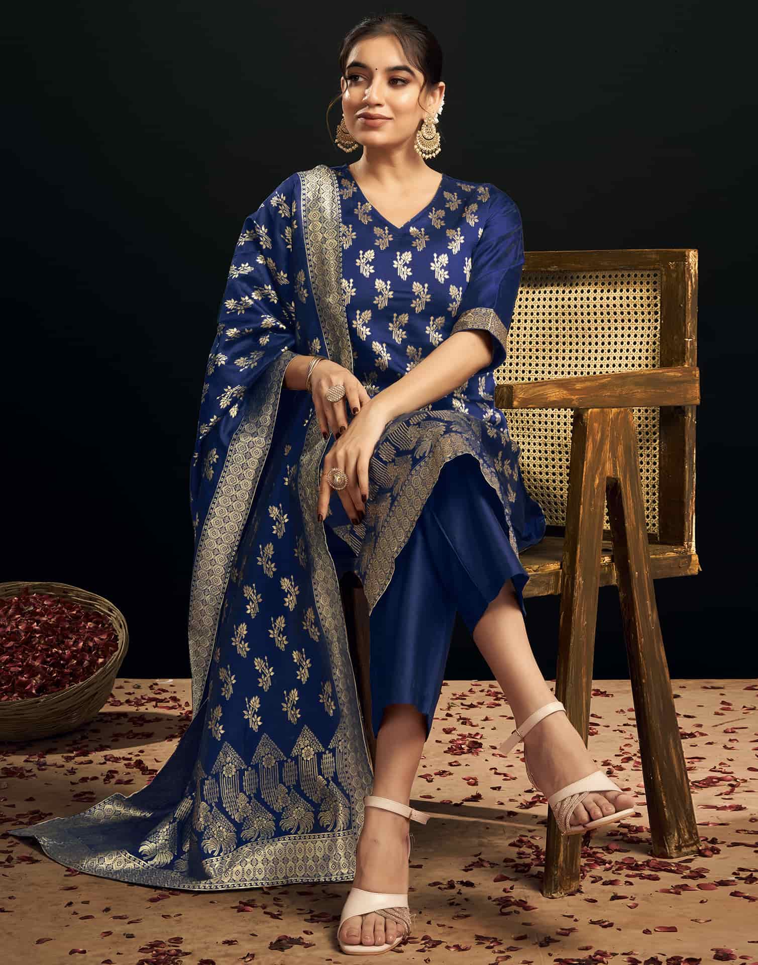 Bring elegance to every occasion with this Blue Silk Blend kurta set. Featuring Woven Design on the kurta and a V-Neck, it radiates traditional charm. Styled with Pant and dupatta, this outfit is ideal for Festive Wear. Its premium fabric ensures breathability and ease of movement, while the dupatta adds a touch of grace. Elegant Dupatta, Indian Wear, Matching Bottoms.