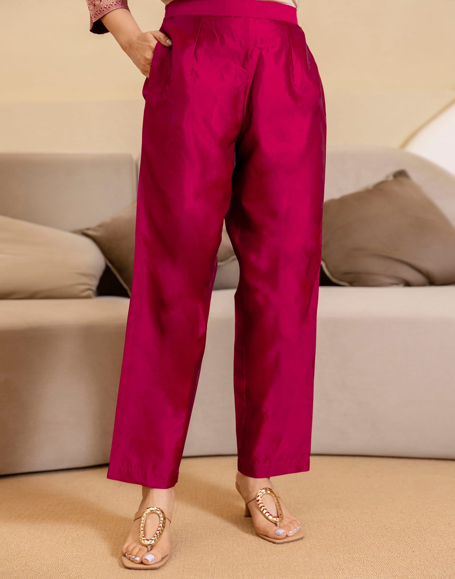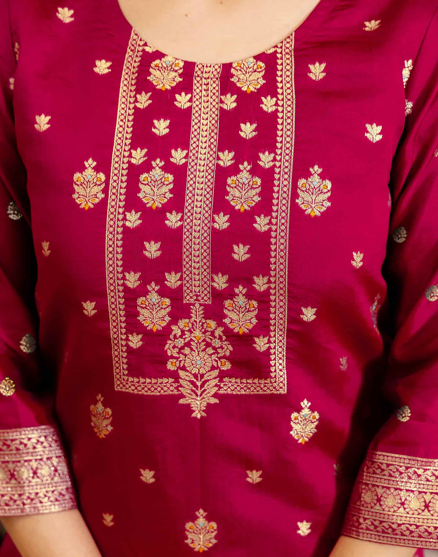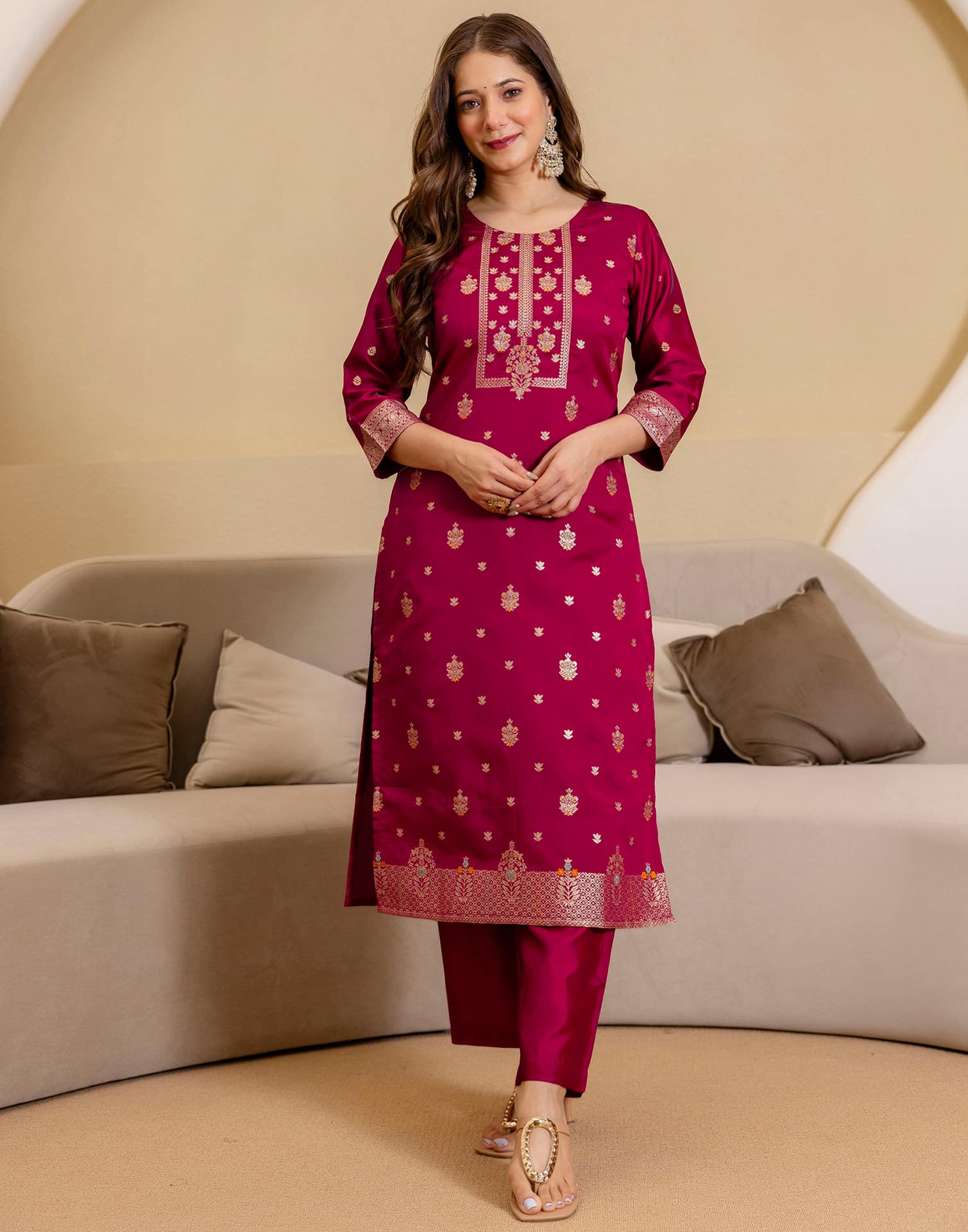 This Maroon Silk Blend kurta set is beautifully designed with Woven Design. The kurta features a Round Neck and a graceful silhouette for an elegant appeal. It is paired with Pant and a matching dupatta, making it a complete kurta set. Perfect for Festive Wear, this ethnic wear for women offers high-quality fabric, ease of movement, and timeless charm. Graceful Silhouette, Indian Wear, Complete Kurta Set.