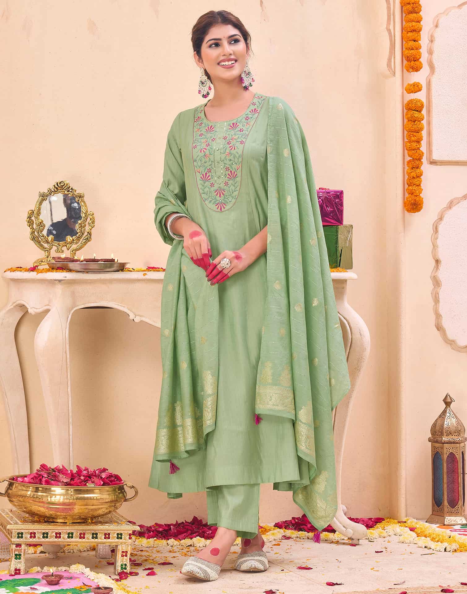 Step into sophistication with this Light Green Silk kurta set adorned with Embroidery. The kurta features a Round Neck for a refined look, paired with Pant and dupatta. Perfect for Festive Wear, it delivers ease of movement, lightweight fabric, and effortless style. Easy to Maintain, Semi-formal Wear, Matching Bottoms.