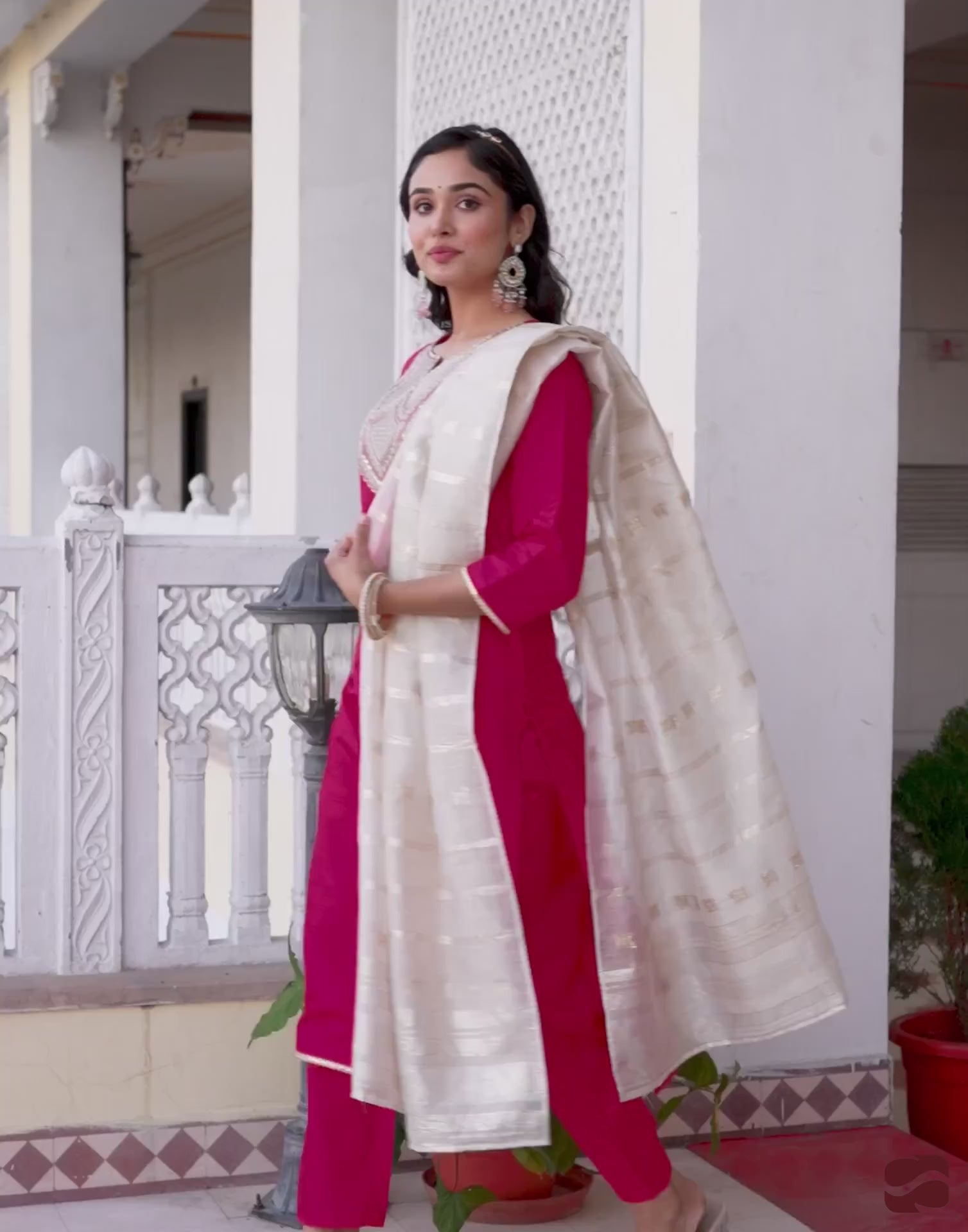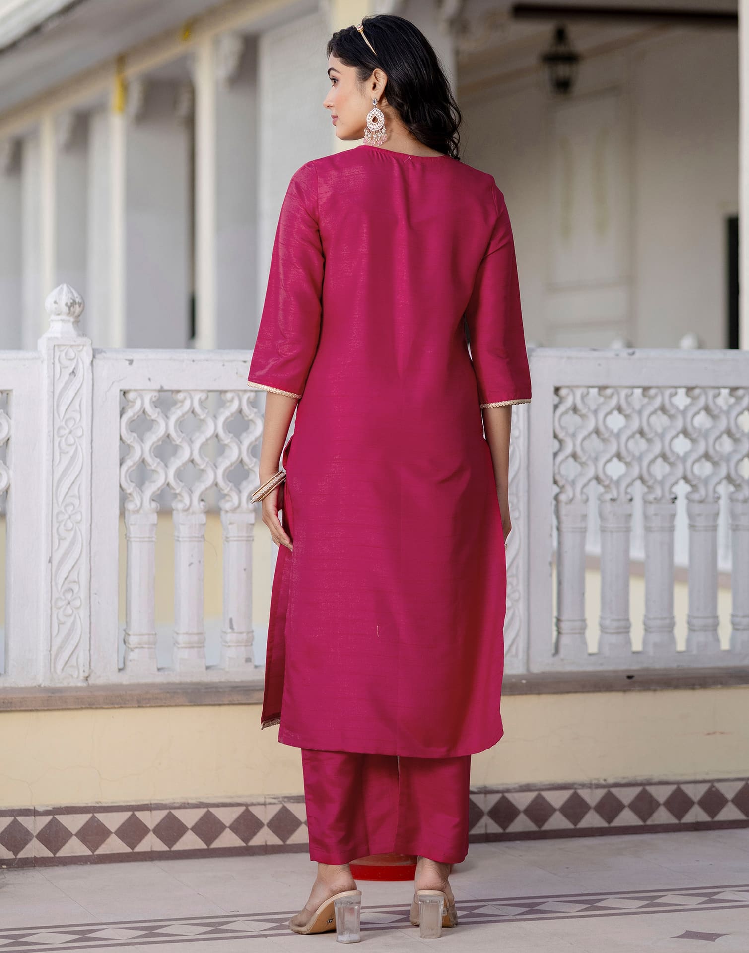 Silk Embroidered Straight Kurta with Pant & Dupatta