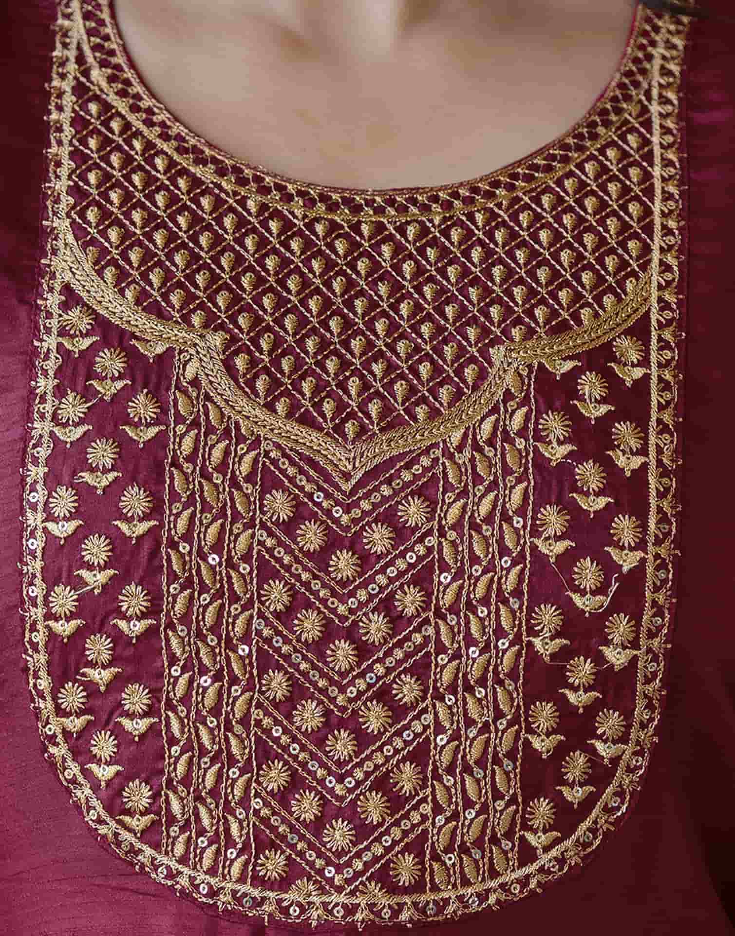 This Maroon Silk kurta set with Embroidery And Sequins Work is crafted for women who love Indian wear with a modern twist. The kurta’s Round Neck and graceful cut enhance its style, while Pant and dupatta complete the ensemble. Designed for Wedding Wear, it promises premium fabric, ease of movement, and lasting appeal. Comfortable Wear, High-quality Fabric, Lightweight Fabric.