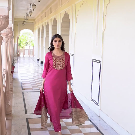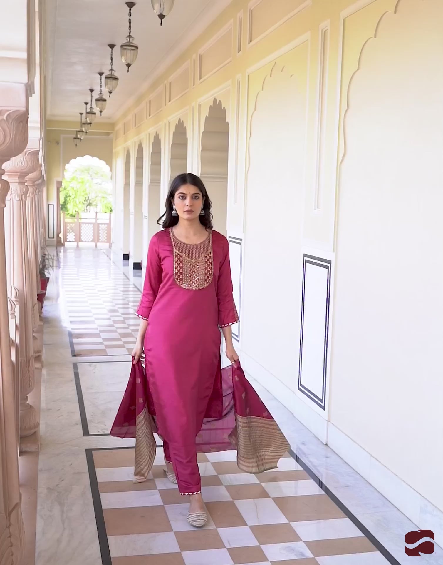 Silk Embroidered Straight Kurta with Pant & Dupatta