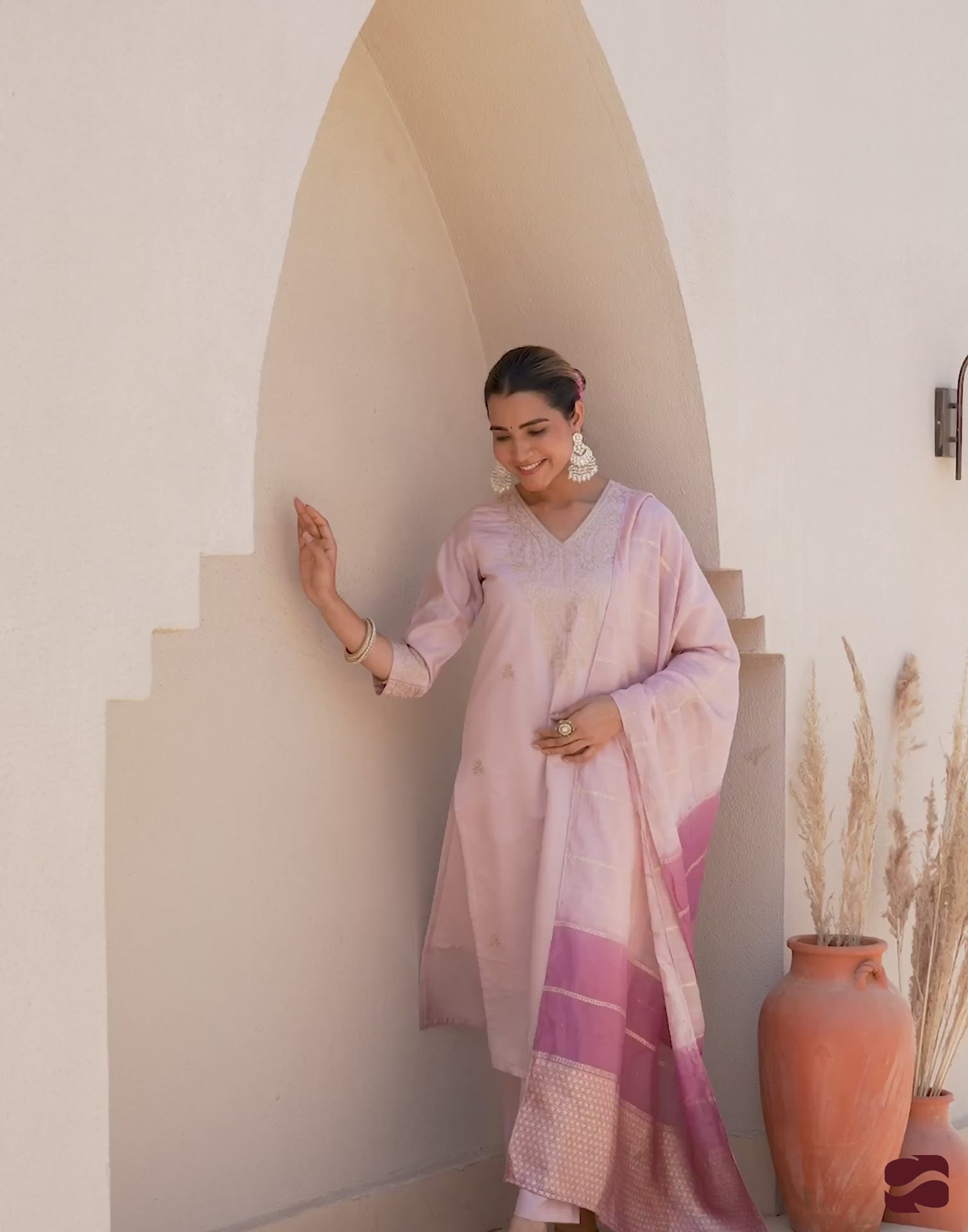 Refresh your ethnic collection with this Silk kurta set in Pink. Highlighted by Embroidery and styled with a V-Neck, the kurta blends comfort with tradition. Teamed with Pant and dupatta, this outfit is perfect for Festive Wear. It guarantees comfortable wear, high-quality fabric, and the ease of an everyday ethnic wear. Family Function Wear, Comfortable Wear, Matching Bottoms.