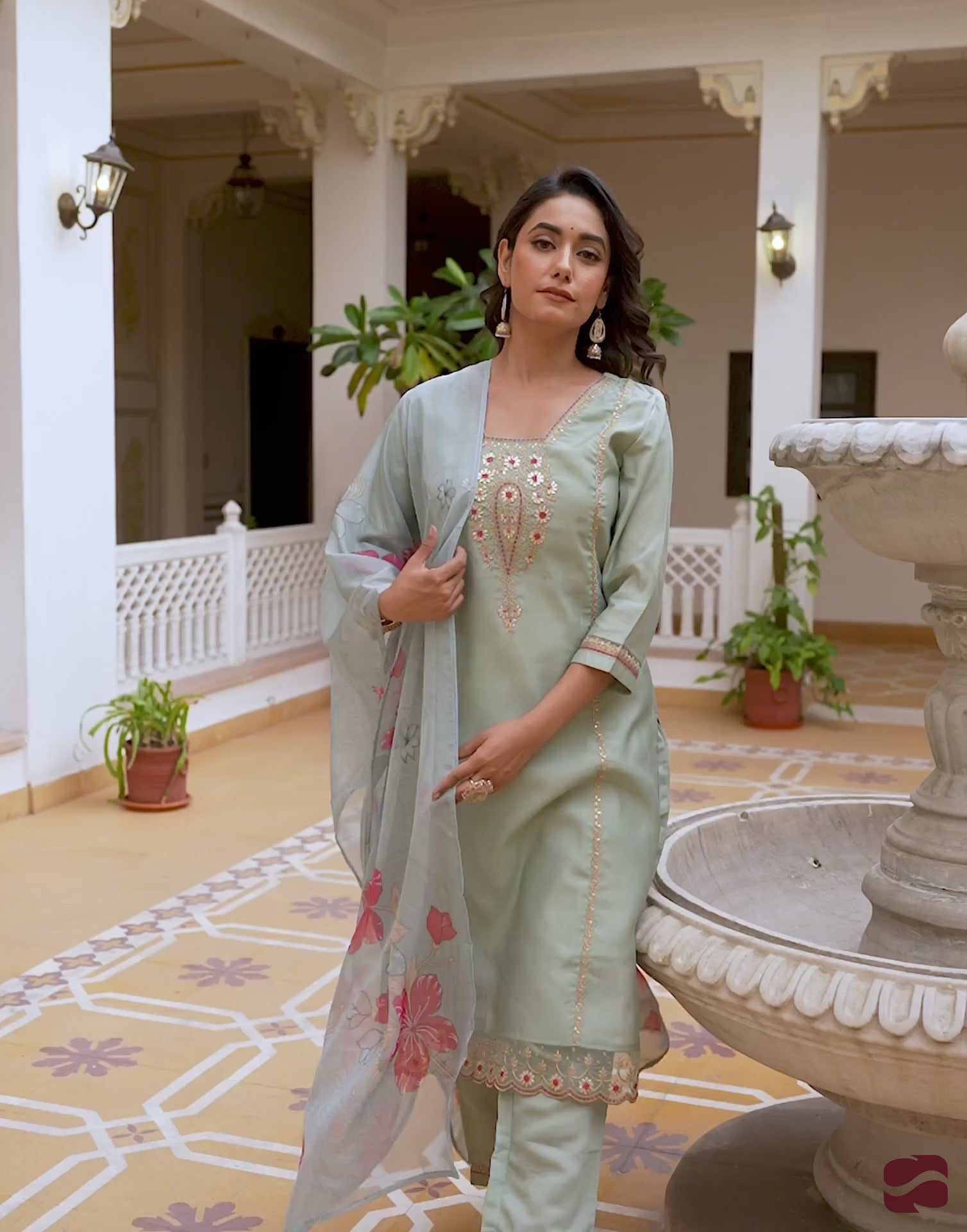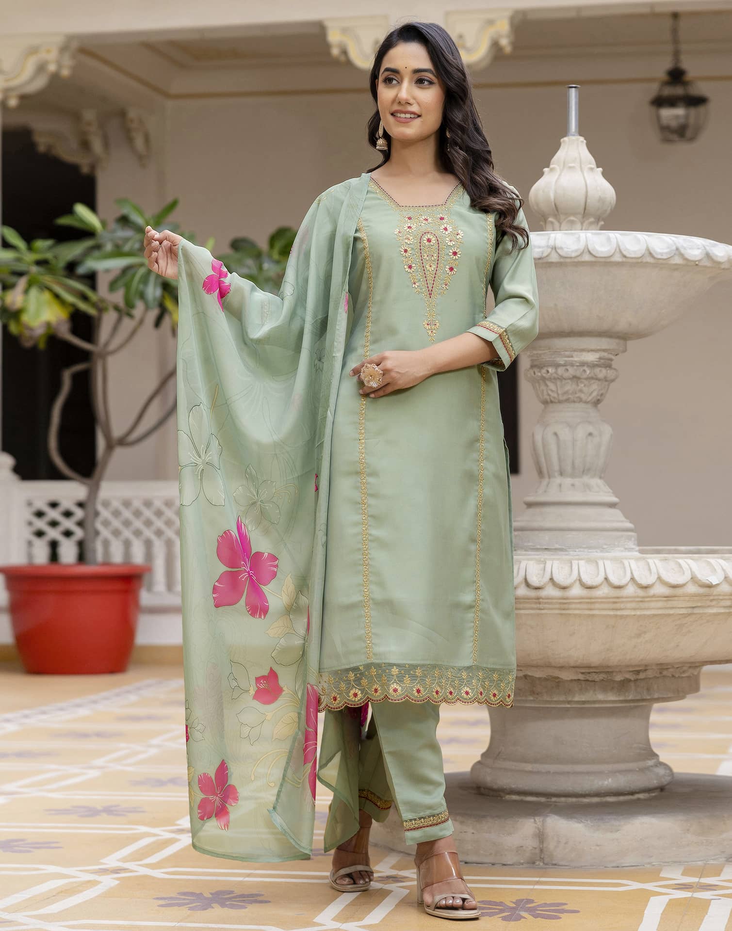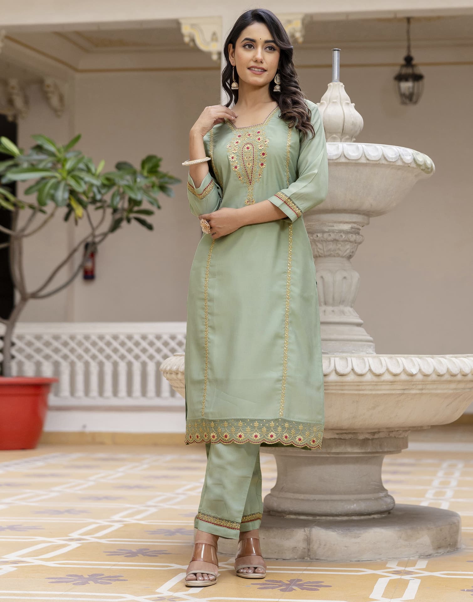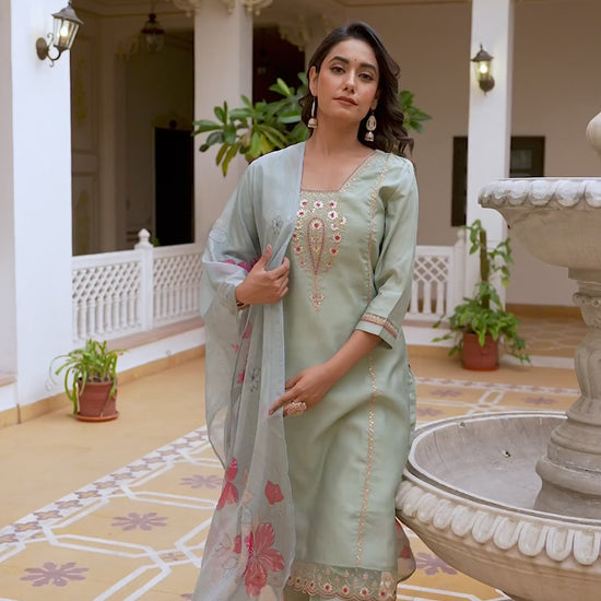This Light Green Silk kurta set is beautifully designed with Embroidery And Sequins Work. The kurta features a Square Neck and a graceful silhouette for an elegant appeal. It is paired with Pant and a matching dupatta, making it a complete kurta set. Perfect for Wedding Wear, this ethnic wear for women offers soft & breathable fabric, ease of movement, and timeless charm. Easy to Maintain, Comfortable Fit, Lightweight Fabric.