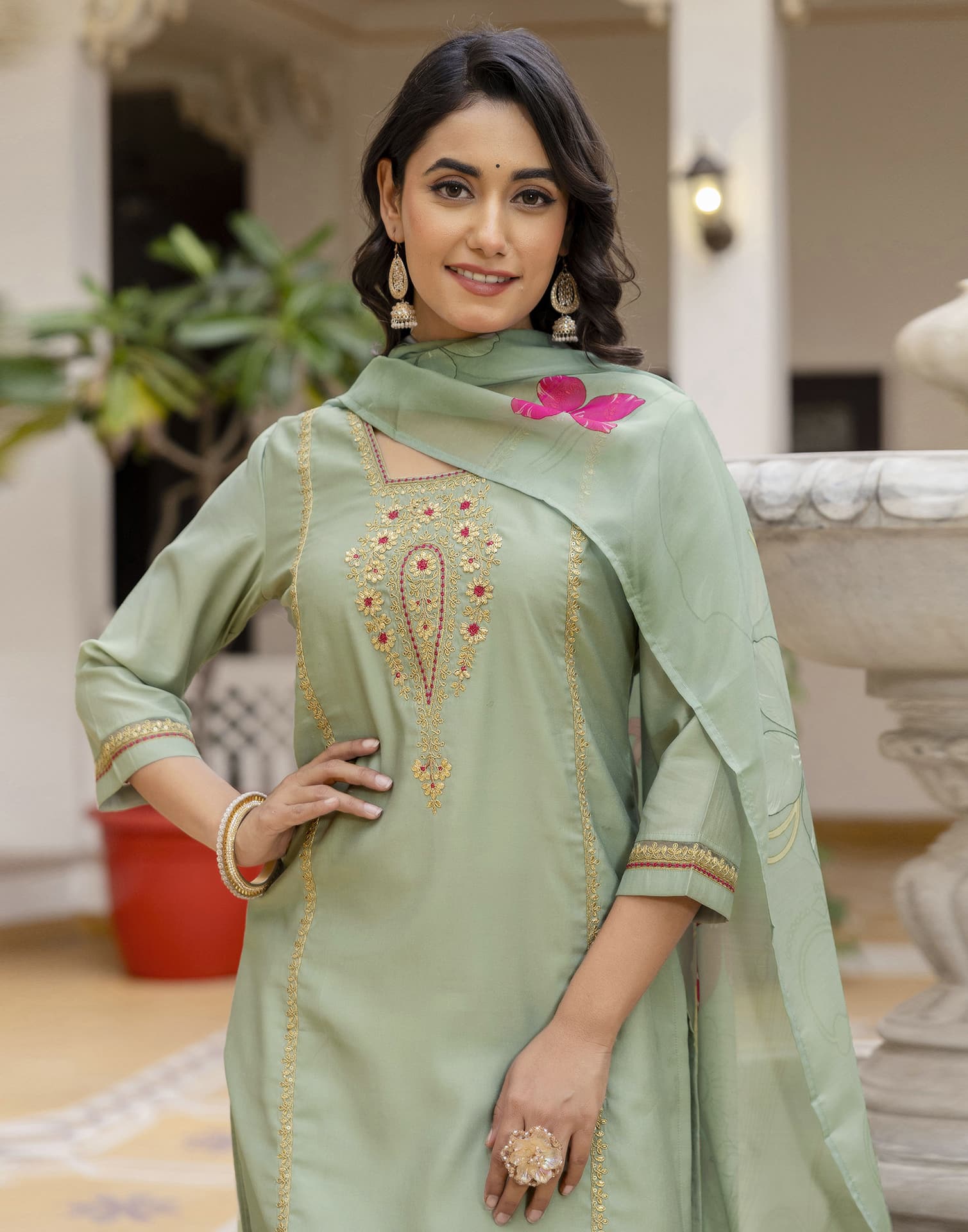 Silk Embroidered Straight Kurta with Pant & Dupatta