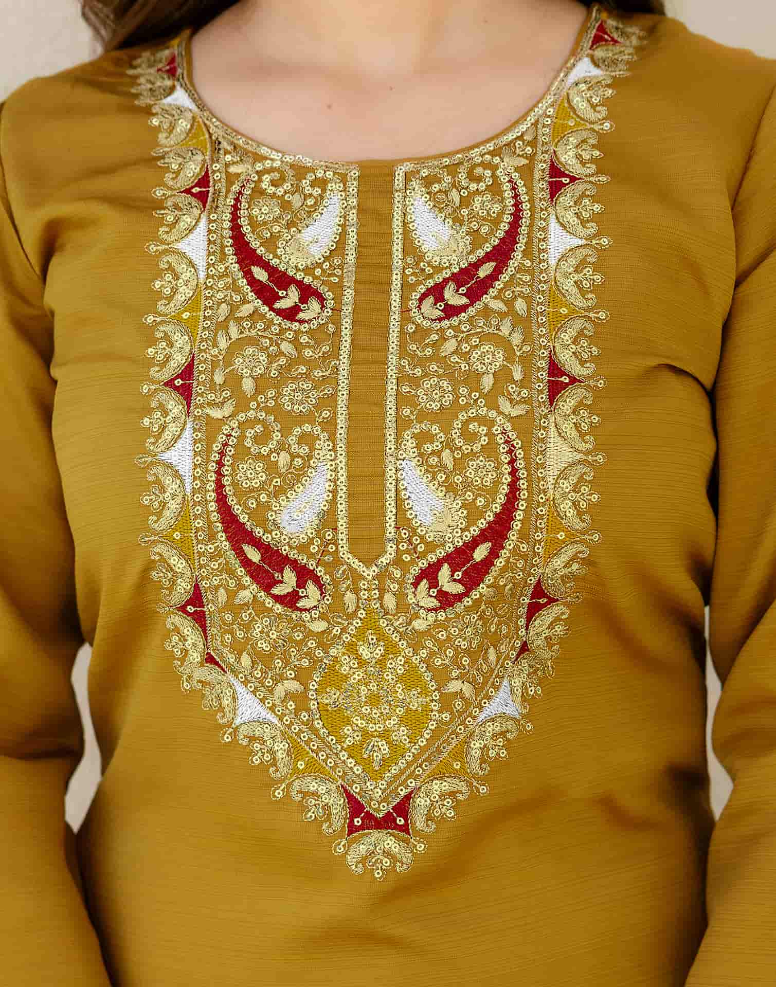 Bring elegance to every occasion with this Yellow Silk kurta set. Featuring Embroidery And Sequins Work on the kurta and a Round Neck, it radiates traditional charm. Styled with Pant and dupatta, this outfit is ideal for Wedding Wear. Its soft & breathable fabric ensures breathability and comfortable wear, while the dupatta adds a touch of grace. Complete Kurta Set, Traditional Outfit, All-day Comfort.