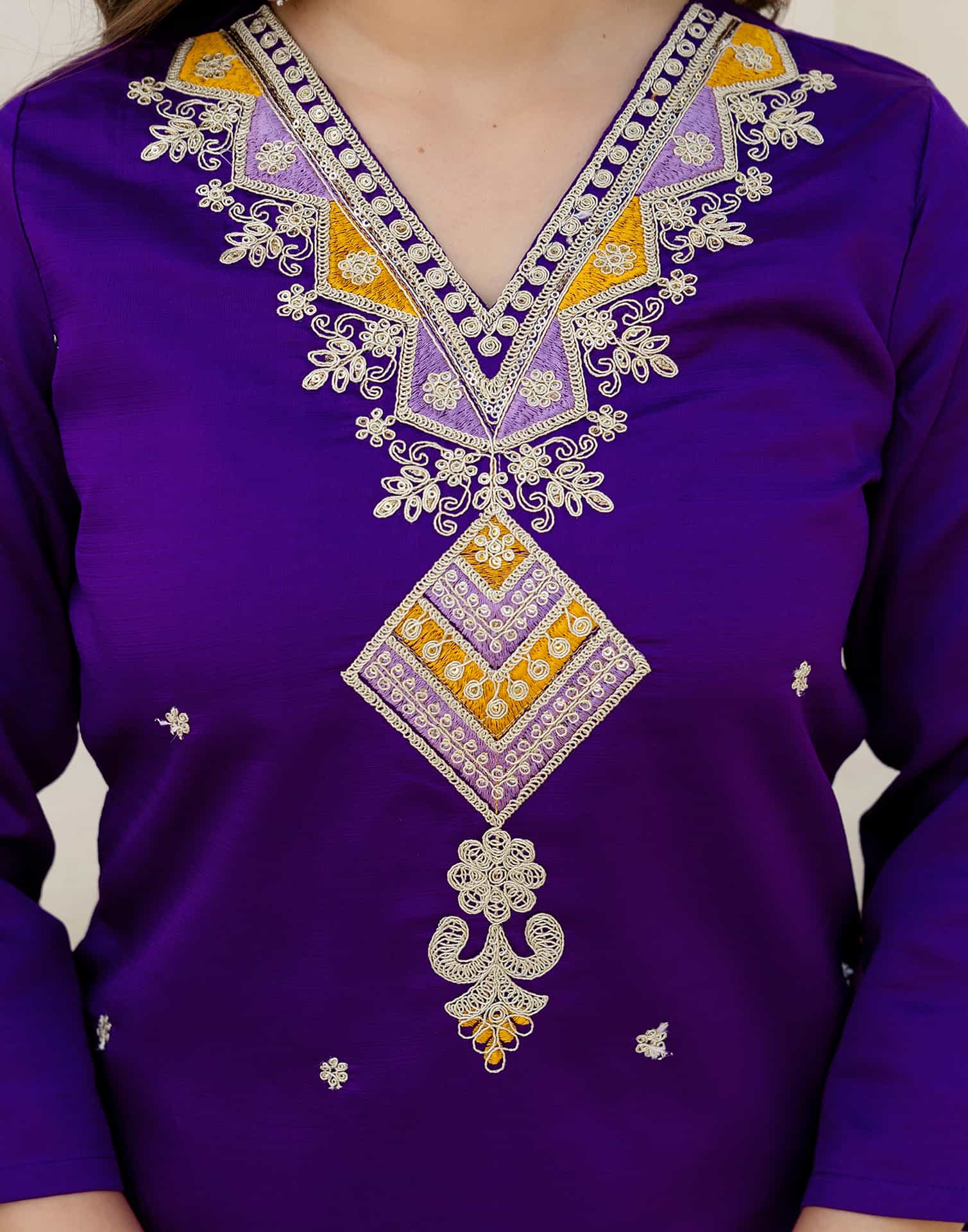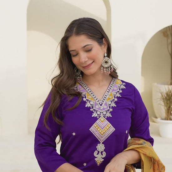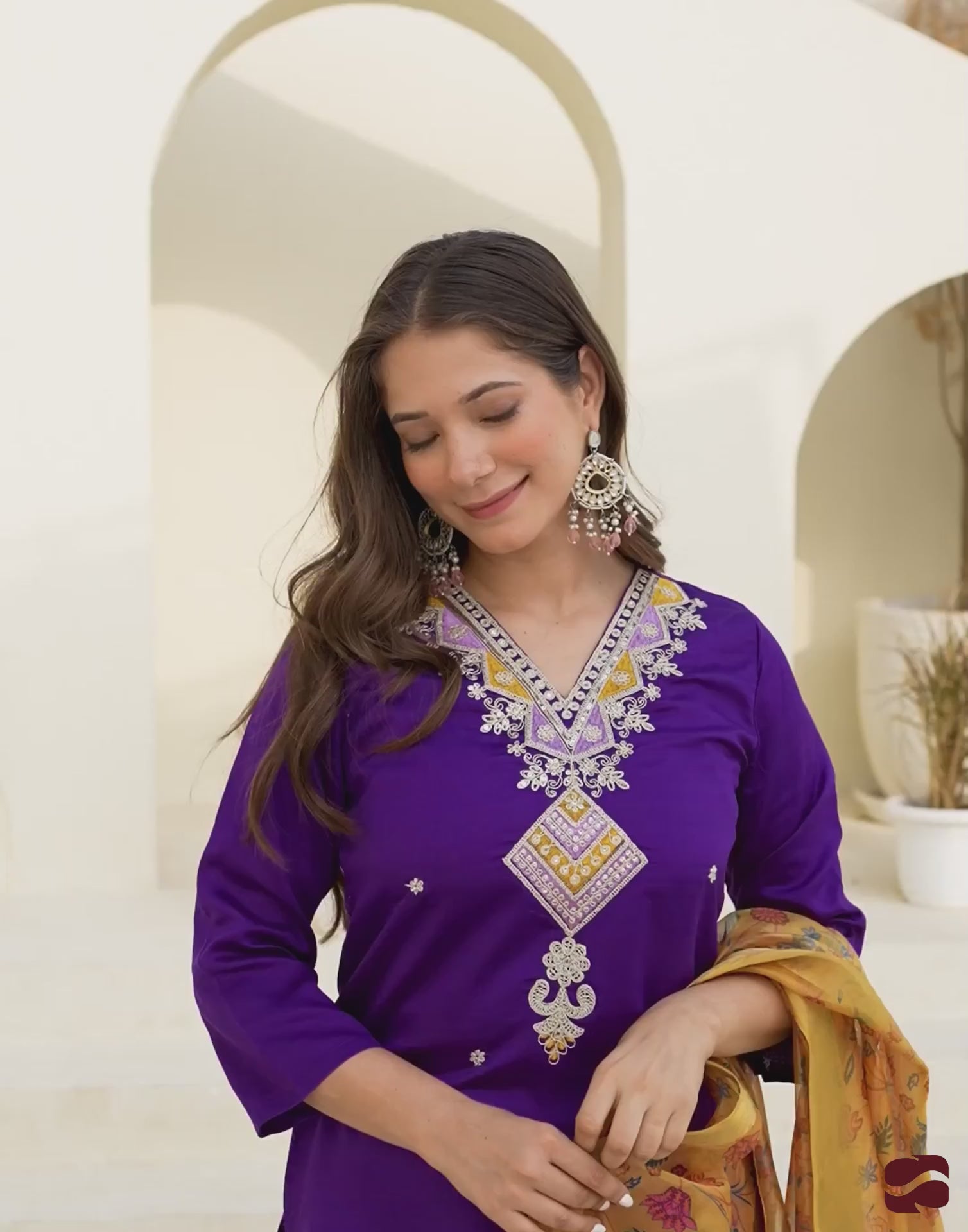 Elevate your ethnic wardrobe with this Silk kurta set in Purple. Designed with Embroidery And Sequins Work and a V-Neck, the kurta offers a comfortable fit and stylish finish. The set includes Pant and a dupatta, completing the look. Suitable for Wedding Wear, it combines high-quality fabric, all-day comfort, and modern design. Made in India, All-day Comfort, High-quality Fabric.