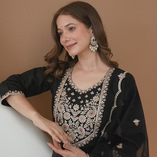 Refresh your ethnic collection with this Silk kurta set in Black. Highlighted by Embroidery And Sequins Work and styled with a Round Neck, the kurta blends comfort with tradition. Teamed with Pant With Pocket and dupatta, this outfit is perfect for Wedding Wear. It guarantees ease of movement, lightweight fabric, and the ease of an everyday ethnic wear. High-quality Fabric, Soft & Breathable Fabric, Everyday Wear.