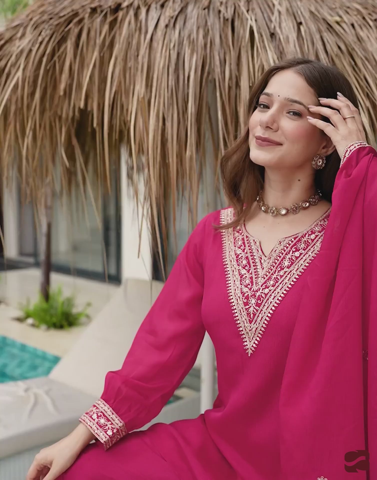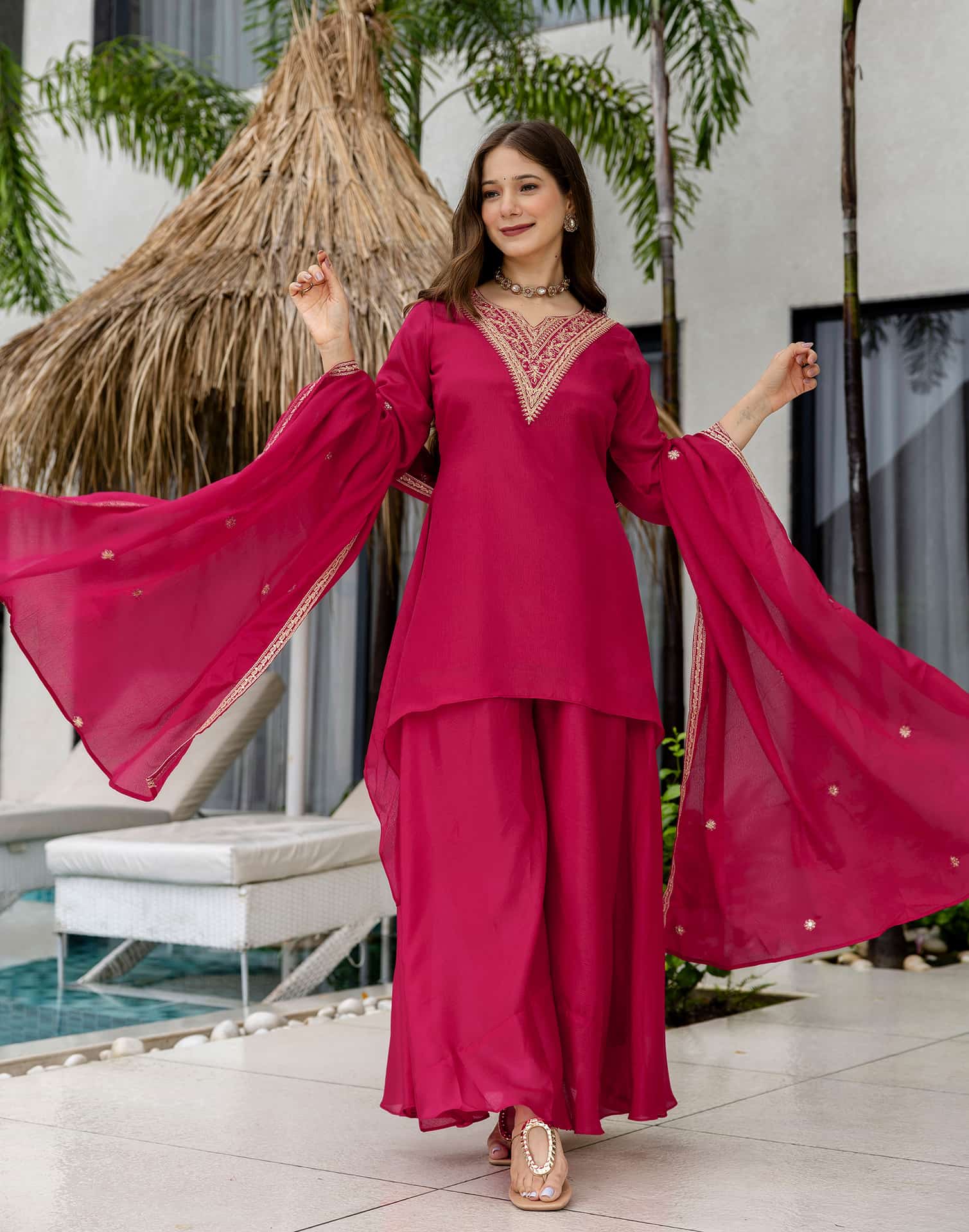 Crafted in Silk with exquisite Embroidery And Sequins Work, this Rani Pink kurta set is an essential for your ethnic wardrobe. The kurta comes with a V Neck, paired with Sharara and dupatta for a complete look. Ideal for Wedding Wear, it ensures all-day comfort and lightweight fabric. A perfect choice for festive wear and traditional outfit lovers. Comfortable Wear, Comfortable Fit, Ease of Movement.