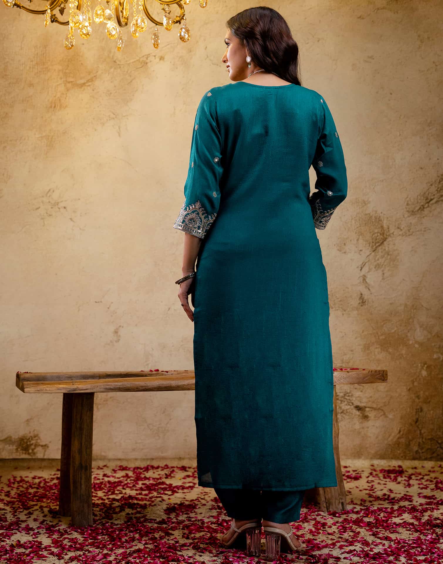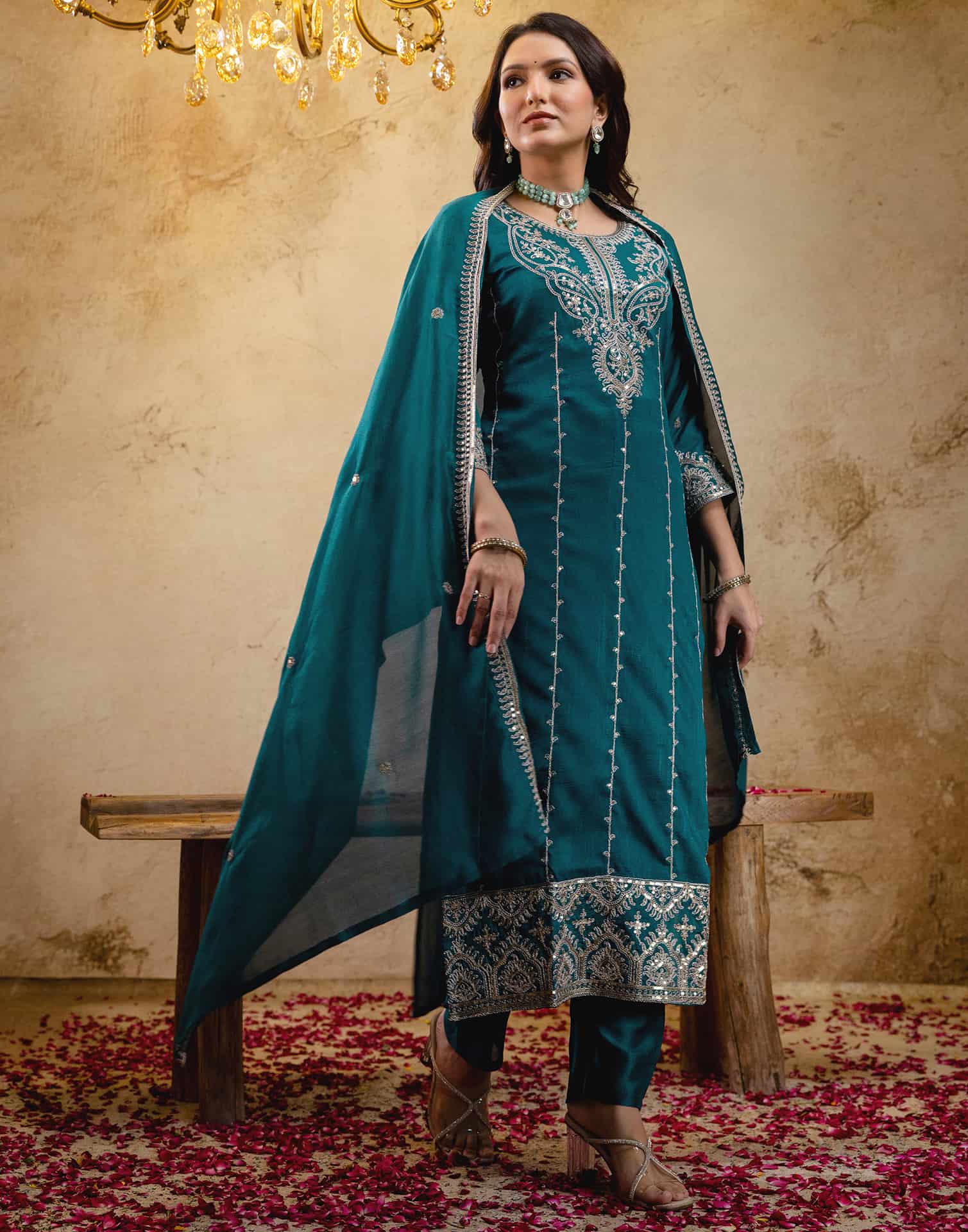 Silk Embroidered Straight Kurta with Pant & Dupatta