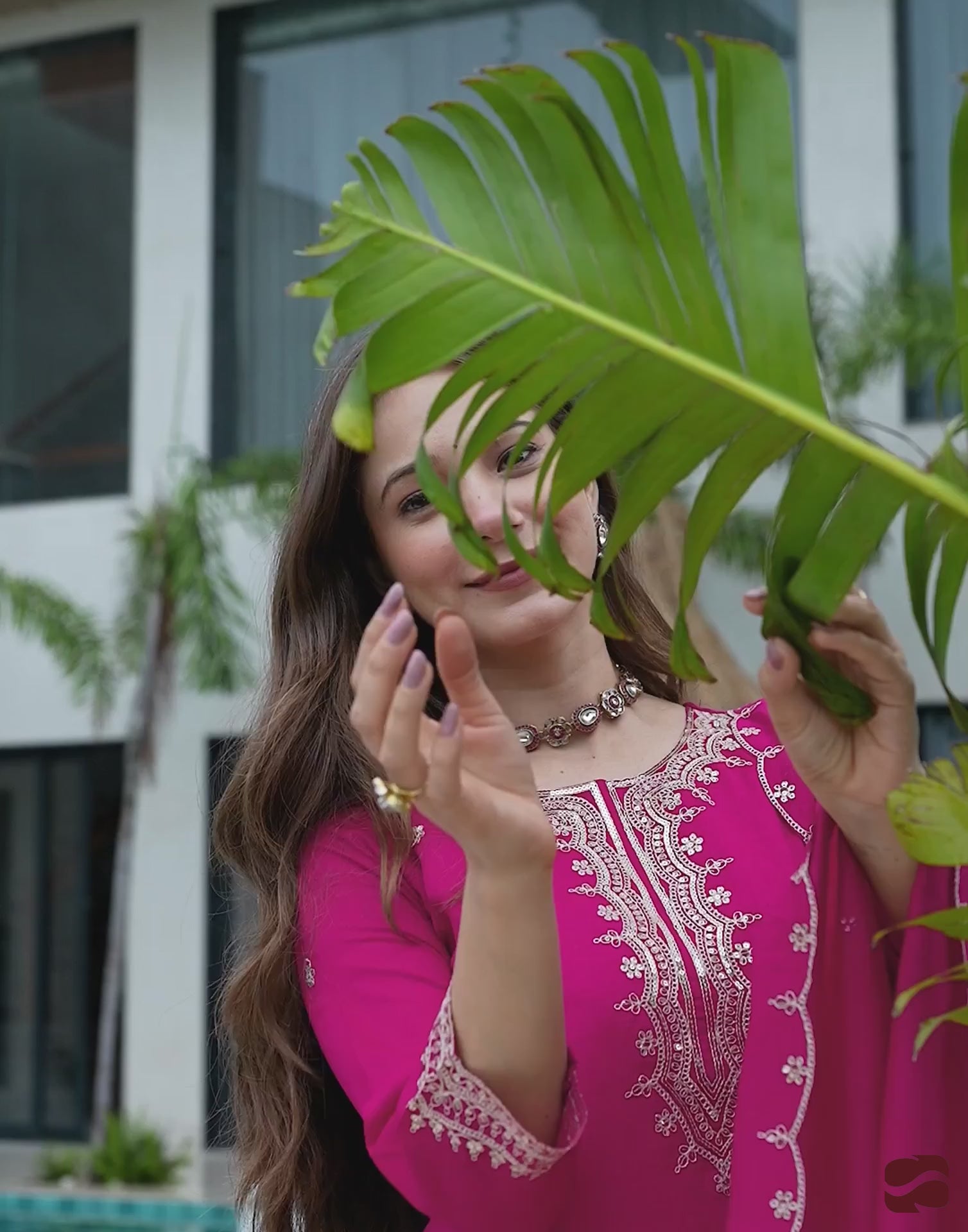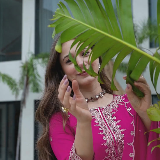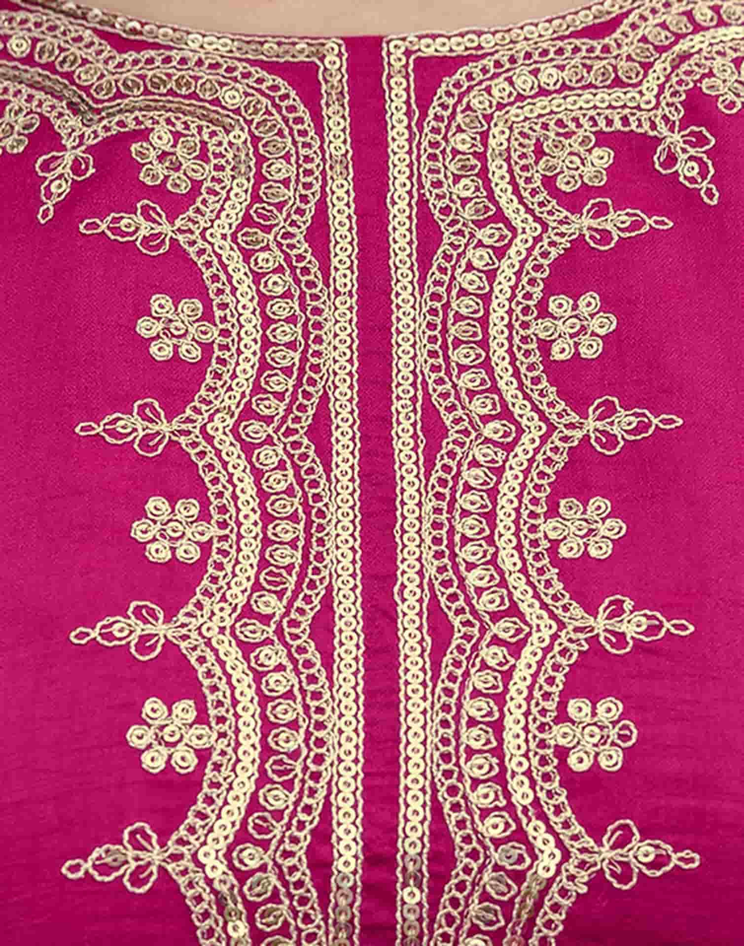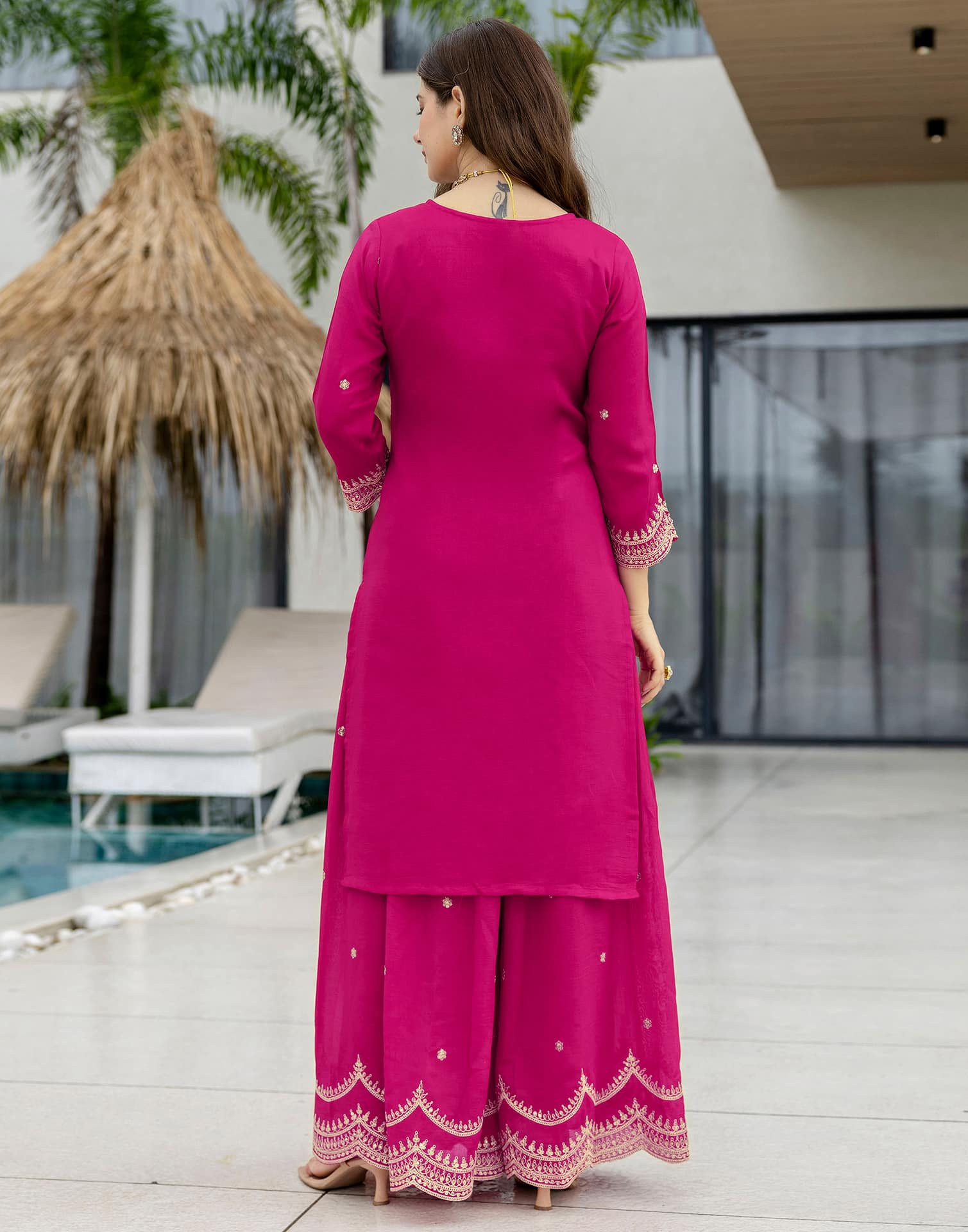 Crafted in Silk with exquisite Embroidery And Sequins Work, this Rani Pink kurta set is an essential for your ethnic wardrobe. The kurta comes with a Round Neck, paired with Sharara and dupatta for a complete look. Ideal for Wedding Wear, it ensures ease of movement and high-quality fabric. A perfect choice for festive wear and traditional outfit lovers. Traditional Outfit, Casual Wear, Ease of Movement.
