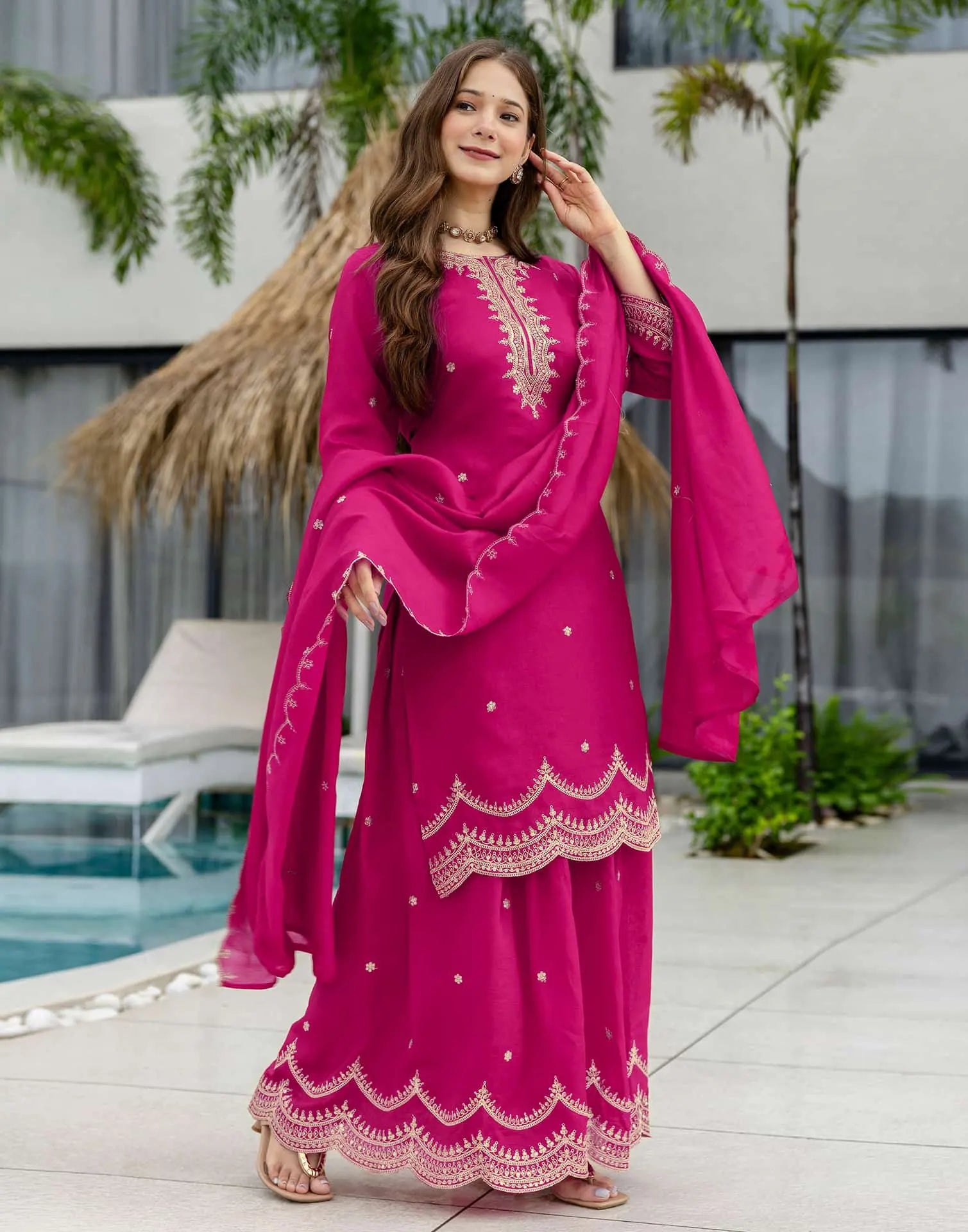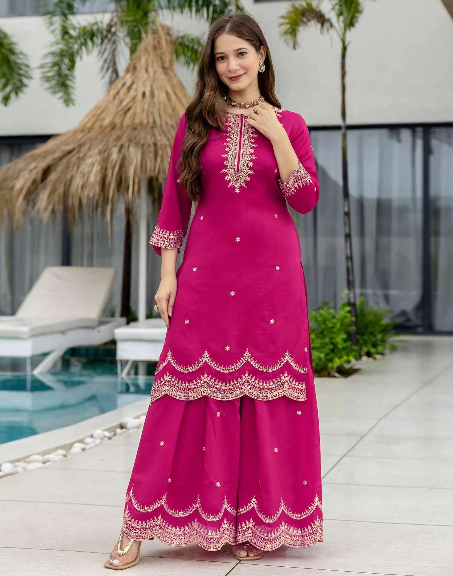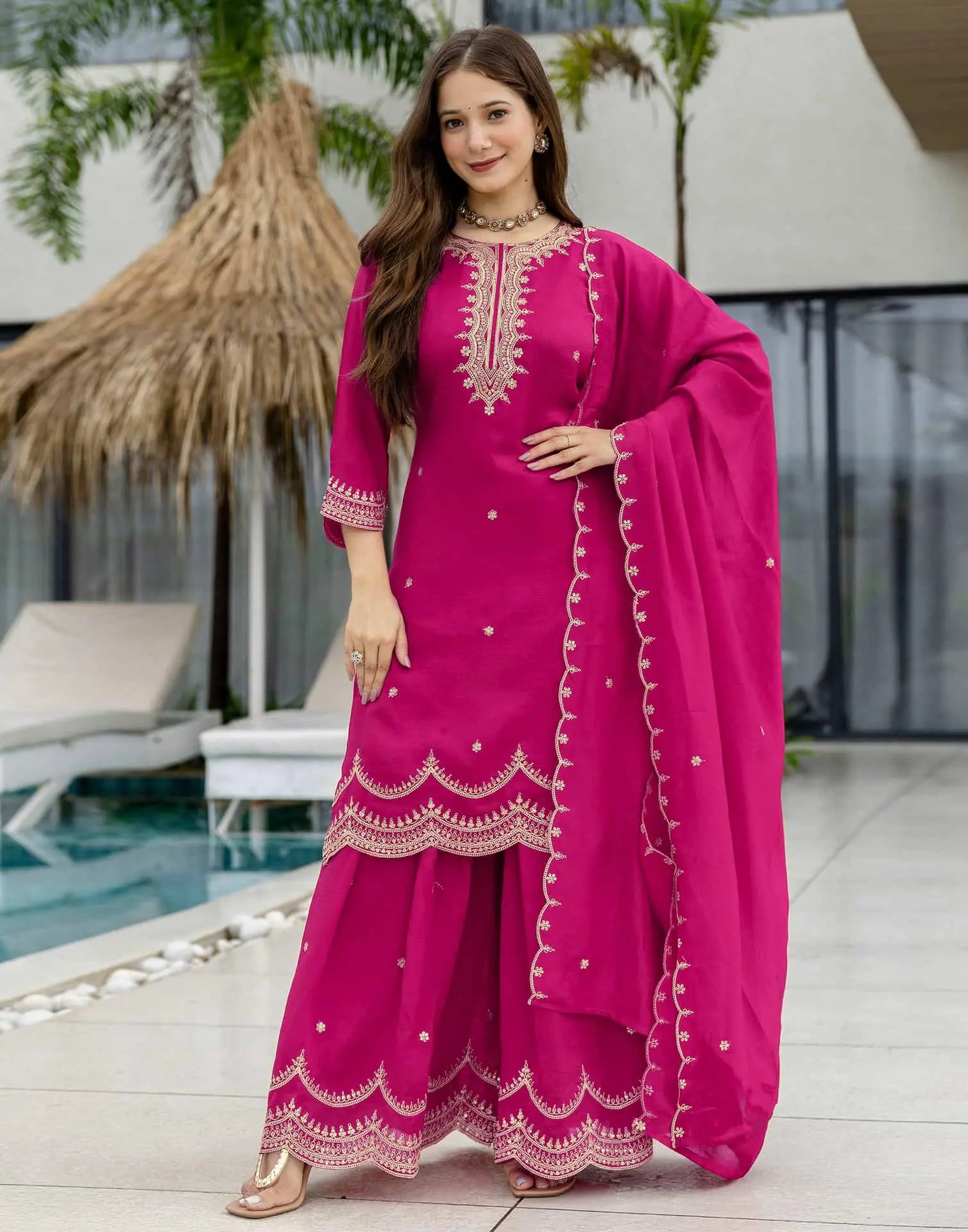 Silk Embroidered Straight Kurta with Pant & Dupatta