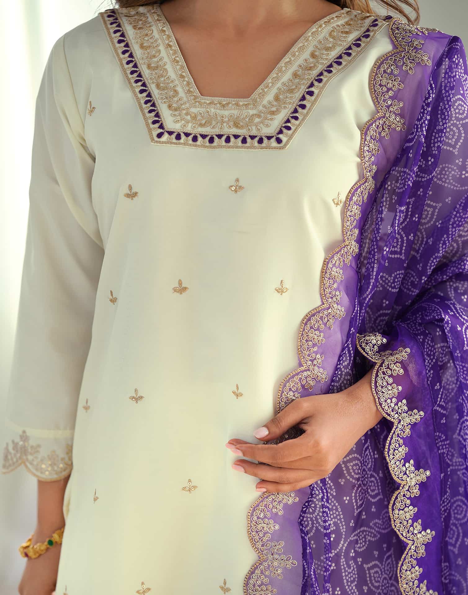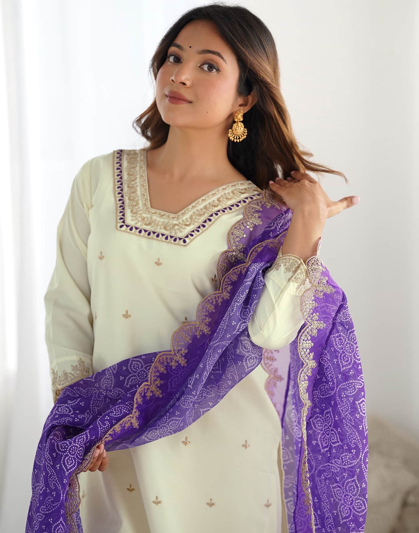 Bring elegance to every occasion with this Off White Silk kurta set. Featuring Embroidered on the kurta and a U-Neck, it radiates traditional charm. Styled with Pant and dupatta, this outfit is ideal for Festive Wear. Its soft & breathable fabric ensures breathability and all-day comfort, while the dupatta adds a touch of grace. Premium Fabric, Ethnic Wear for Women, Family Function Wear.