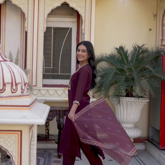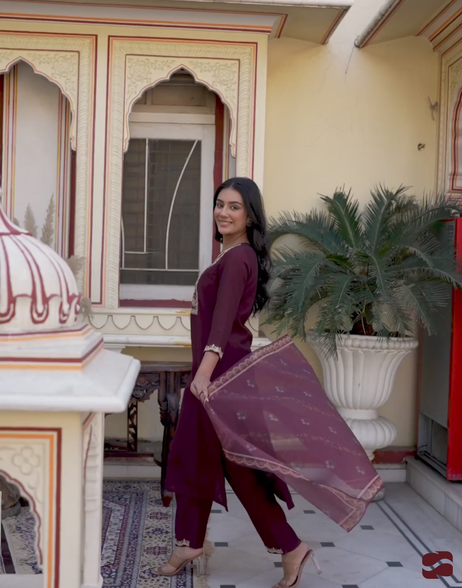 Crafted in Silk with exquisite Embroidery And Sequins Work, this Brown kurta set is an essential for your ethnic wardrobe. The kurta comes with a V Neck, paired with Pant With Pocket and dupatta for a complete look. Ideal for Wedding Wear, it ensures ease of movement and high-quality fabric. A perfect choice for festive wear and traditional outfit lovers. Easy to Maintain, Casual Wear, Traditional Occasion Outfit.