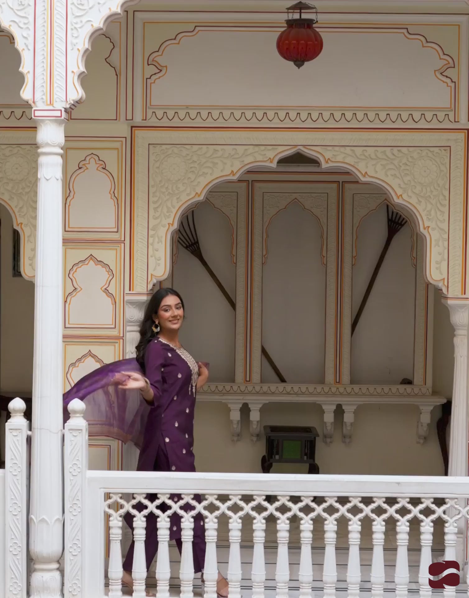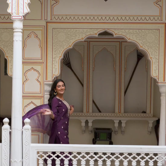 Crafted in Silk with exquisite Embroidery And Sequins Work, this Dark Purple kurta set is an essential for your ethnic wardrobe. The kurta comes with a Round Neck, paired with Pant With Pocket and dupatta for a complete look. Ideal for Wedding Wear, it ensures ease of movement and soft & breathable fabric. A perfect choice for festive wear and traditional outfit lovers. Lightweight Fabric, High-quality Fabric, Matching Bottoms.