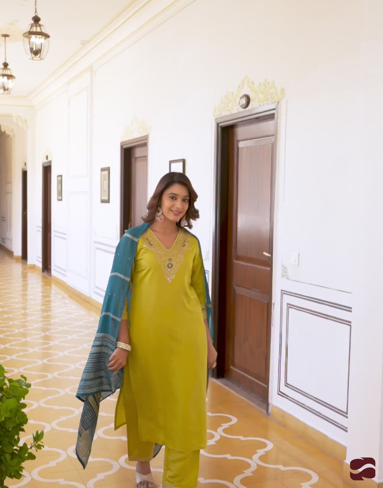 This Mustard Green Silk kurta set with Embroidery And Sequins Work is crafted for women who love Indian wear with a modern twist. The kurta’s V Neck and graceful cut enhance its style, while Pant With Pocket and dupatta complete the ensemble. Designed for Wedding Wear, it promises lightweight fabric, ease of movement, and lasting appeal. Easy to Maintain, Indian Wear, Kurta with Pant & Dupatta.