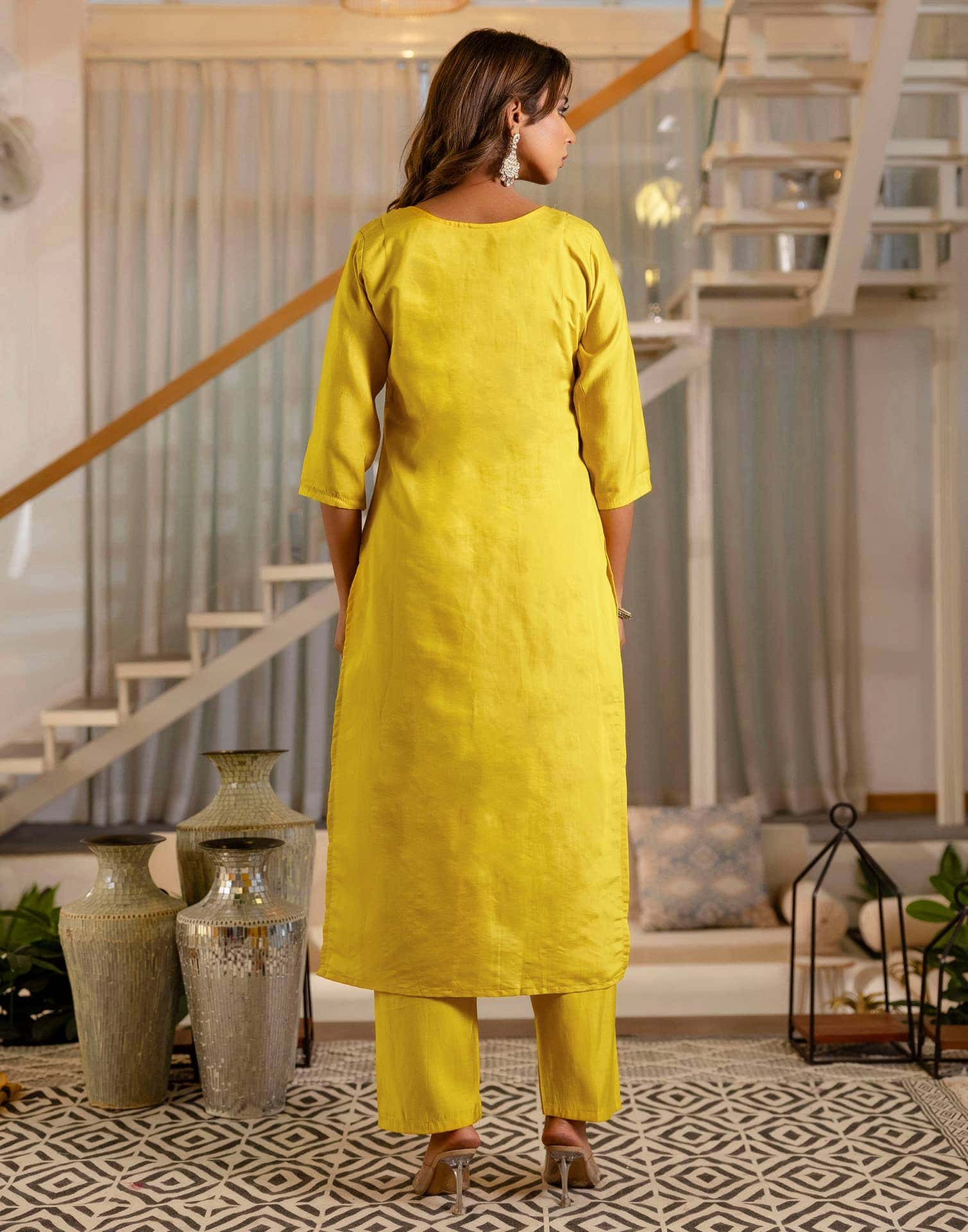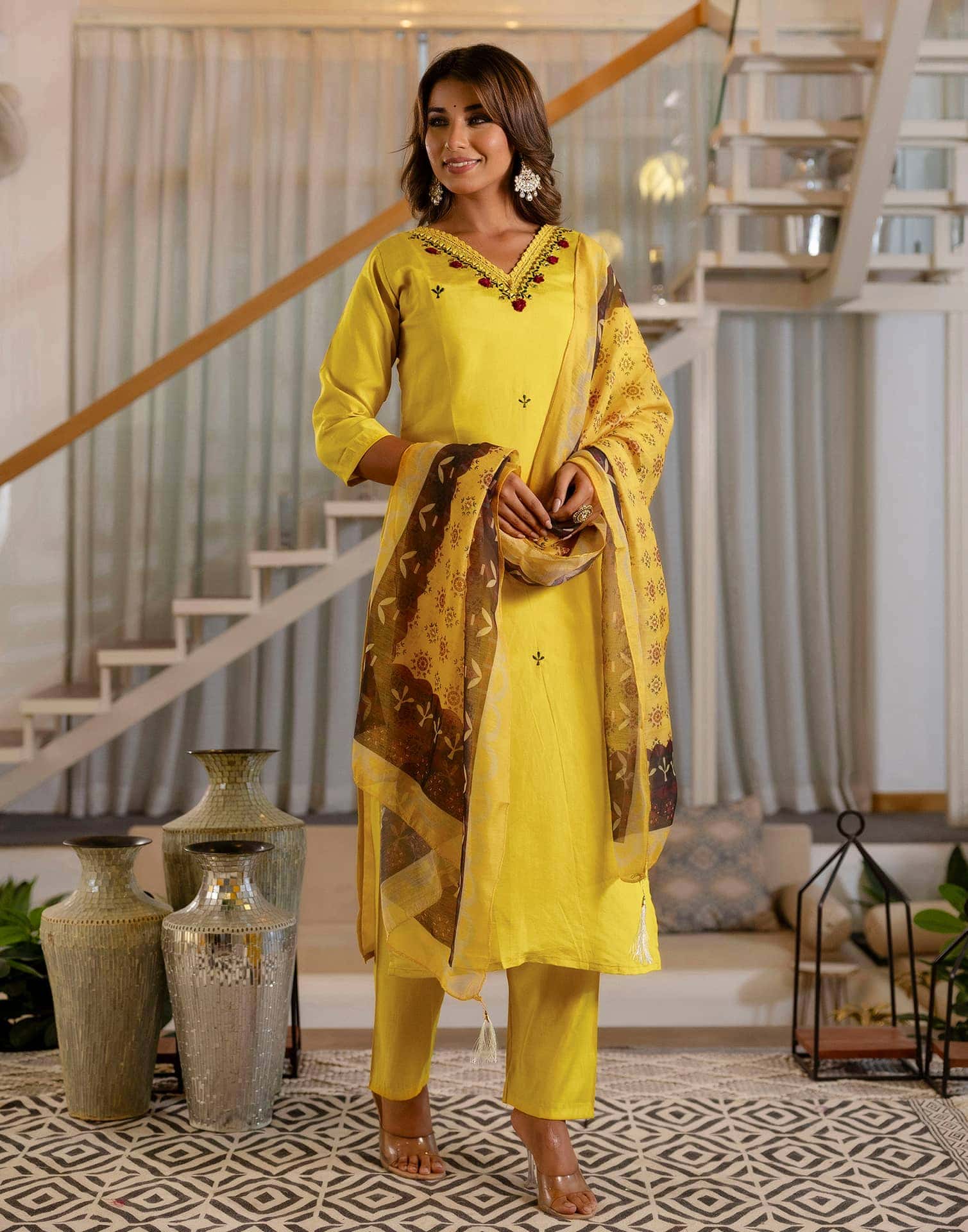 This Mustard Yellow Silk Blend kurta set with Embroidery is crafted for women who love Indian wear with a modern twist. The kurta’s V Neck and graceful cut enhance its style, while Pant With Pocket and dupatta complete the ensemble. Designed for Festive Wear, it promises lightweight fabric, comfortable wear, and lasting appeal. Everyday Wear, Matching Bottoms, Comfortable Fit.