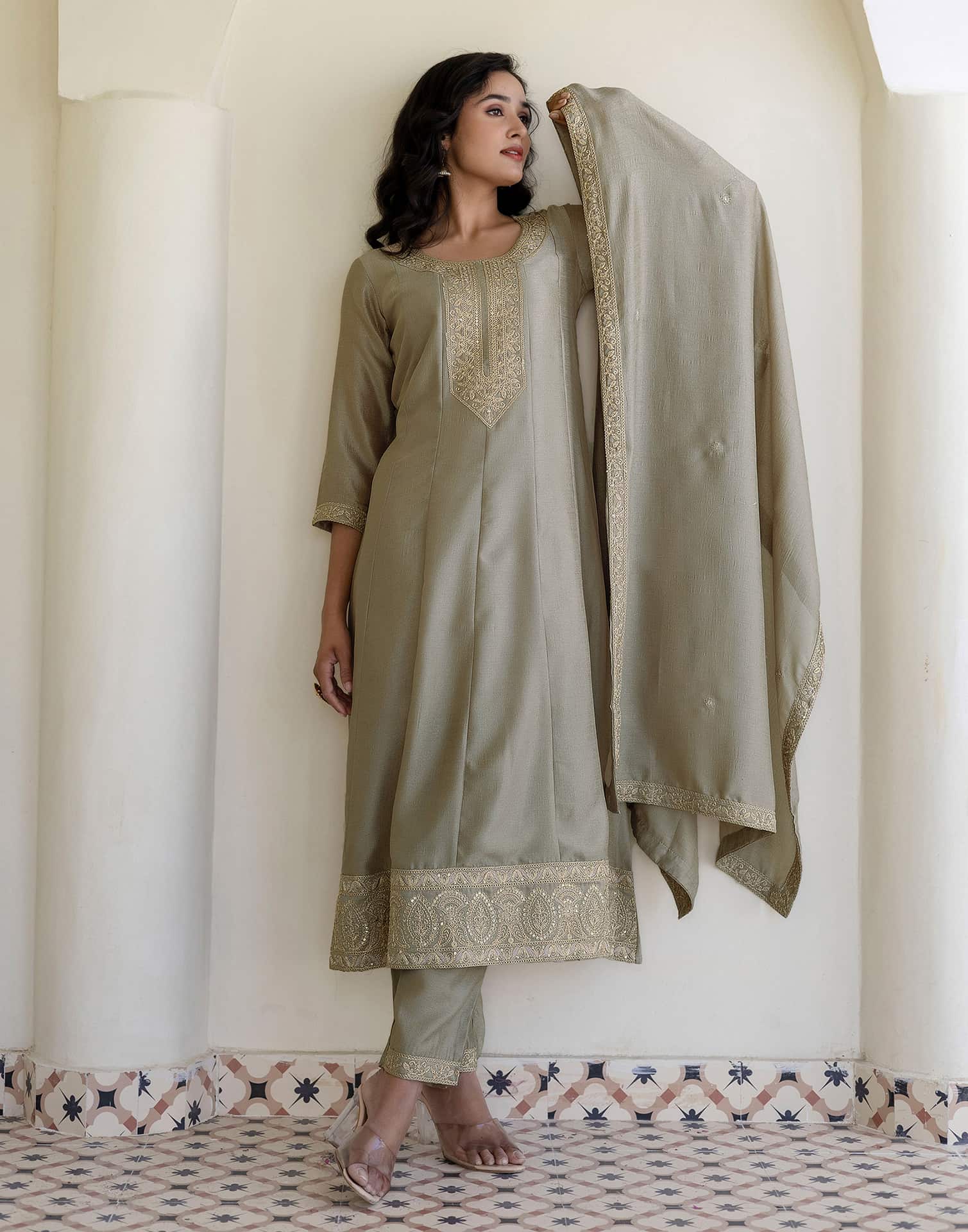 Crafted in Silk with exquisite Embroidered, this Beige kurta set is an essential for your ethnic wardrobe. The kurta comes with a Round Neck, paired with Palazzo and dupatta for a complete look. Ideal for Festive Wear, it ensures comfortable wear and high-quality fabric. A perfect choice for festive wear and traditional outfit lovers. Comfortable Wear, Comfortable Fit, Matching Bottoms.