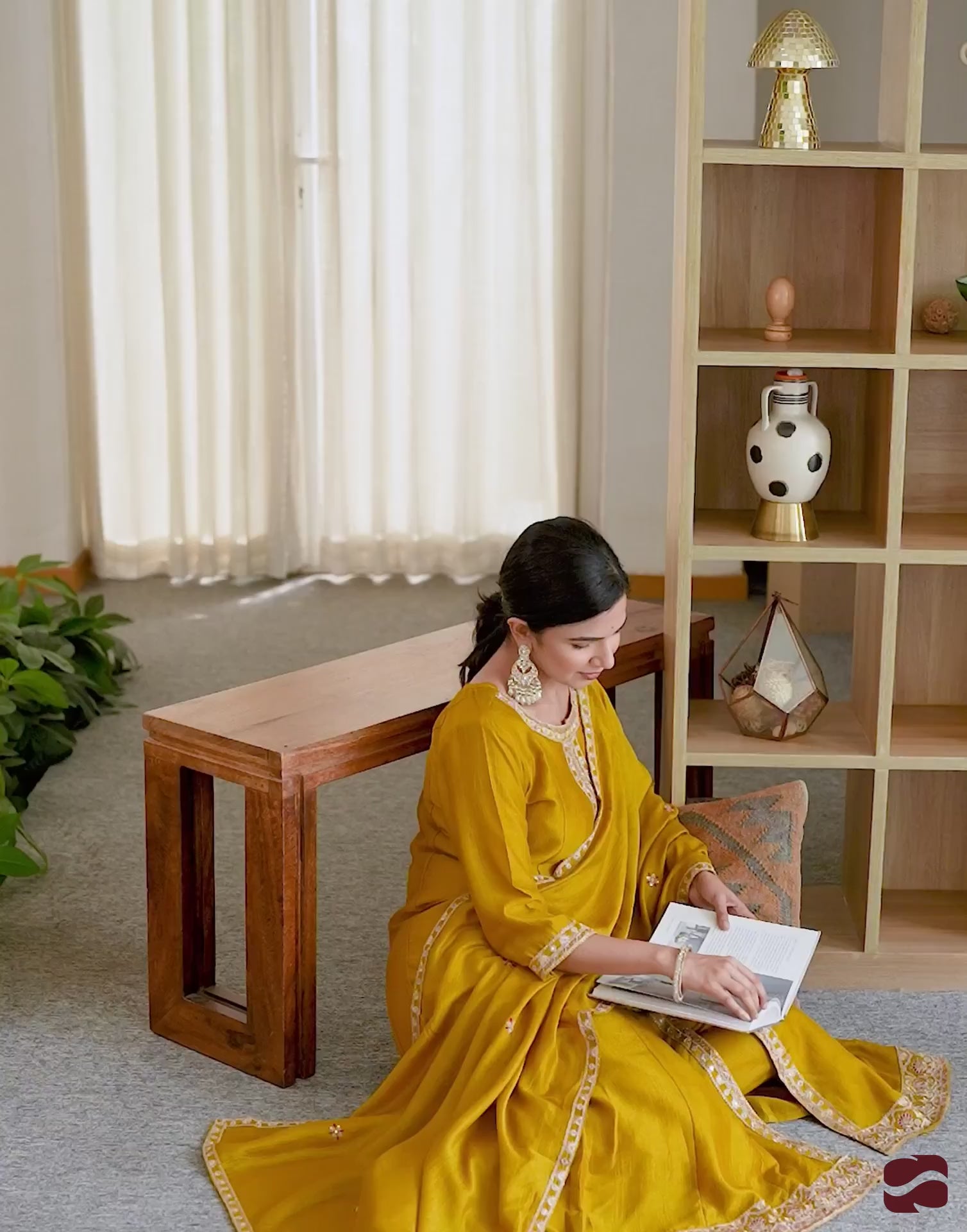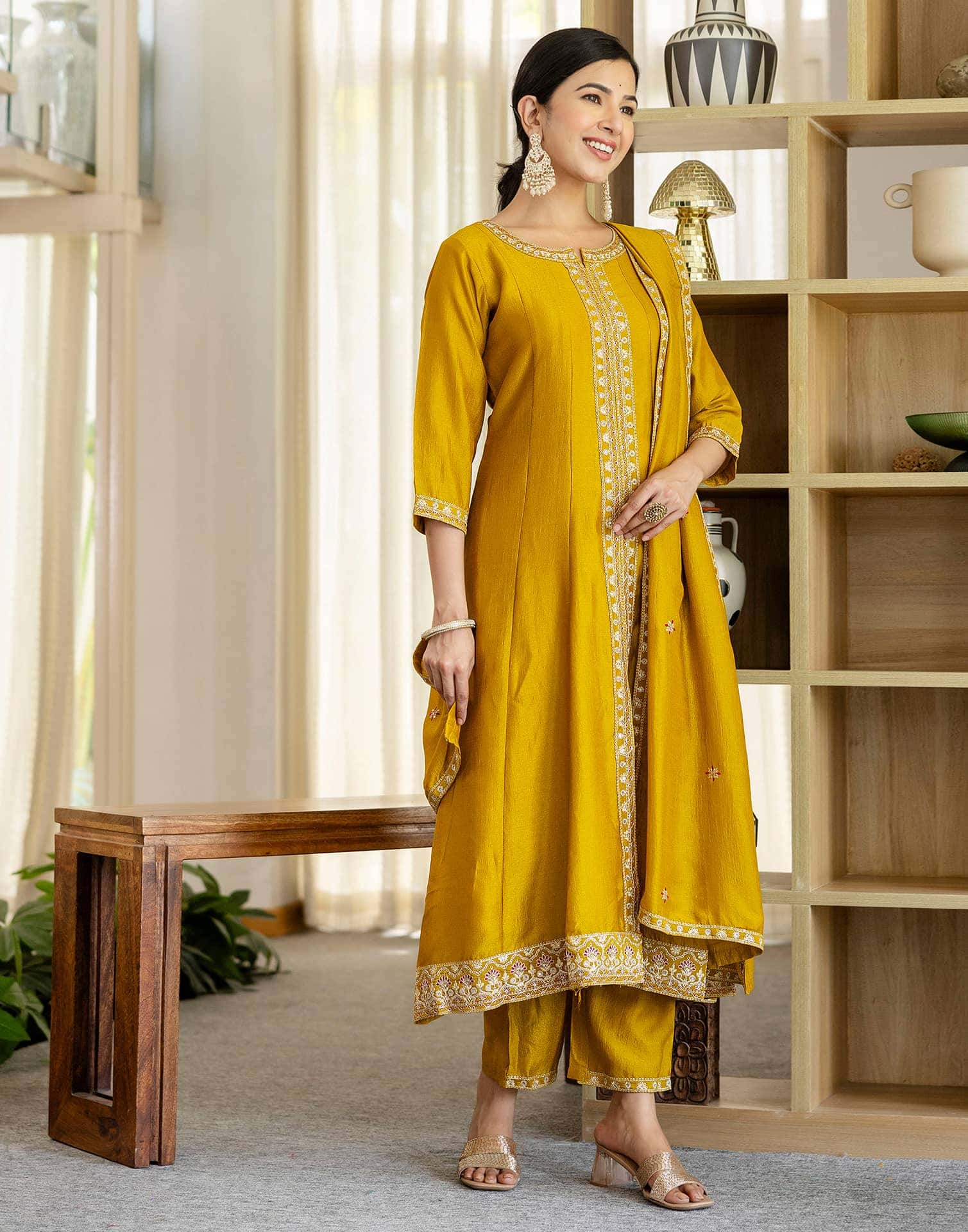 Elevate your ethnic wardrobe with this Silk kurta set in Mustard Yellow. Designed with Embroidery And Sequins Work and a V Neck, the kurta offers a comfortable fit and stylish finish. The set includes Palazzo and a dupatta, completing the look. Suitable for Wedding Wear, it combines premium fabric, all-day comfort, and modern design. Premium Fabric, Comfortable Wear, Breathable Kurta.