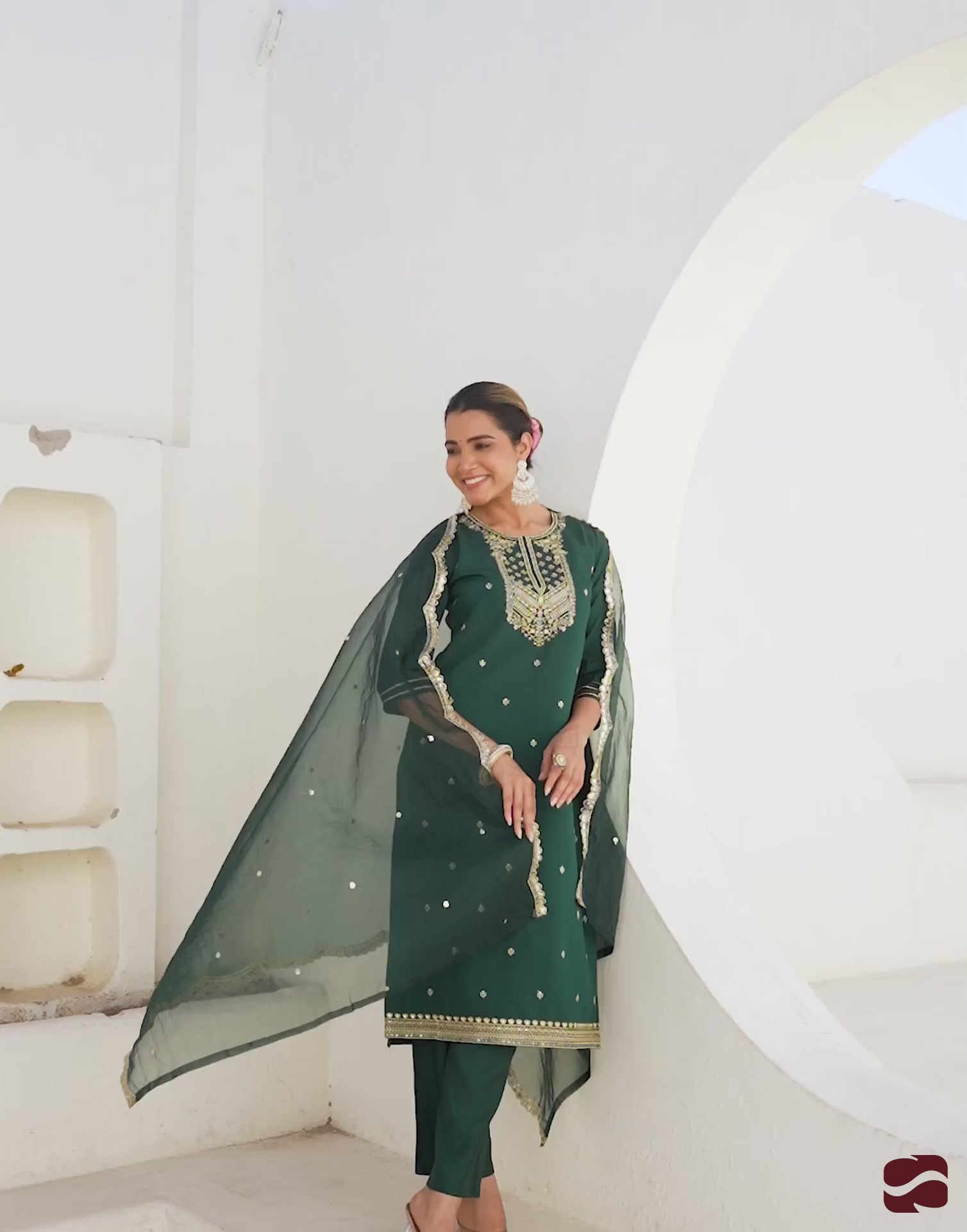 This Dark Green Silk kurta set with Embroidery And Sequins Work is crafted for women who love Indian wear with a modern twist. The kurta’s Round Neck and graceful cut enhance its style, while Pant With Pocket and dupatta complete the ensemble. Designed for Wedding Wear, it promises lightweight fabric, ease of movement, and lasting appeal. Complete Kurta Set, Traditional Occasion Outfit, Lightweight Fabric.