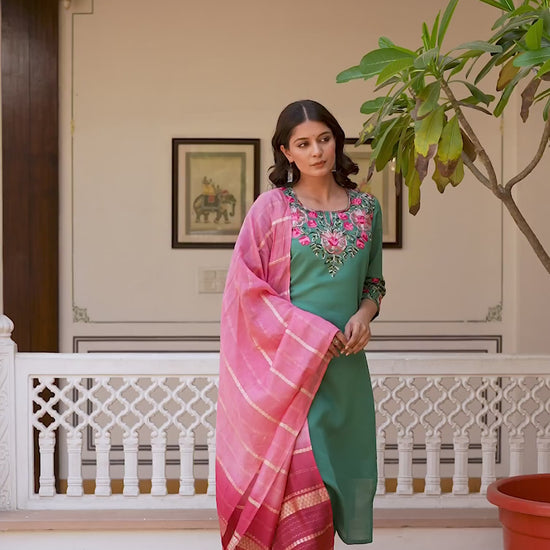 Silk Embroidery Work Straight Kurta with Pant & Dupatta