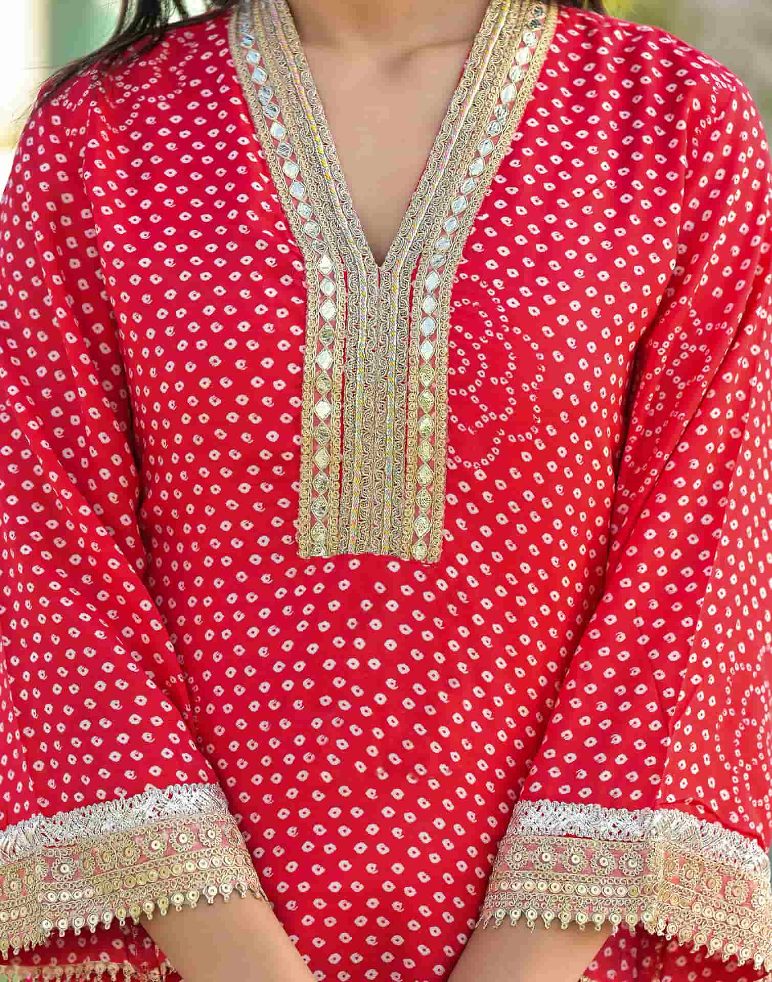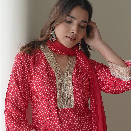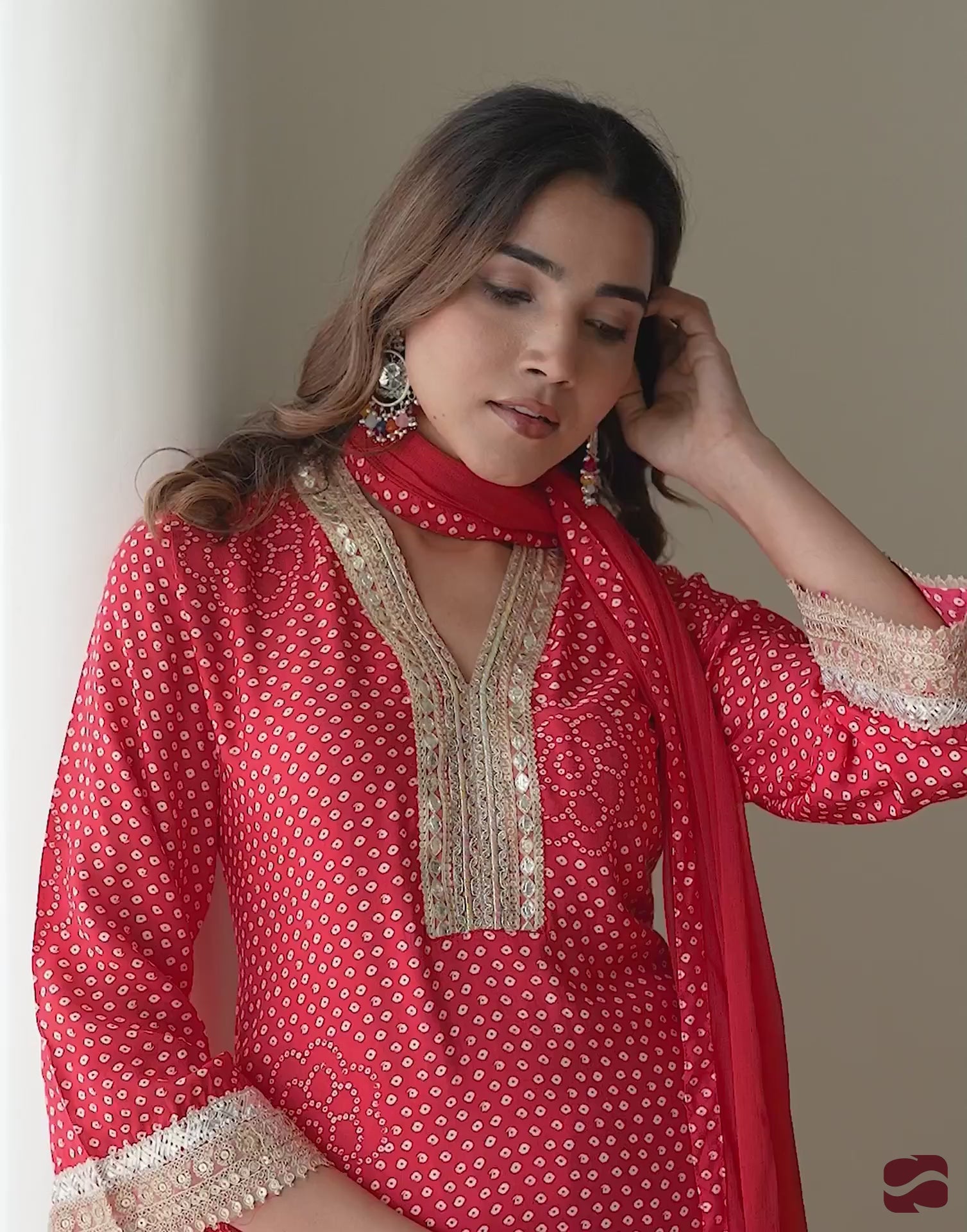 Step into sophistication with this Red Silk kurta set adorned with Bandhani Printed. The kurta features a V-Neck for a refined look, paired with Patiala and dupatta. Perfect for Festive Wear, it delivers all-day comfort, high-quality fabric, and effortless style. Matching Bottoms, Complete Kurta Set, Ethnic Wear for Women.