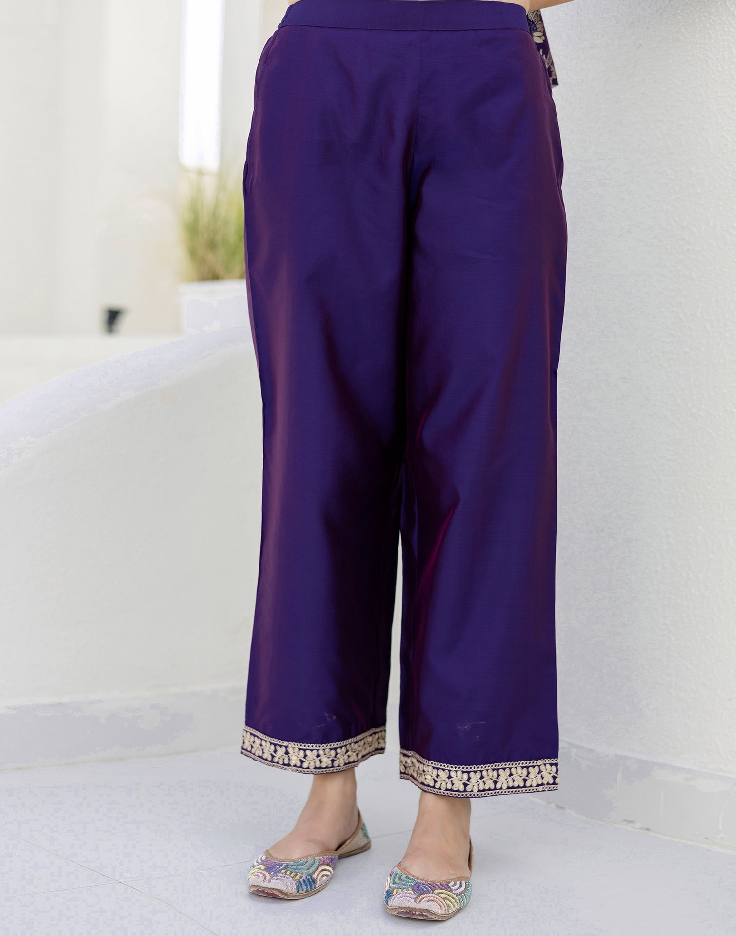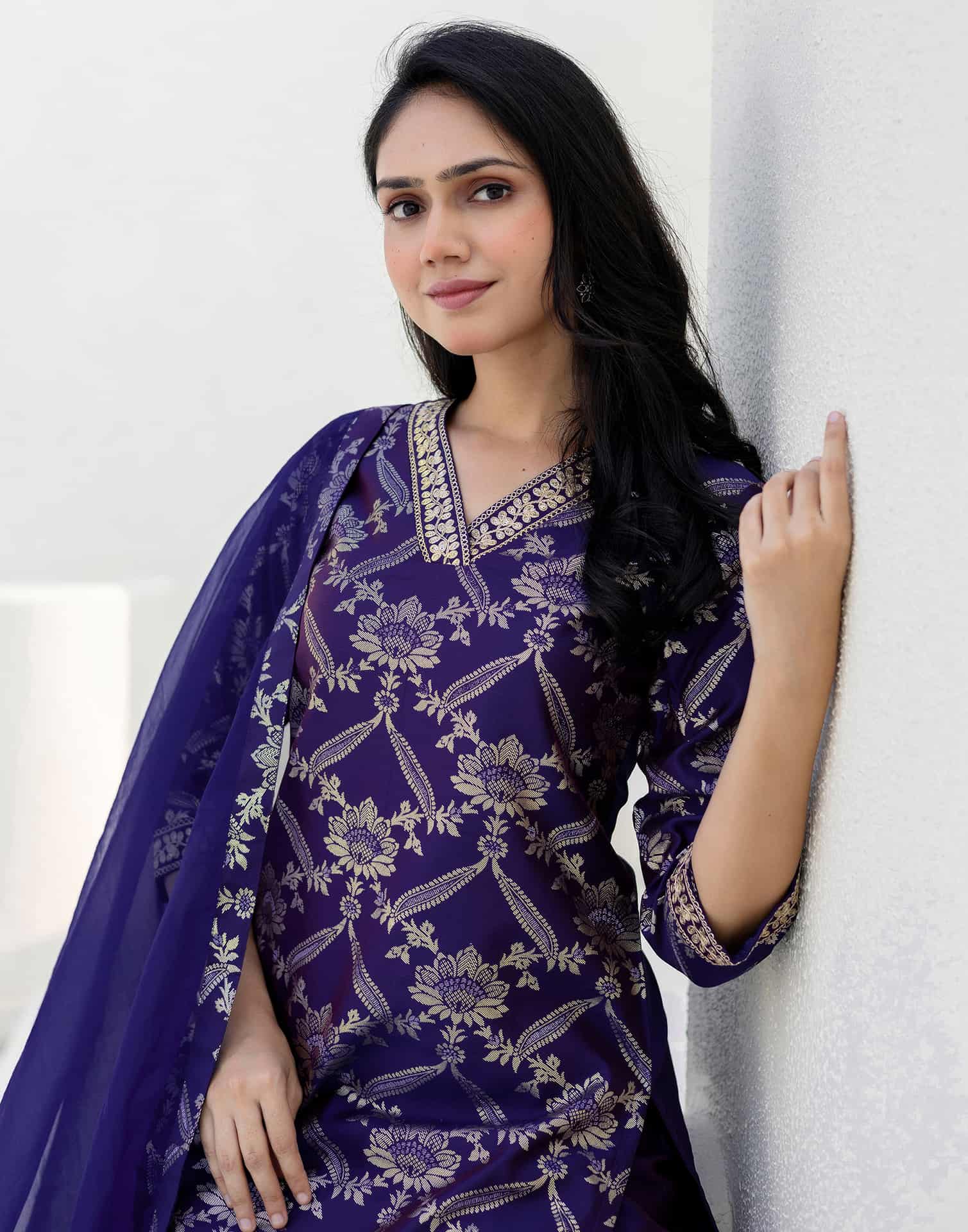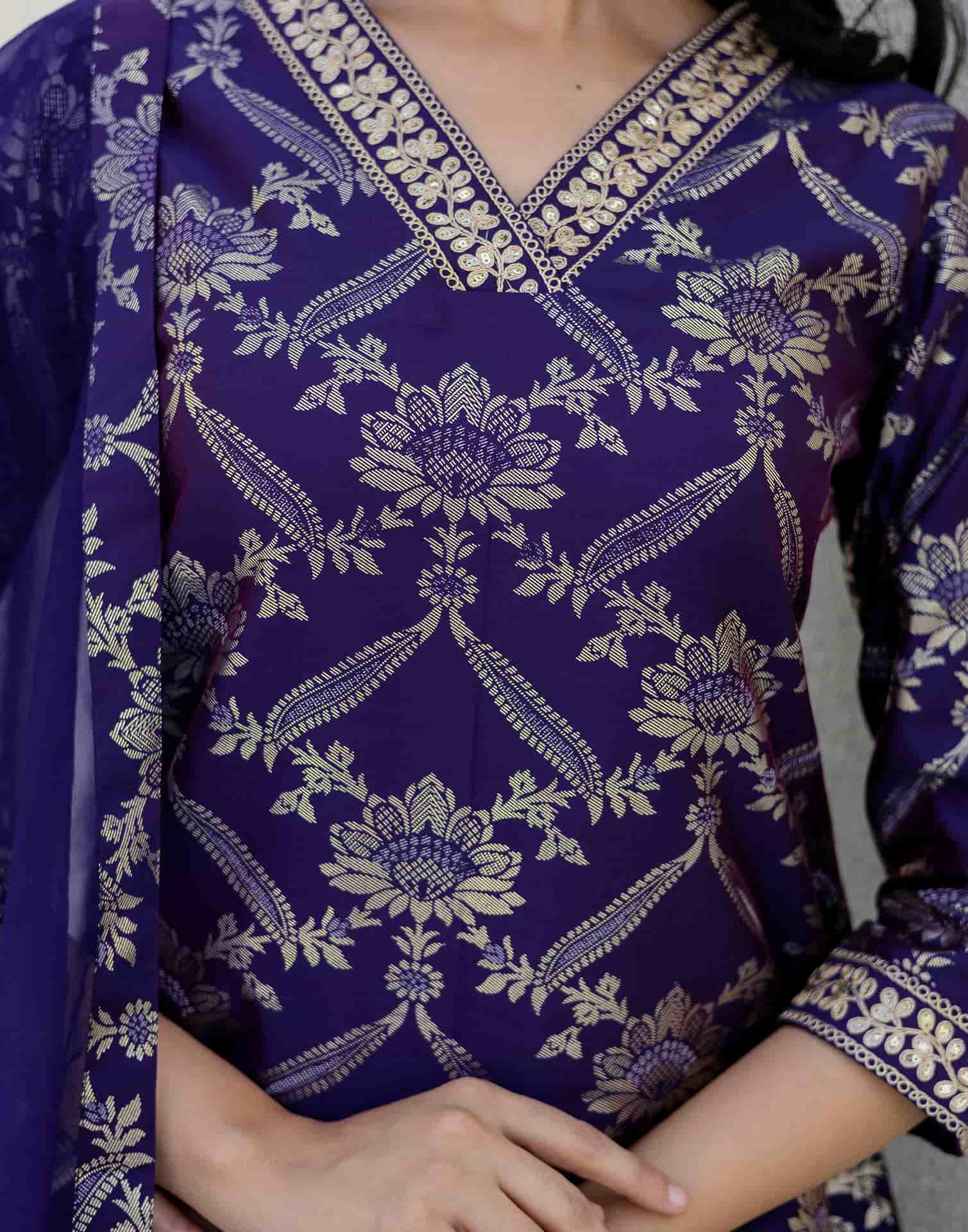 Experience the beauty of tradition with this Purple Silk kurta set. Adorned with Foil Printed and styled with a V-Neck, the kurta exudes sophistication. Complemented with Palazzo and an elegant dupatta, this complete outfit is ideal for Festive Wear. Crafted in India with premium fabric, it ensures ease of movement and effortless elegance. Semi-formal Wear, Lightweight Fabric, Soft & Breathable Fabric.