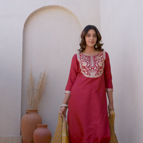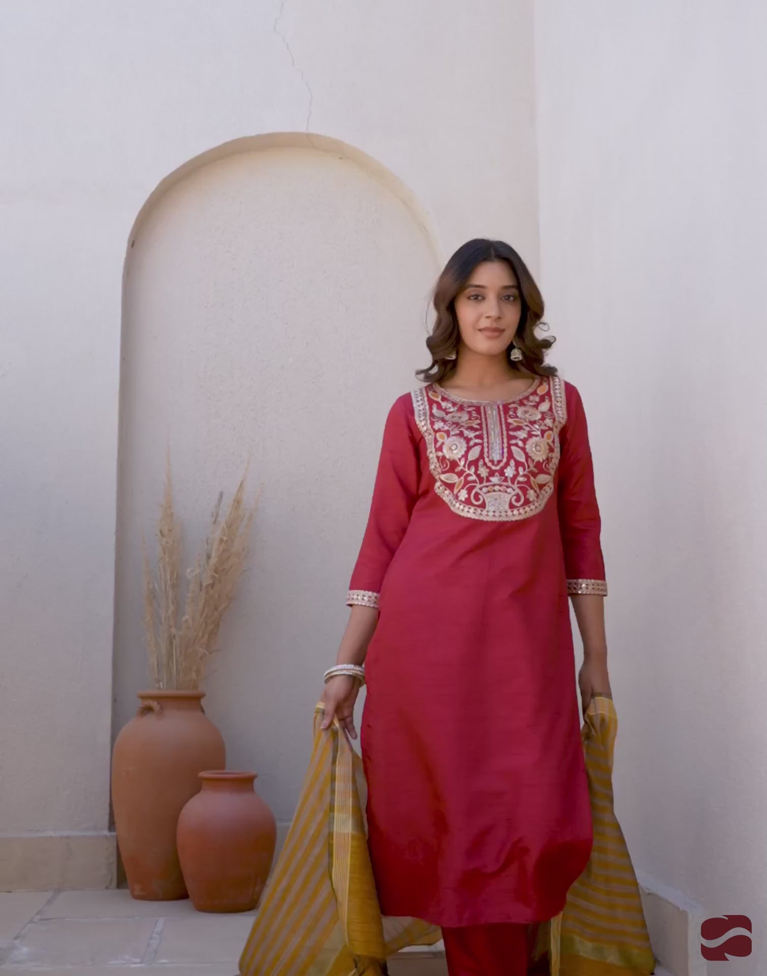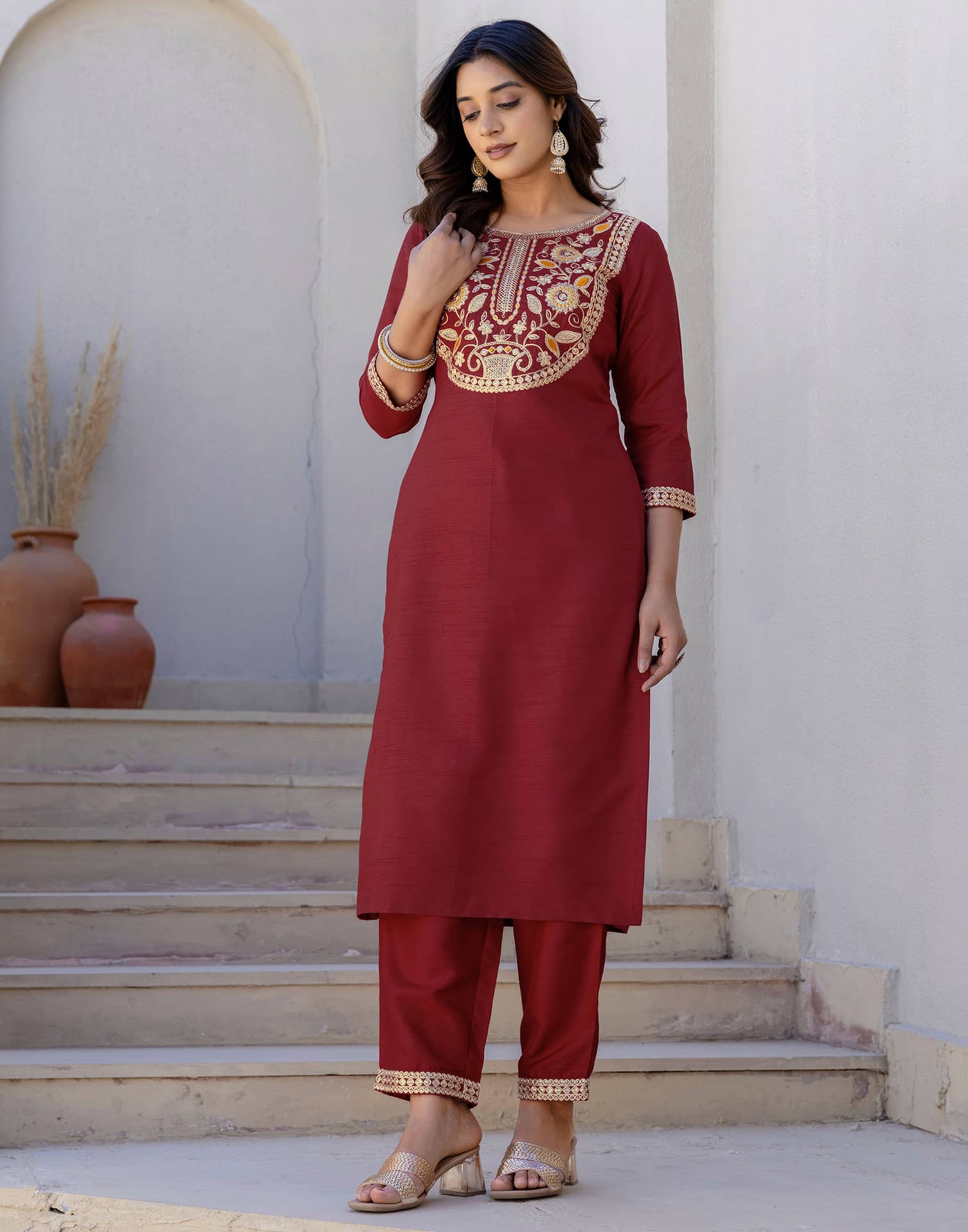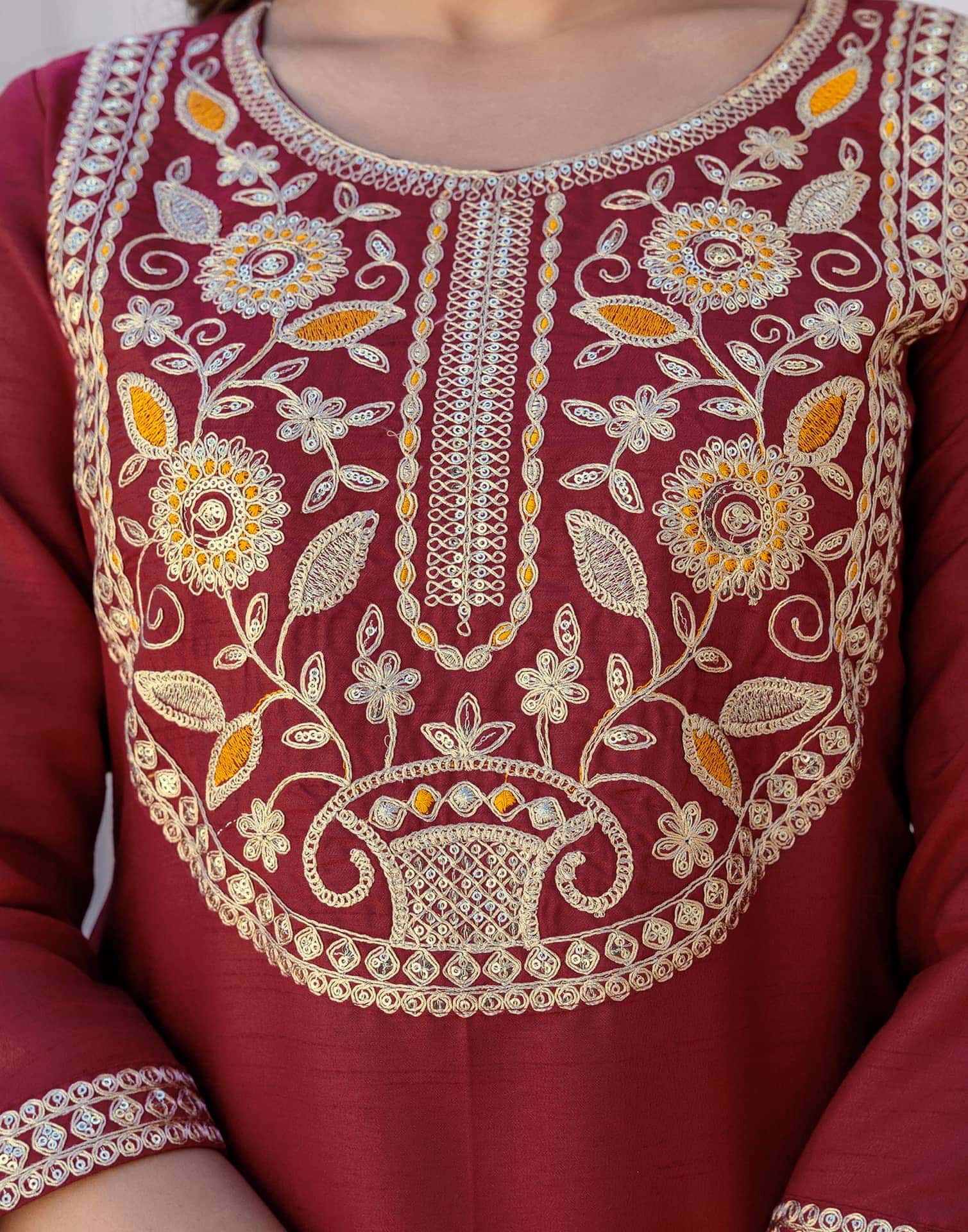 Step into sophistication with this Maroon Silk Blend kurta set adorned with Sequence. The kurta features a Round Neck for a refined look, paired with Pant With Pocket and dupatta. Perfect for Wedding Wear, it delivers all-day comfort, premium fabric, and effortless style. All-day Comfort, Breathable Kurta, Festive Wear.