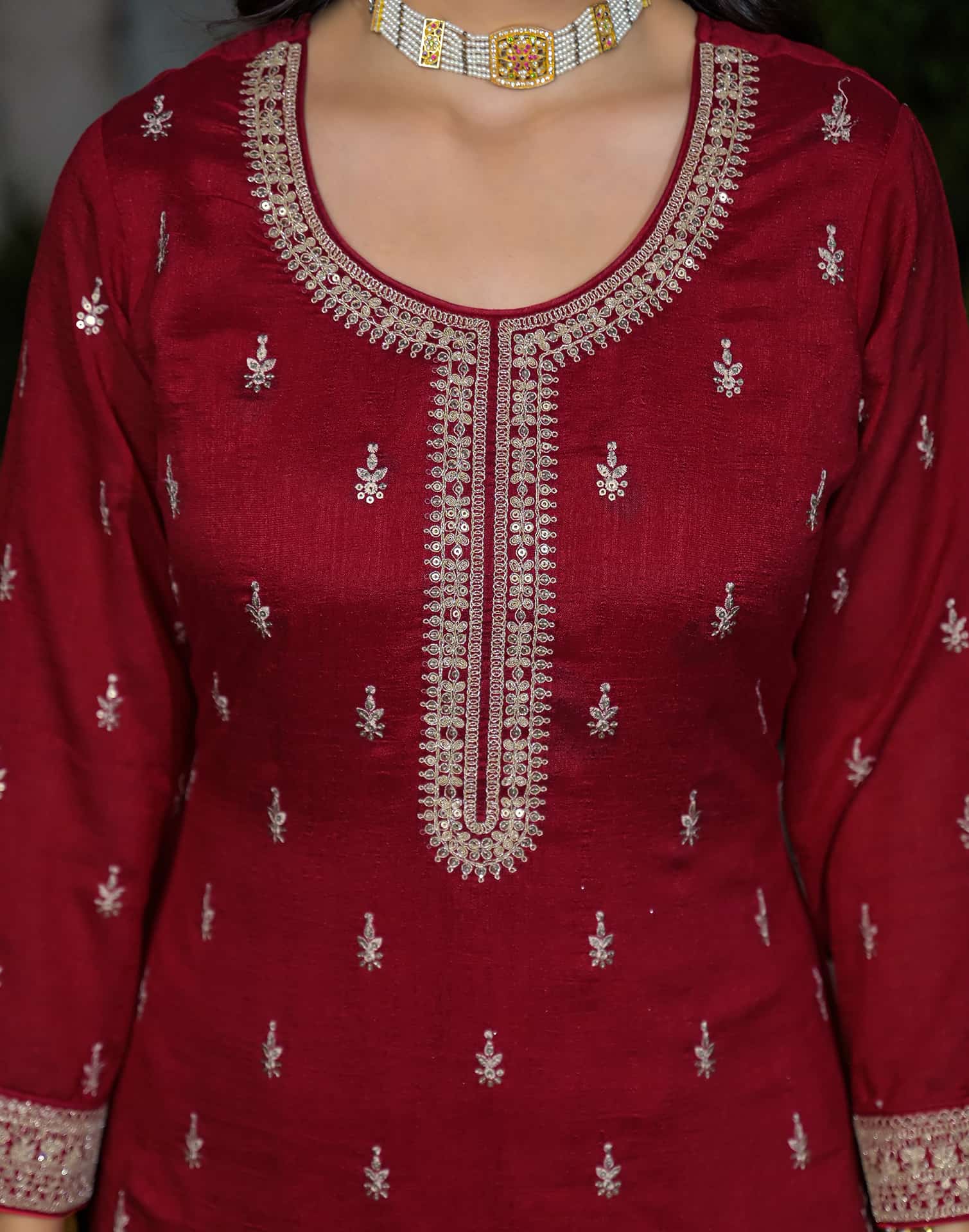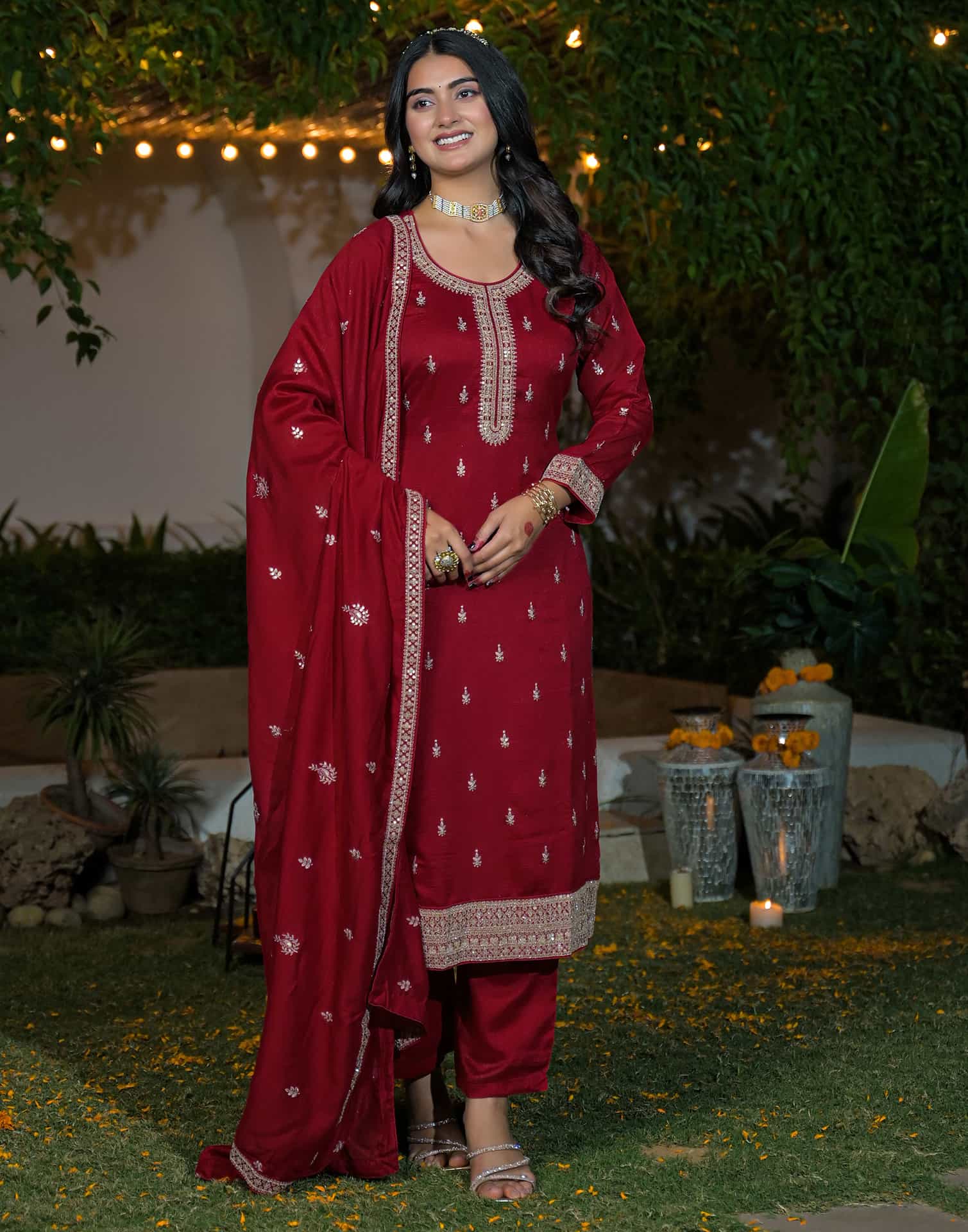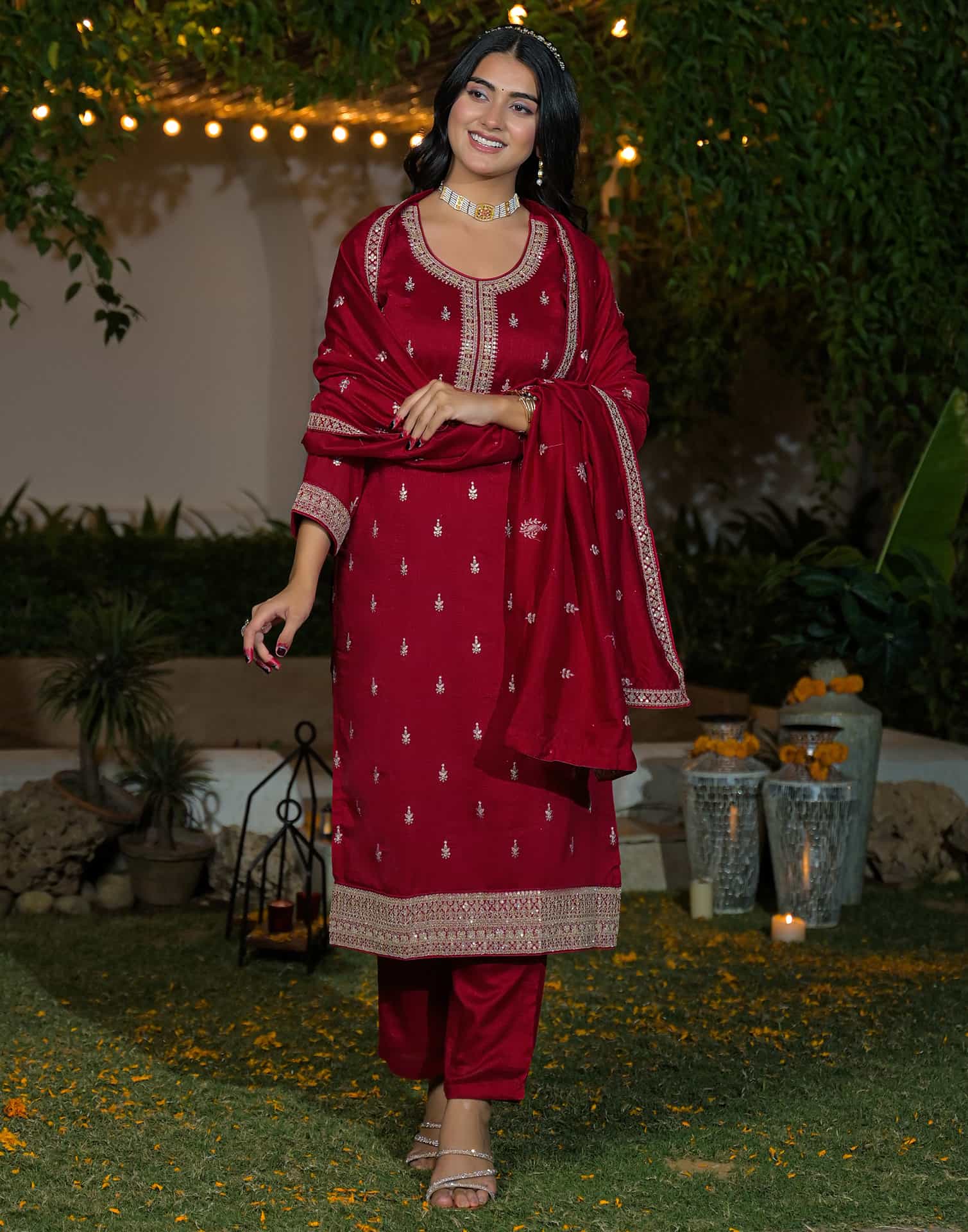 Silk Straight Embroidery Round Neck Kurta with Pant & Dupatta