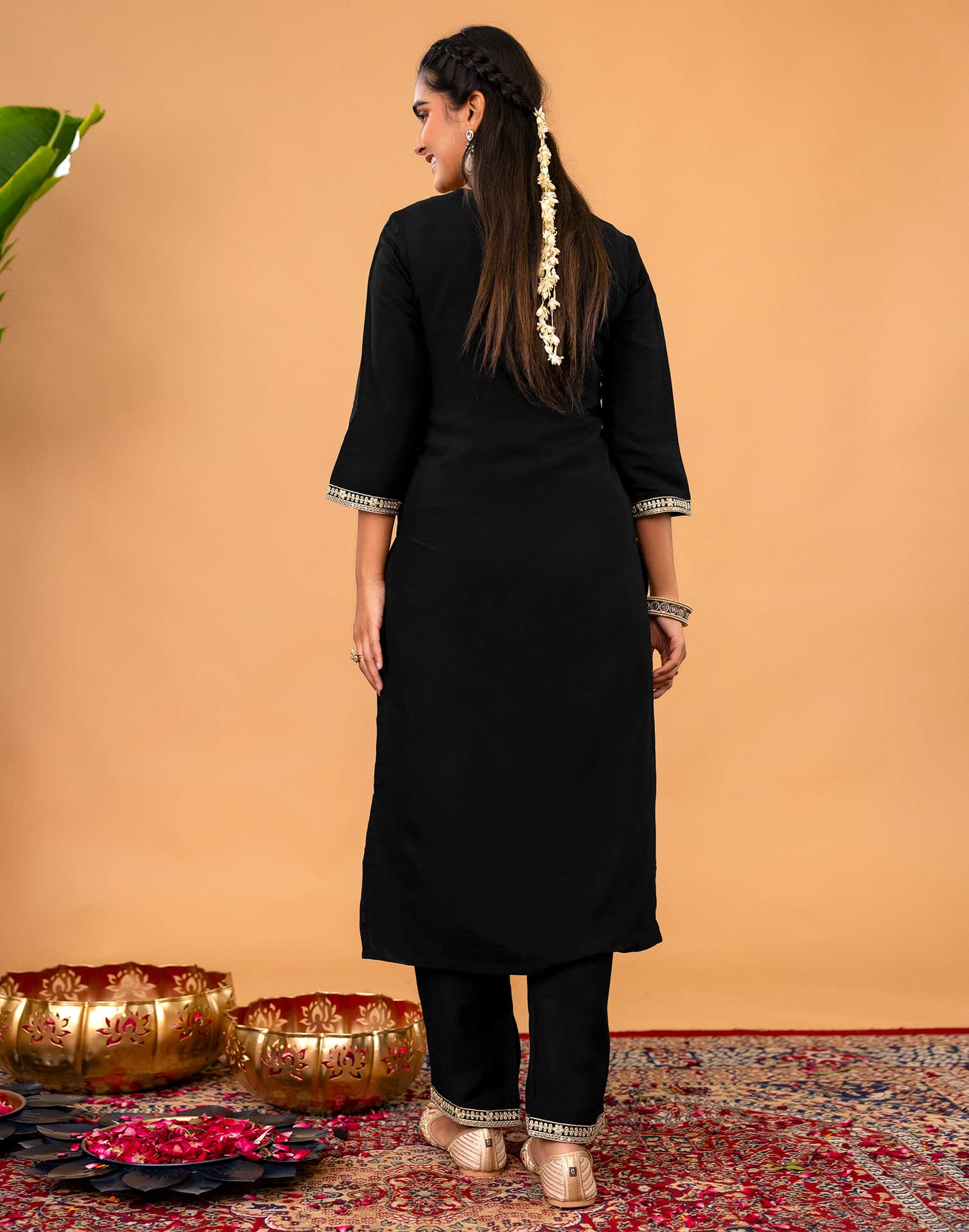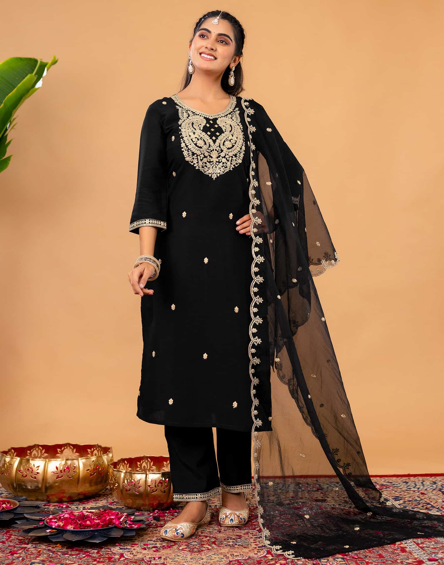 Silk Straight Embroidery Round Neck Kurta with Pant & Dupatta