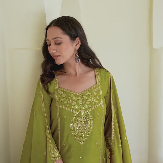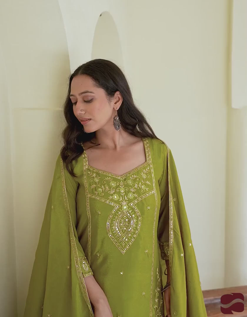 Silk Straight Embroidery Square Neck Kurta with Pant & Dupatta
