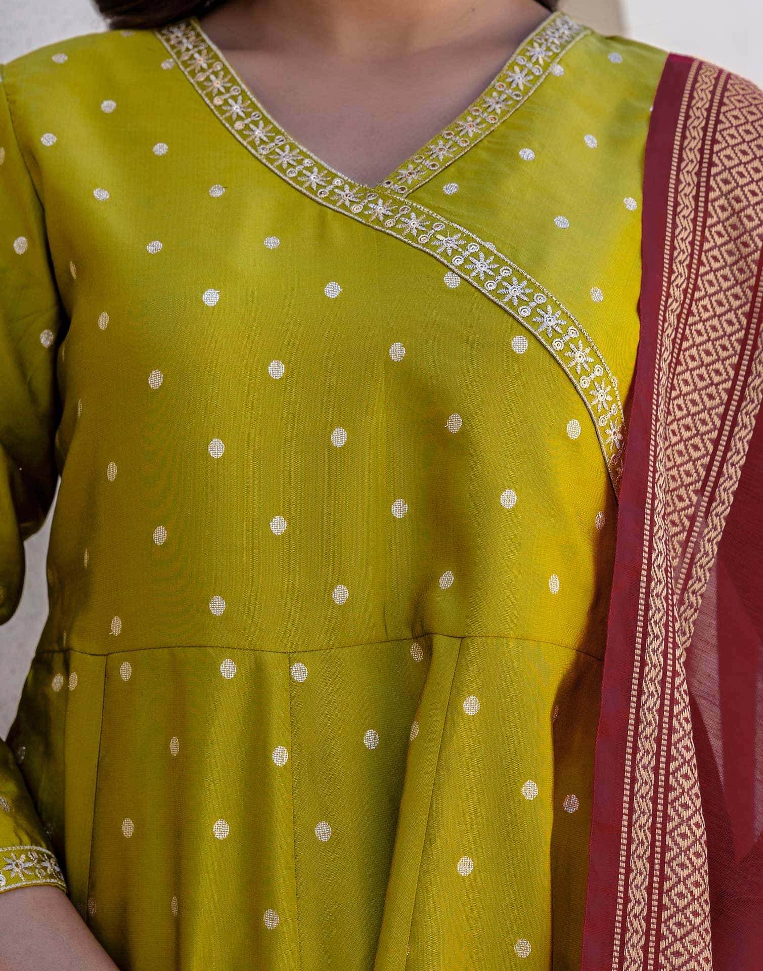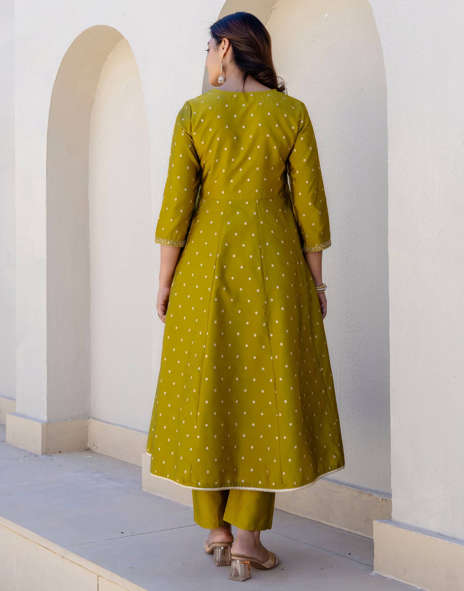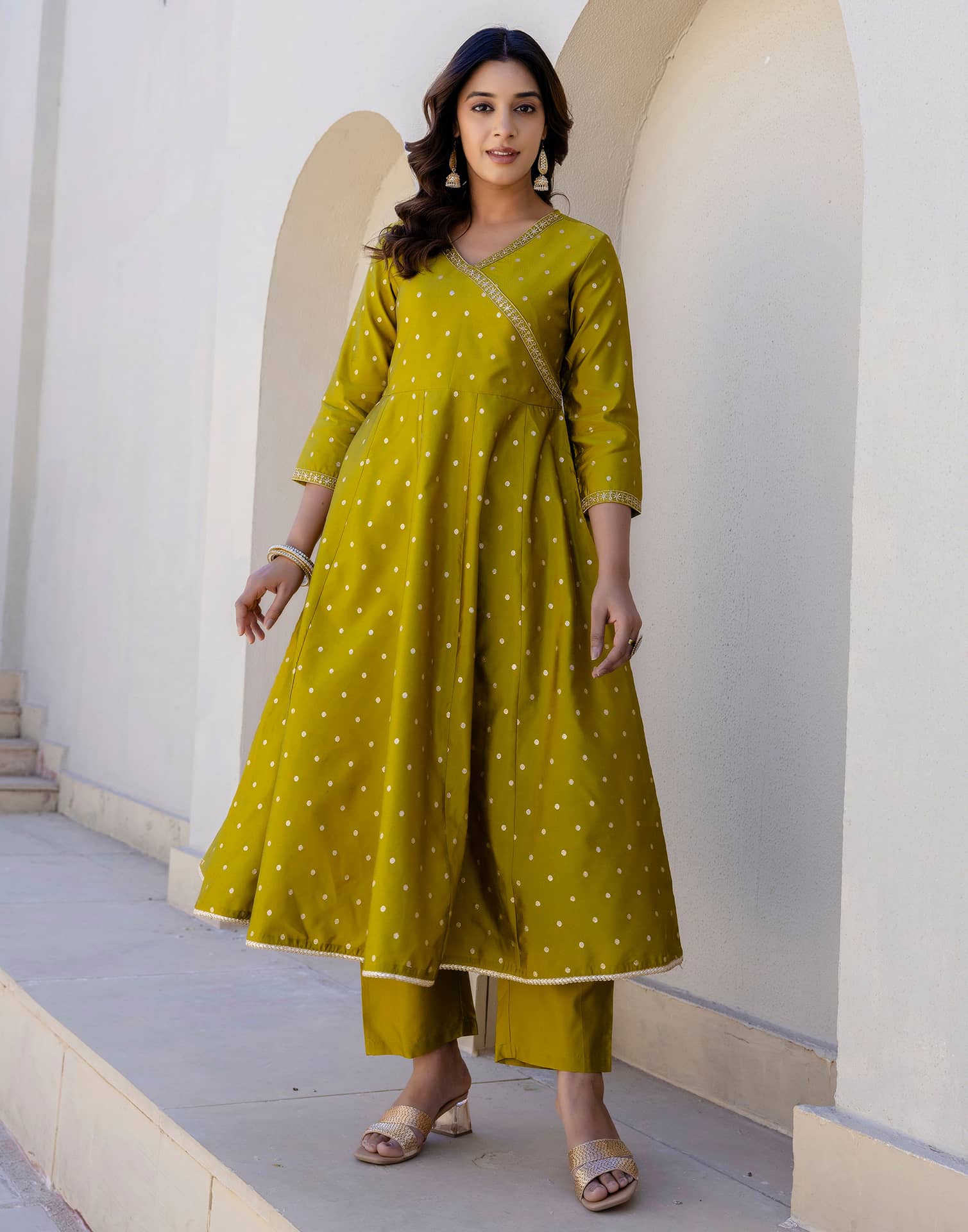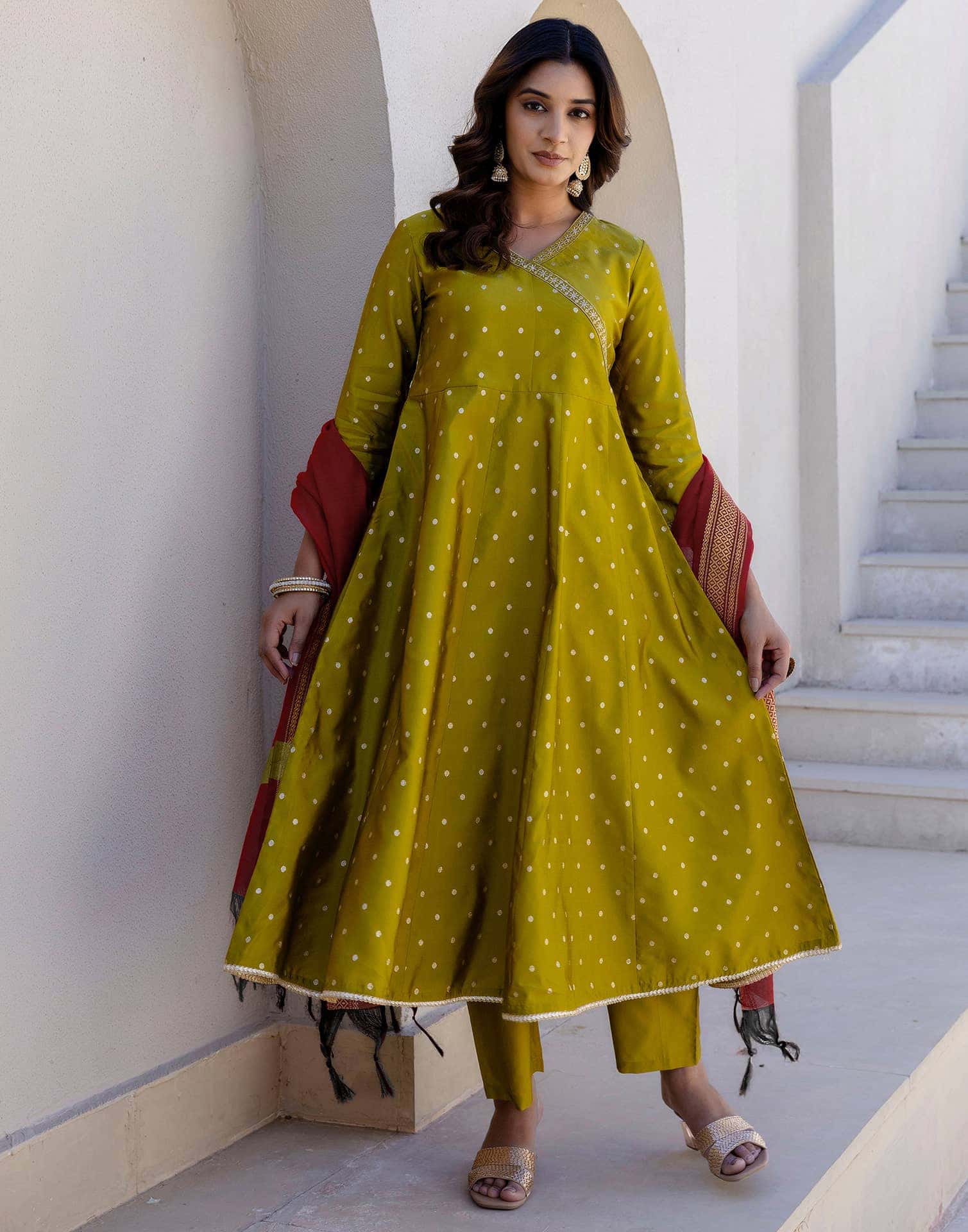 Bring elegance to every occasion with this Mustard Green Silk Blend kurta set. Featuring Weaving on the kurta and a V Neck, it radiates traditional charm. Styled with Pant With Pocket and dupatta, this outfit is ideal for Festive Wear. Its high-quality fabric ensures breathability and ease of movement, while the dupatta adds a touch of grace. Festive Wear, Graceful Silhouette, Traditional Occasion Outfit.