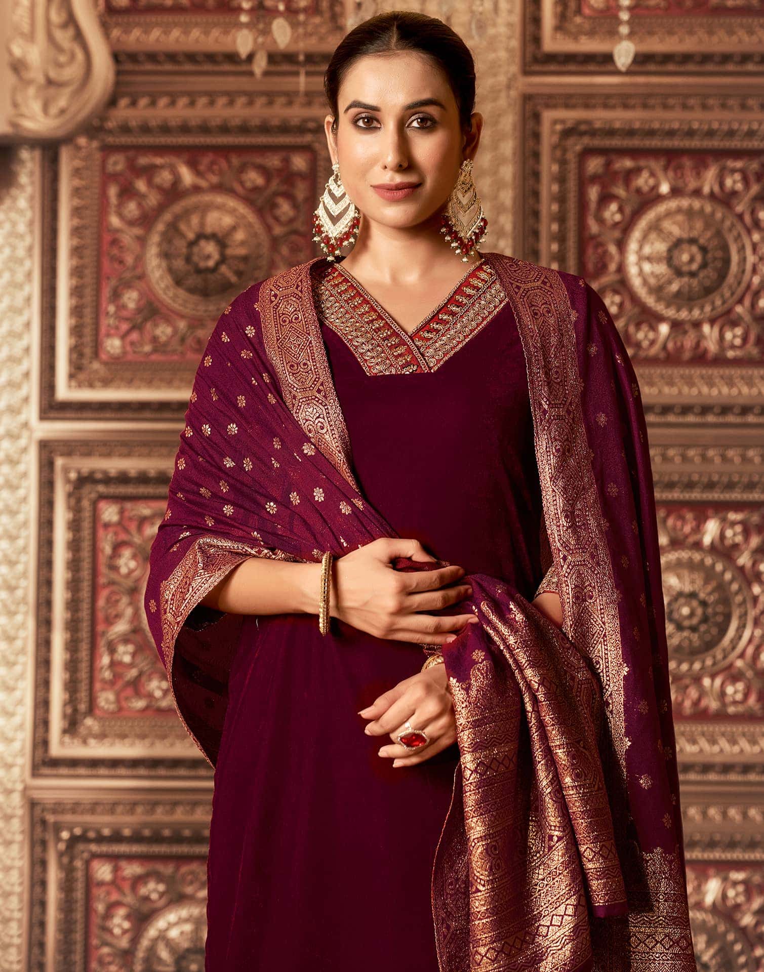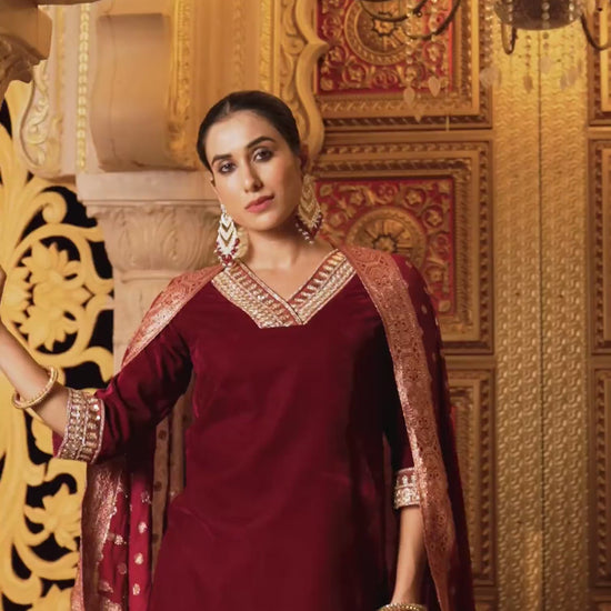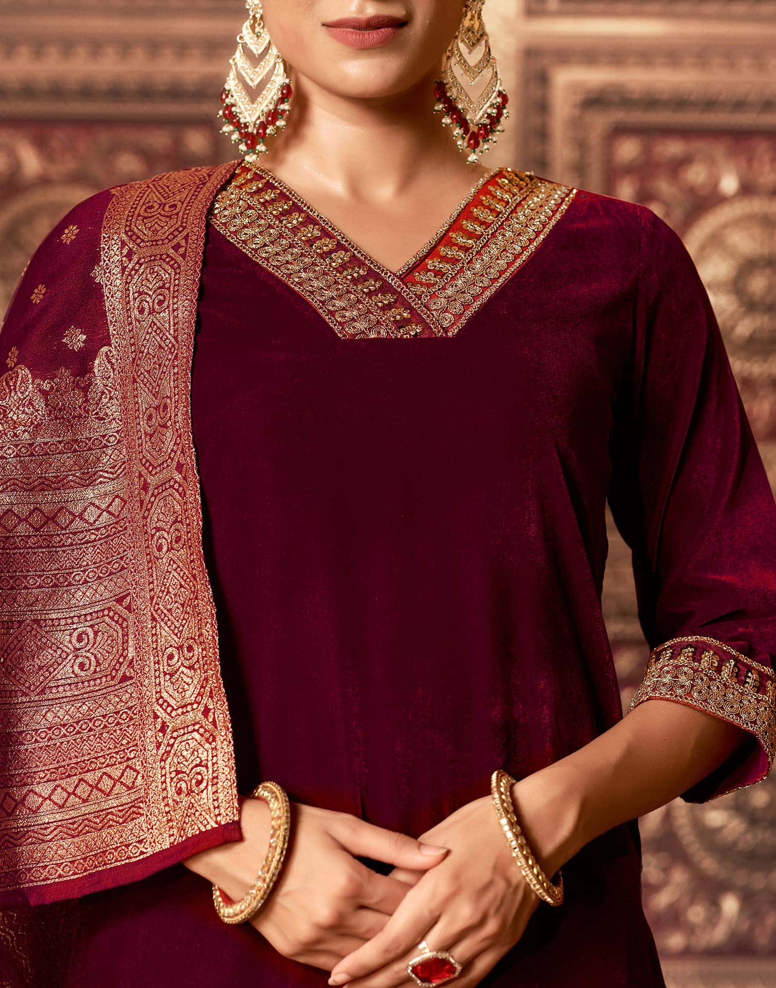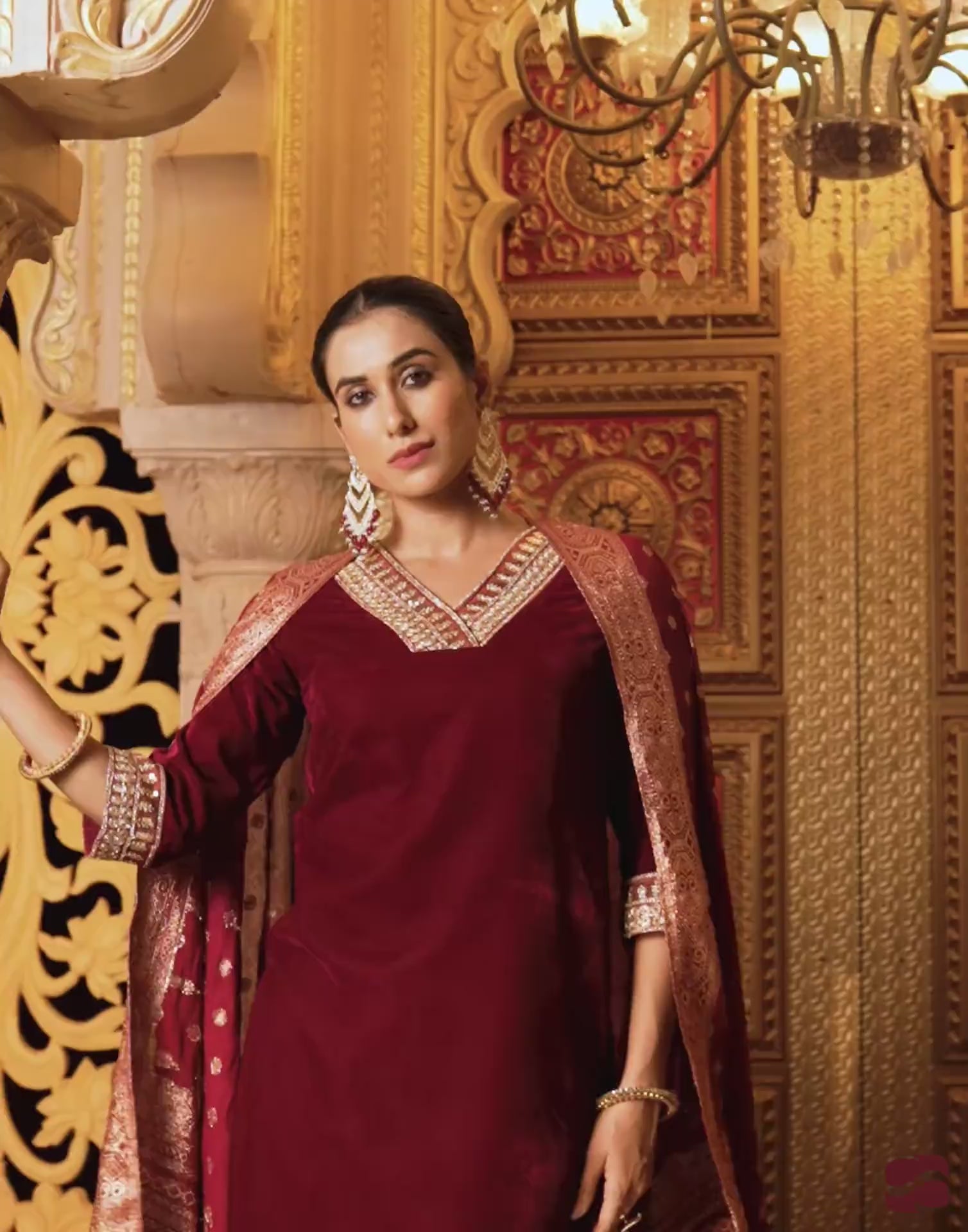 Elevate your ethnic wardrobe with this Velvet kurta set in Maroon. Designed with Plain and a V Neck, the kurta offers a comfortable fit and stylish finish. The set includes Pant and a dupatta, completing the look. Suitable for Festive Evening Wear, it combines high-quality fabric, comfortable wear, and modern design. Traditional Outfit, Graceful Silhouette, Festive Wear.