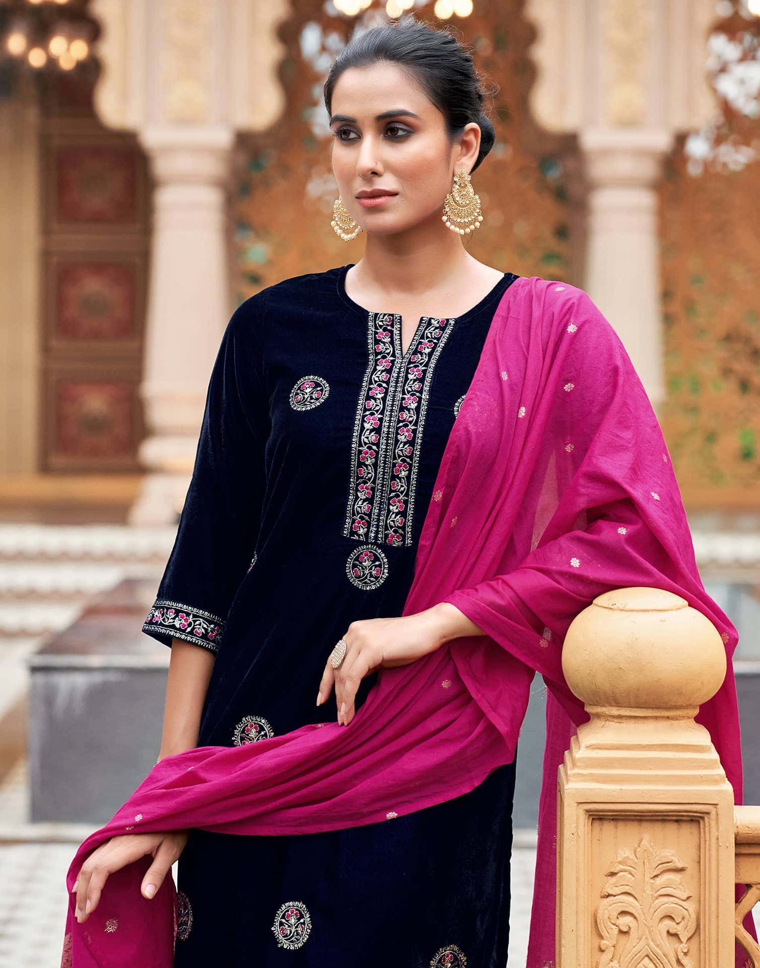 Step into sophistication with this Navy Blue Velvet kurta set adorned with Plain. The kurta features a V Neck for a refined look, paired with Pant and dupatta. Perfect for Festive Evening Wear, it delivers all-day comfort, premium fabric, and effortless style. High-quality Fabric, Comfortable Fit, Indian Wear.