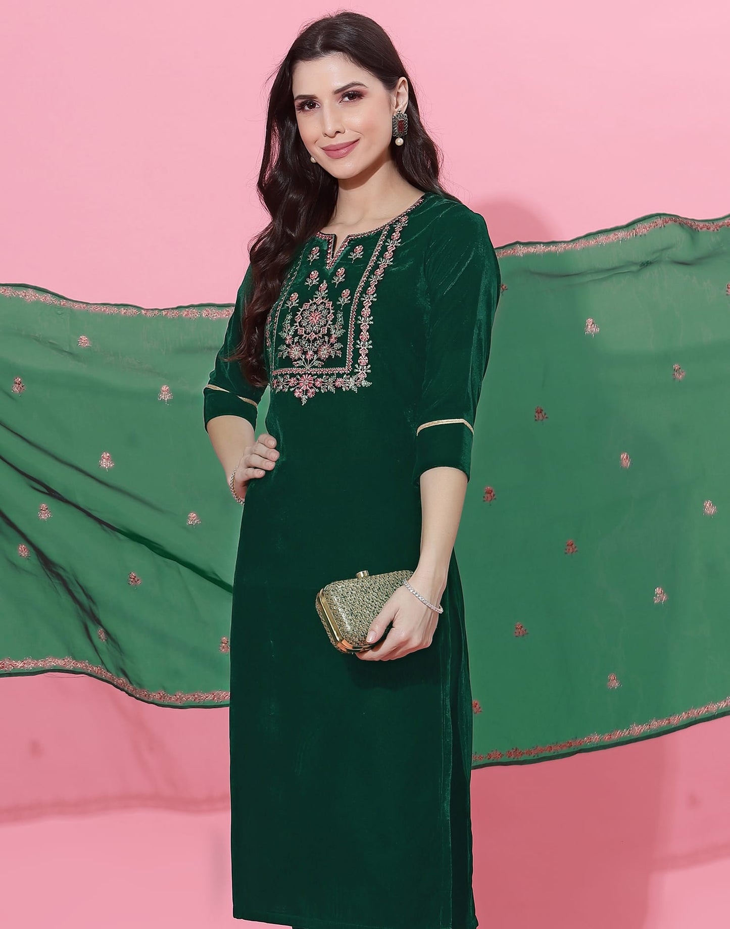 Velvet Embroidered Straight Kurta with Pant & Dupatta