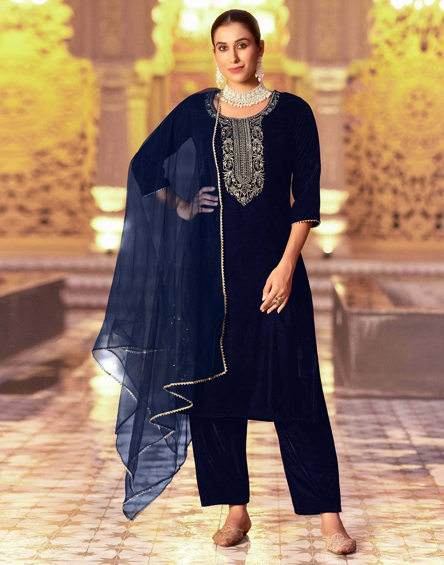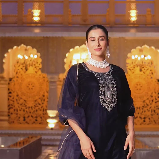 This Navy Blue Velvet kurta set with Sequence And Embroidery is crafted for women who love Indian wear with a modern twist. The kurta’s Round Neck and graceful cut enhance its style, while Pant and dupatta complete the ensemble. Designed for Wedding Wear, it promises premium fabric, ease of movement, and lasting appeal. Everyday Wear, Complete Kurta Set, Semi-formal Wear.