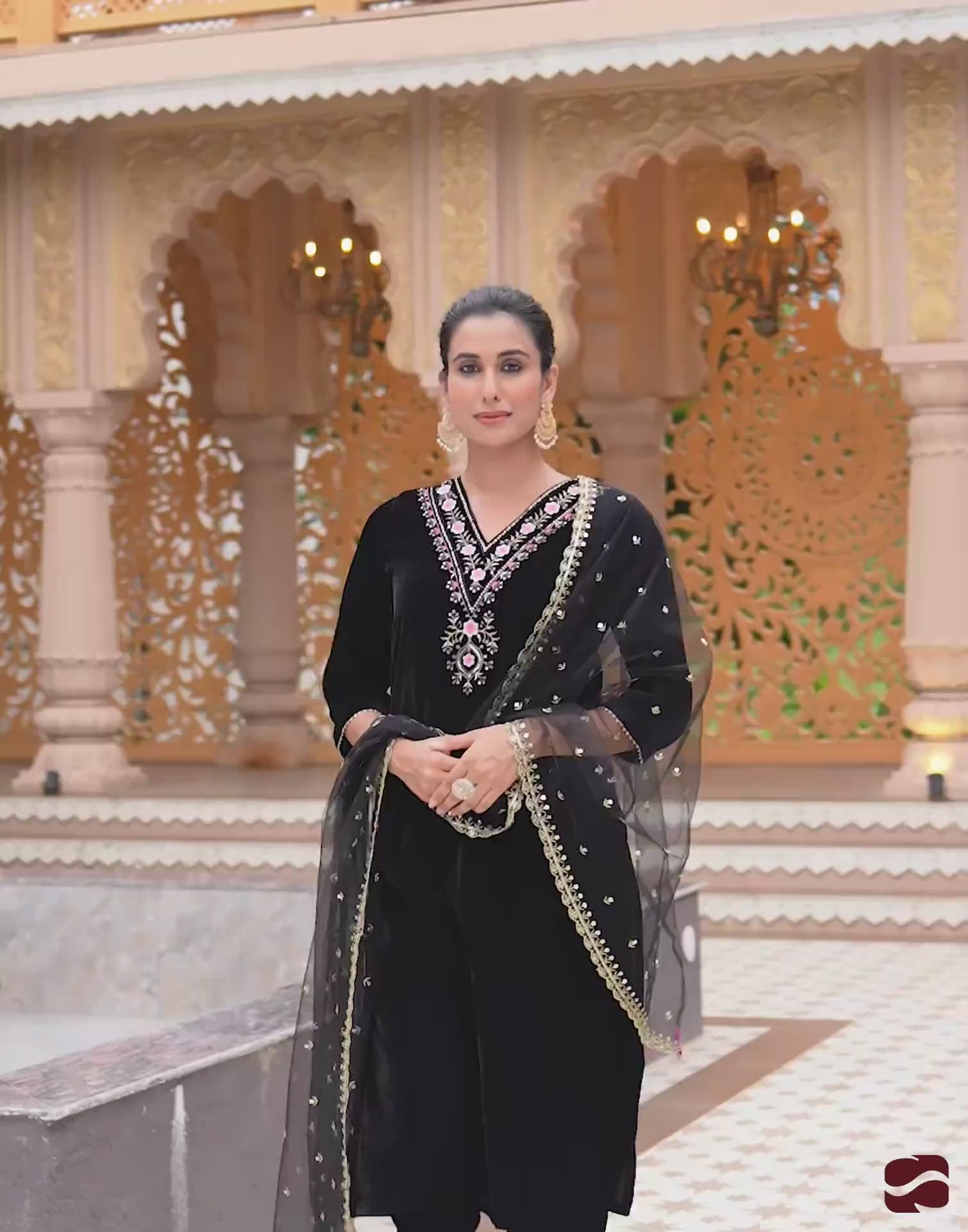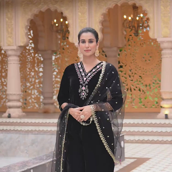 Bring elegance to every occasion with this Black Velvet kurta set. Featuring Sequence And Embroidery on the kurta and a V Neck, it radiates traditional charm. Styled with Pant and dupatta, this outfit is ideal for Wedding Wear. Its lightweight fabric ensures breathability and comfortable wear, while the dupatta adds a touch of grace. Everyday Wear, Traditional Occasion Outfit, Elegant Dupatta.