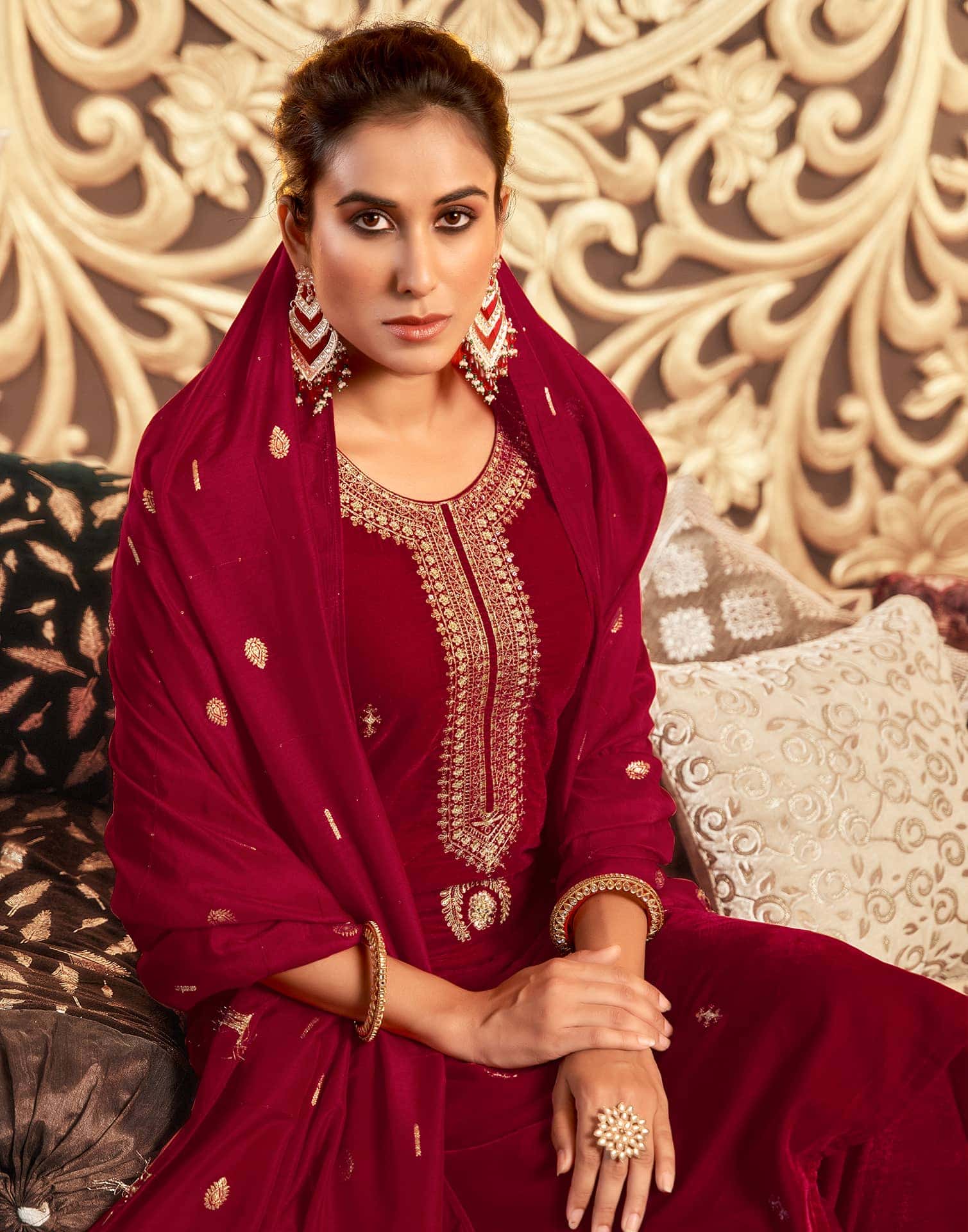 Elevate your ethnic wardrobe with this Velvet kurta set in Red. Designed with Sequence and a Round Neck, the kurta offers a comfortable fit and stylish finish. The set includes Pant With Pocket and a dupatta, completing the look. Suitable for Party Wear, it combines premium fabric, all-day comfort, and modern design. Traditional Outfit, Breathable Kurta, Soft & Breathable Fabric.