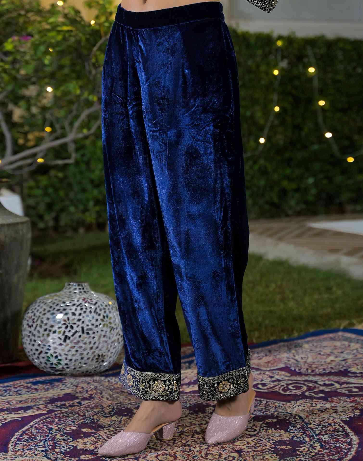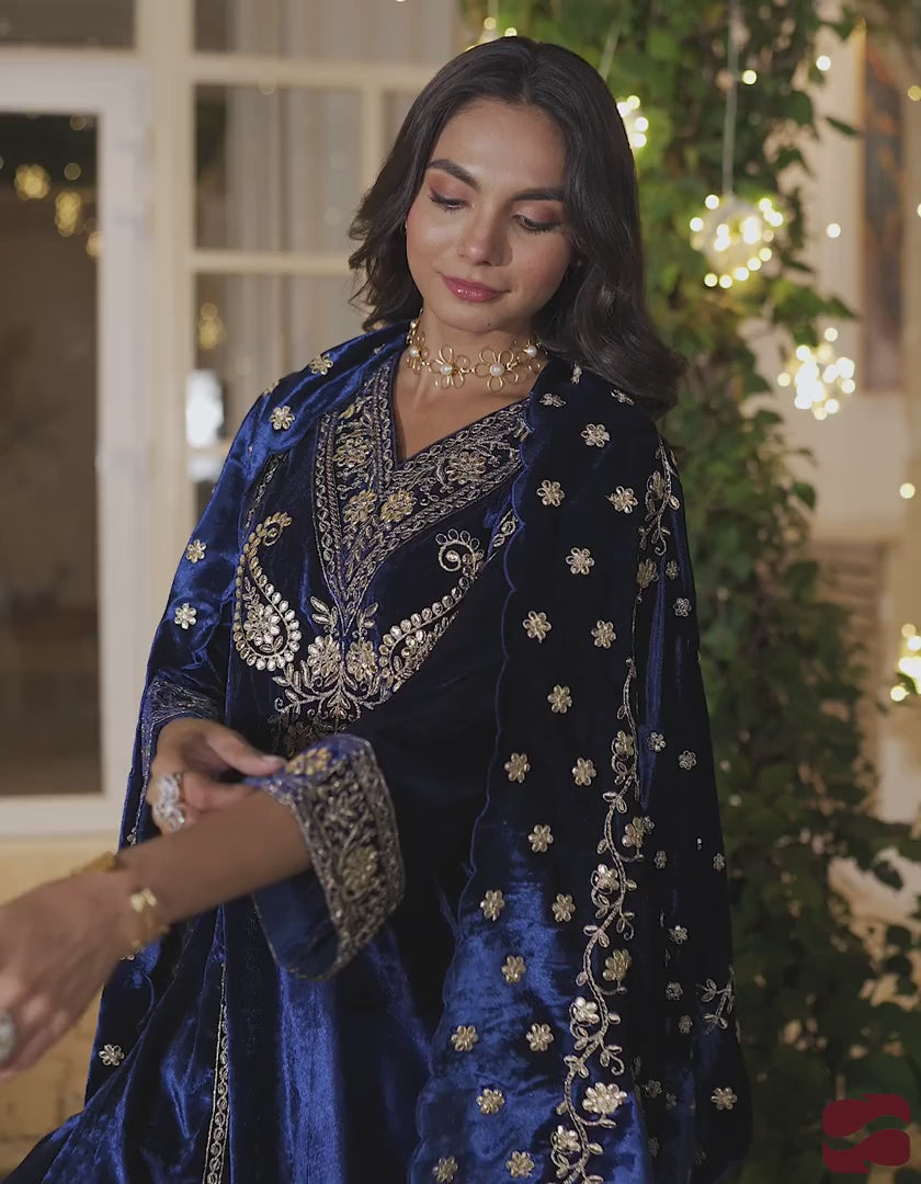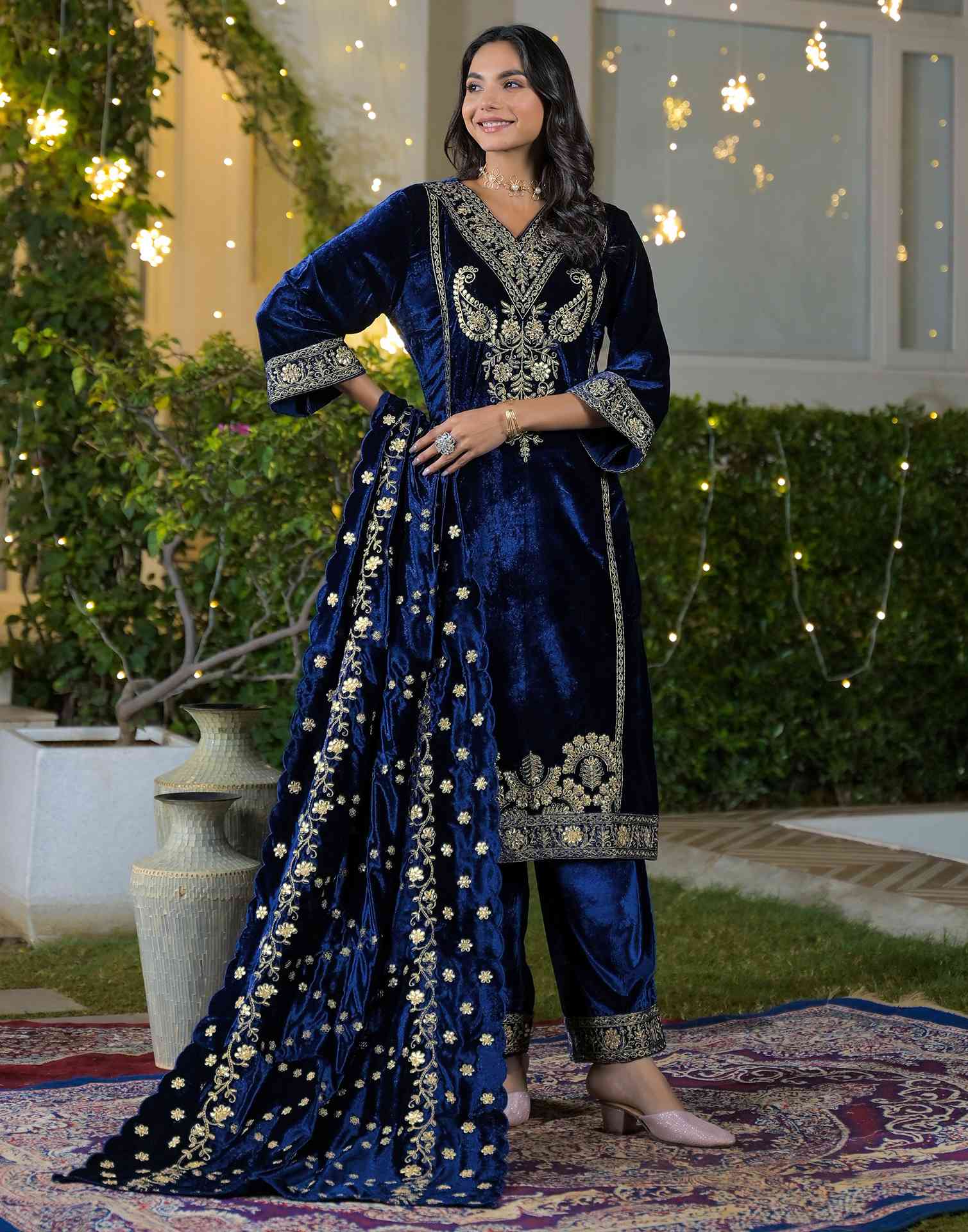 Velvet Straight Embroidered V-Neck Kurta with Pant & Dupatta