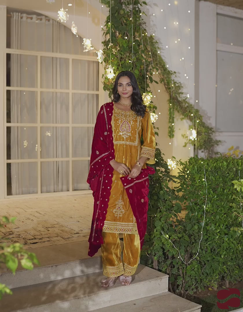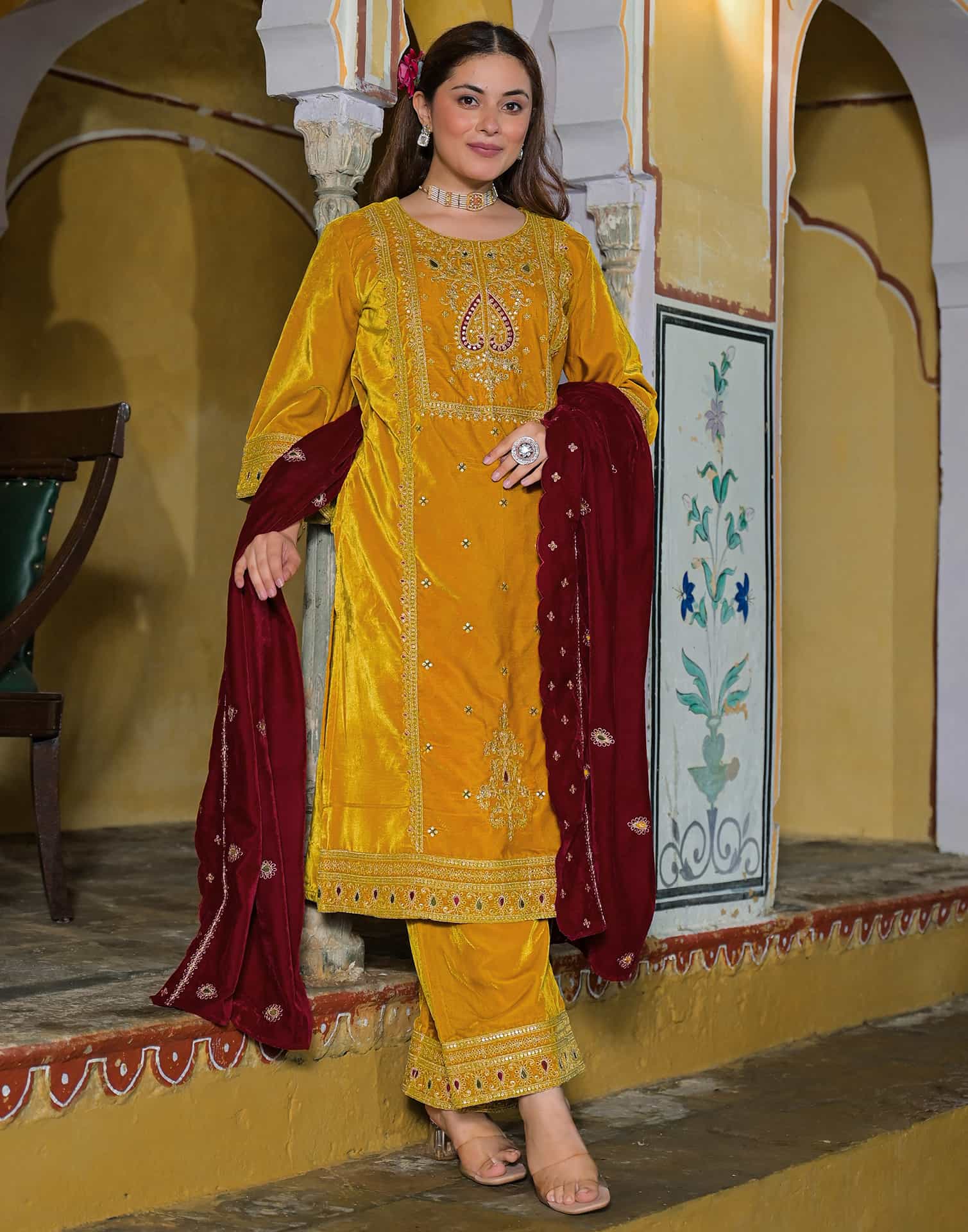 Velvet Straight Embroidery Round Neck Kurta with Pant & Dupatta
