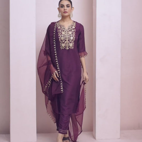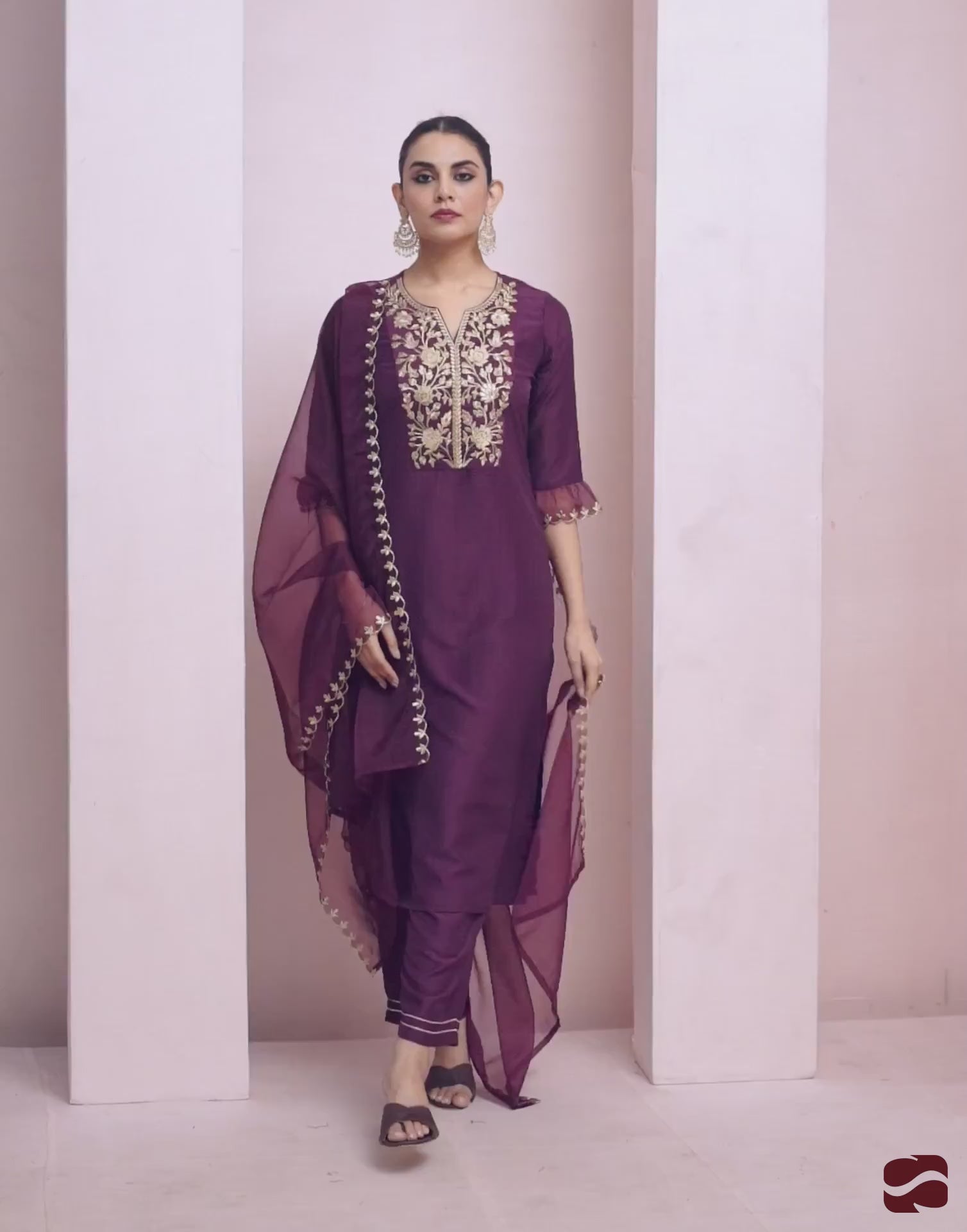 Wine Silk Plain V Neck 3/4 Sleeve Straight Kurta Set With Pant & Dupatta