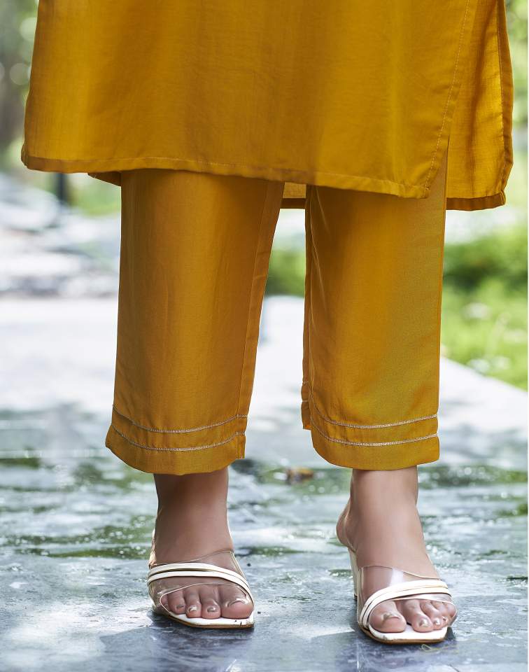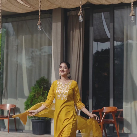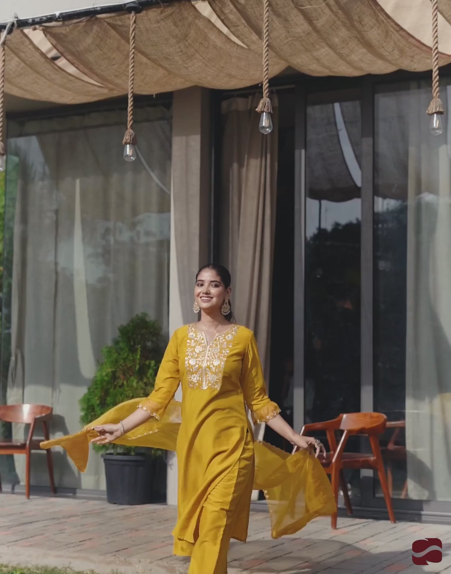 This Yellow Chinnon Silk kurta set is beautifully designed with Plain. The kurta features a V Neck and a graceful silhouette for an elegant appeal. It is paired with Pant With Pocket and a matching dupatta, making it a complete kurta set. Perfect for Semi-formal Wear, this ethnic wear for women offers soft & breathable fabric, ease of movement, and timeless charm. Made in India, Lightweight Fabric, Graceful Silhouette.